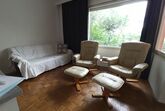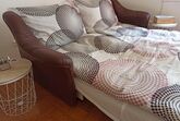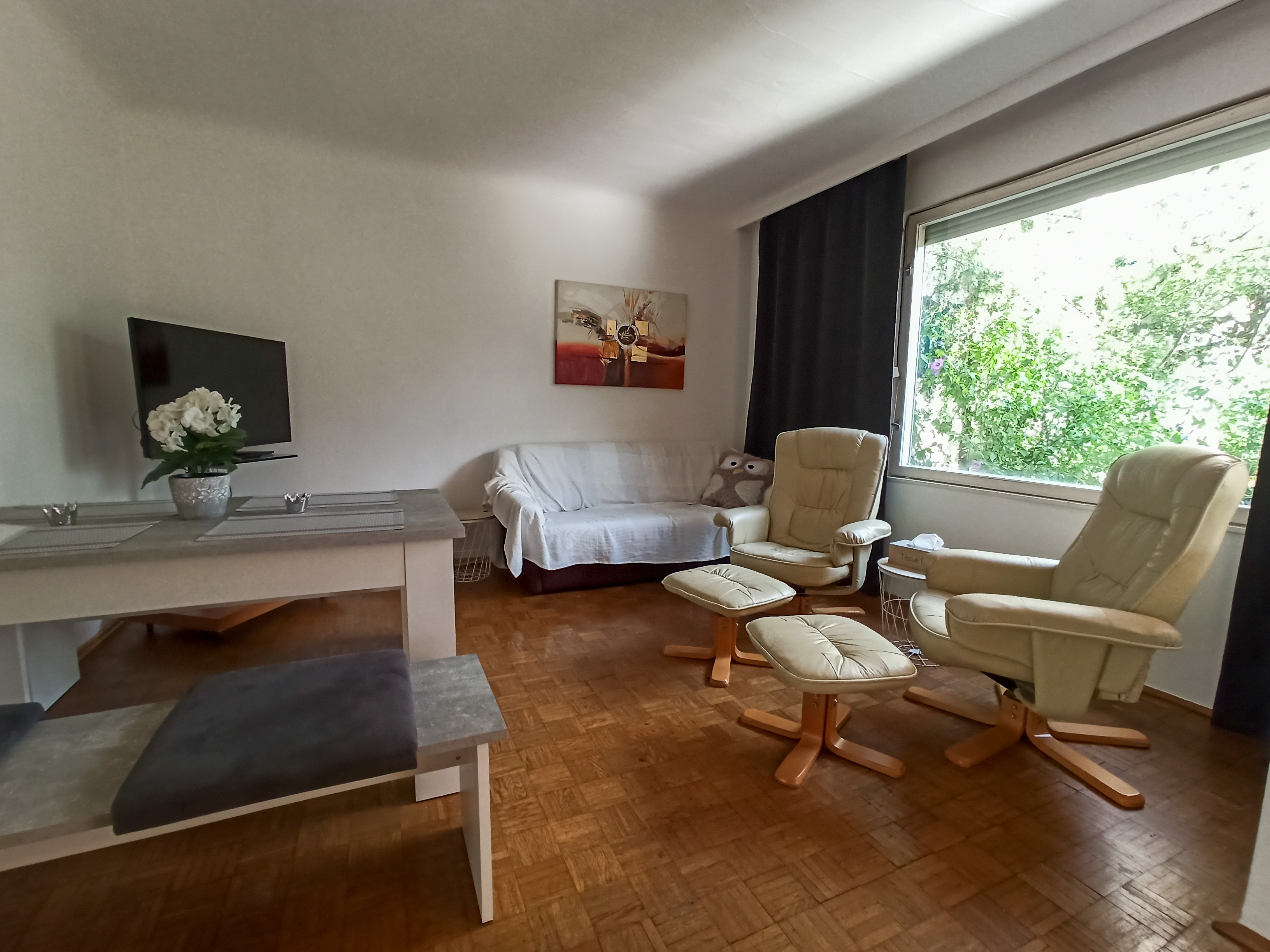 Im Wohnzimmer befindet sich eine ausziehbare Couch und bequeme Sesseln. Der Fernseher verfügt über Satelliten TV.