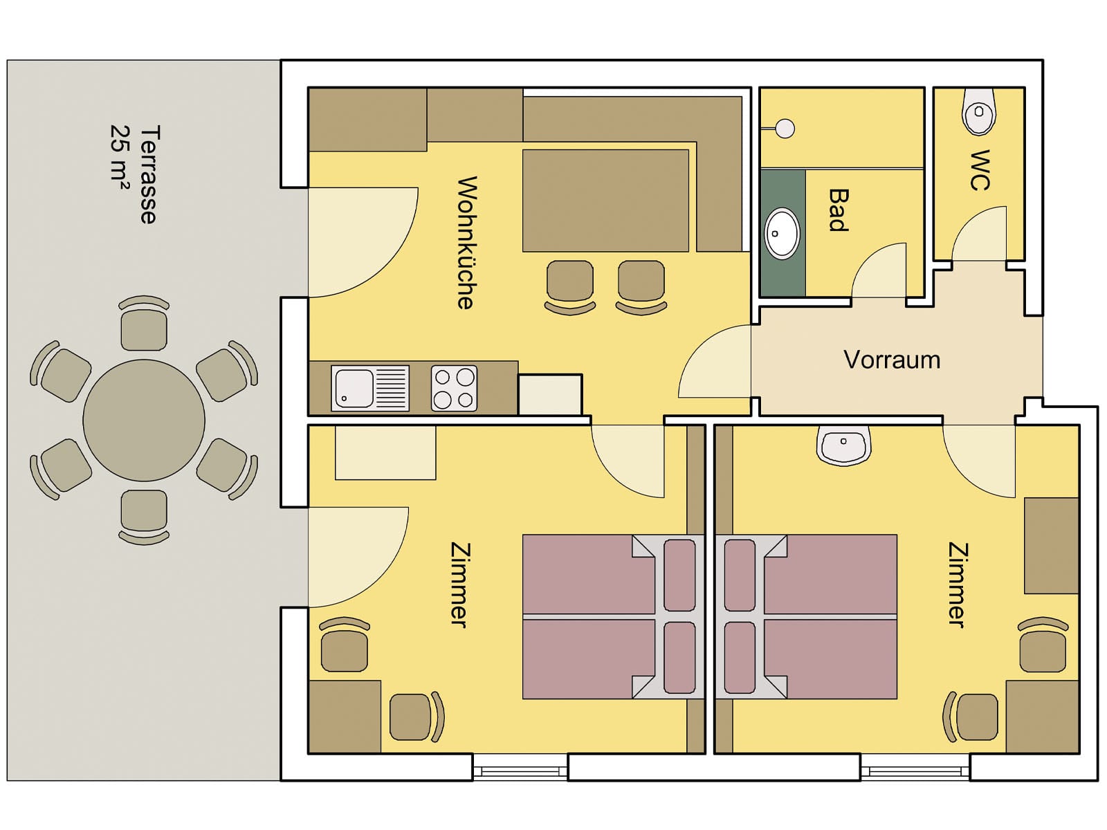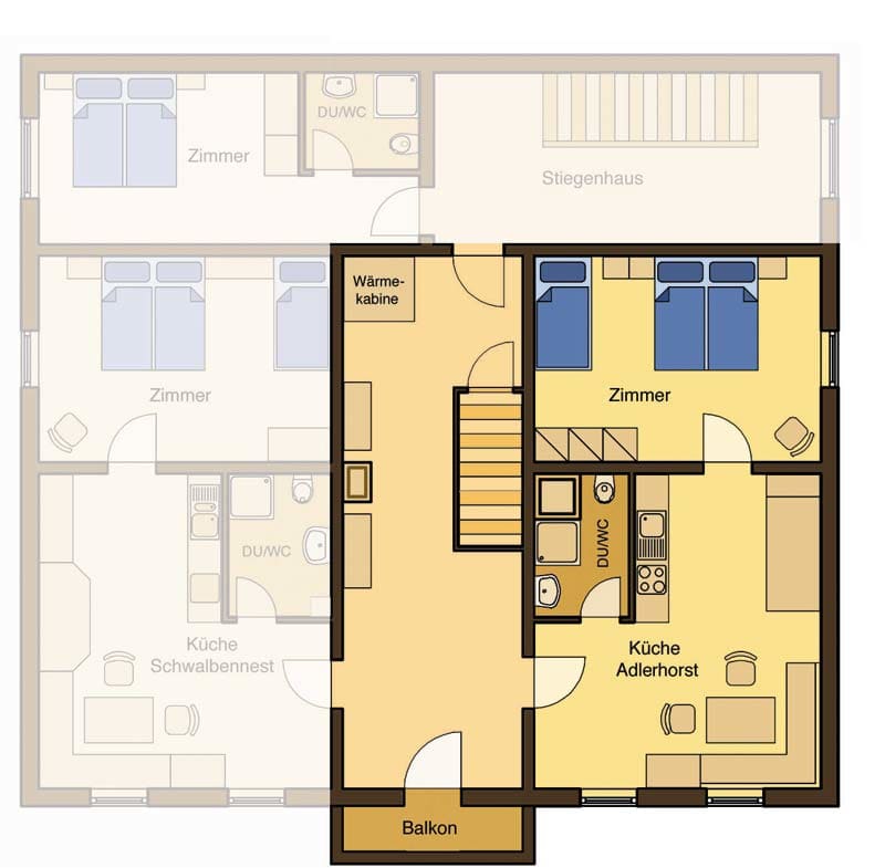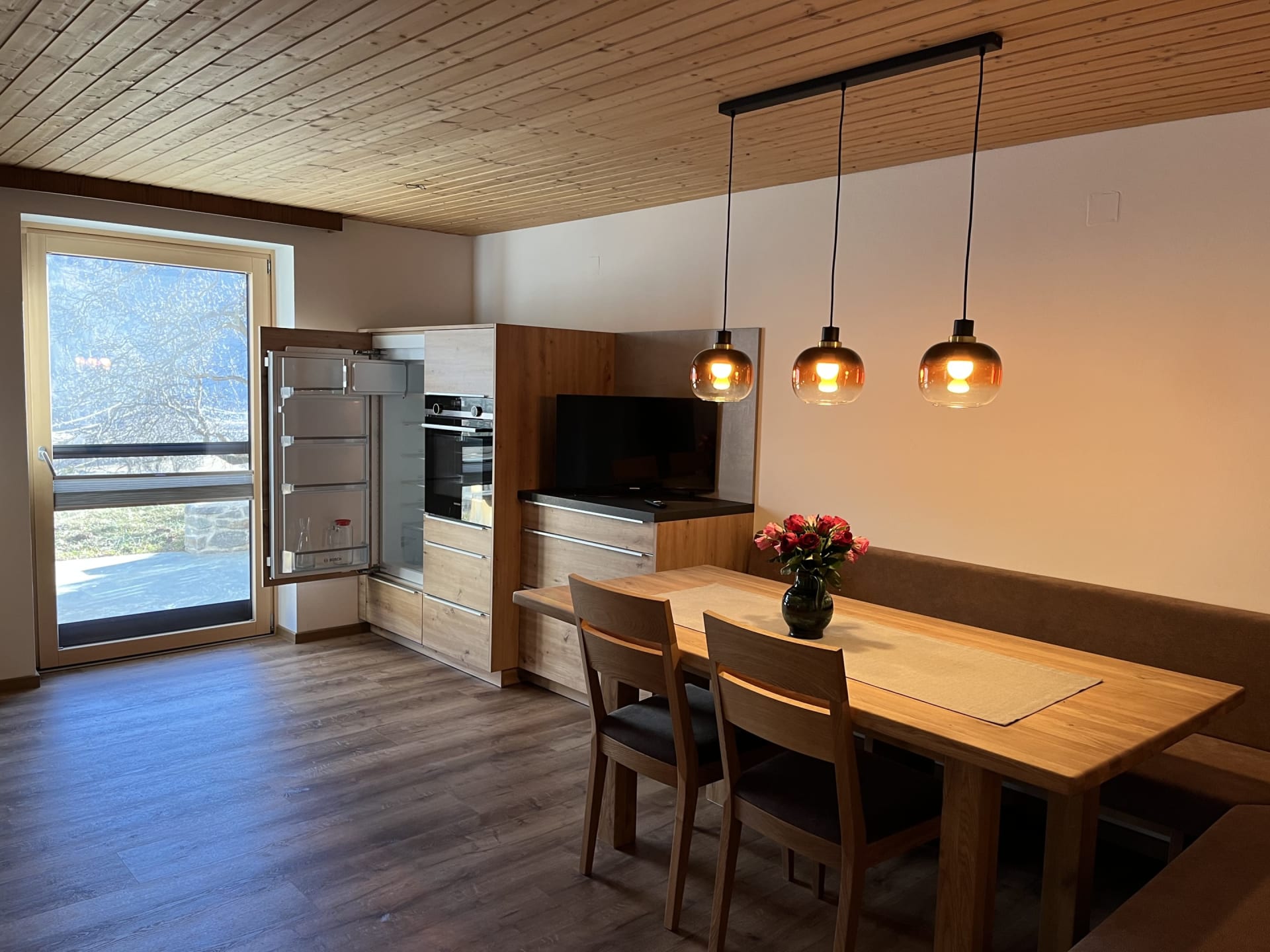 Die Wohnung Murmelebau - Nichtraucherwohnung für 4 Personen im Ferienhaus besteht aus einer großen, gemütlich eingerichteten Wohnküche mit SAT/TV und Zugang zur großen Terrasse (25 m2) , 2 Doppelzimmer mit Zirbenbetten, ein Bad mit Föhn, Schminkspiegel, einer barrierefreien Dusche, ein separates WC und einem kurzen Flur.