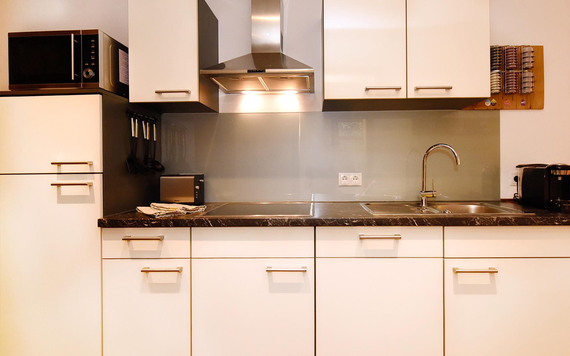 Top ausgestatteter Küchenblock: Spülmaschine, Kühlschrank inkl. Gefrierfach, Wasserkocher, Kaffemaschine, Grillmikrowelle