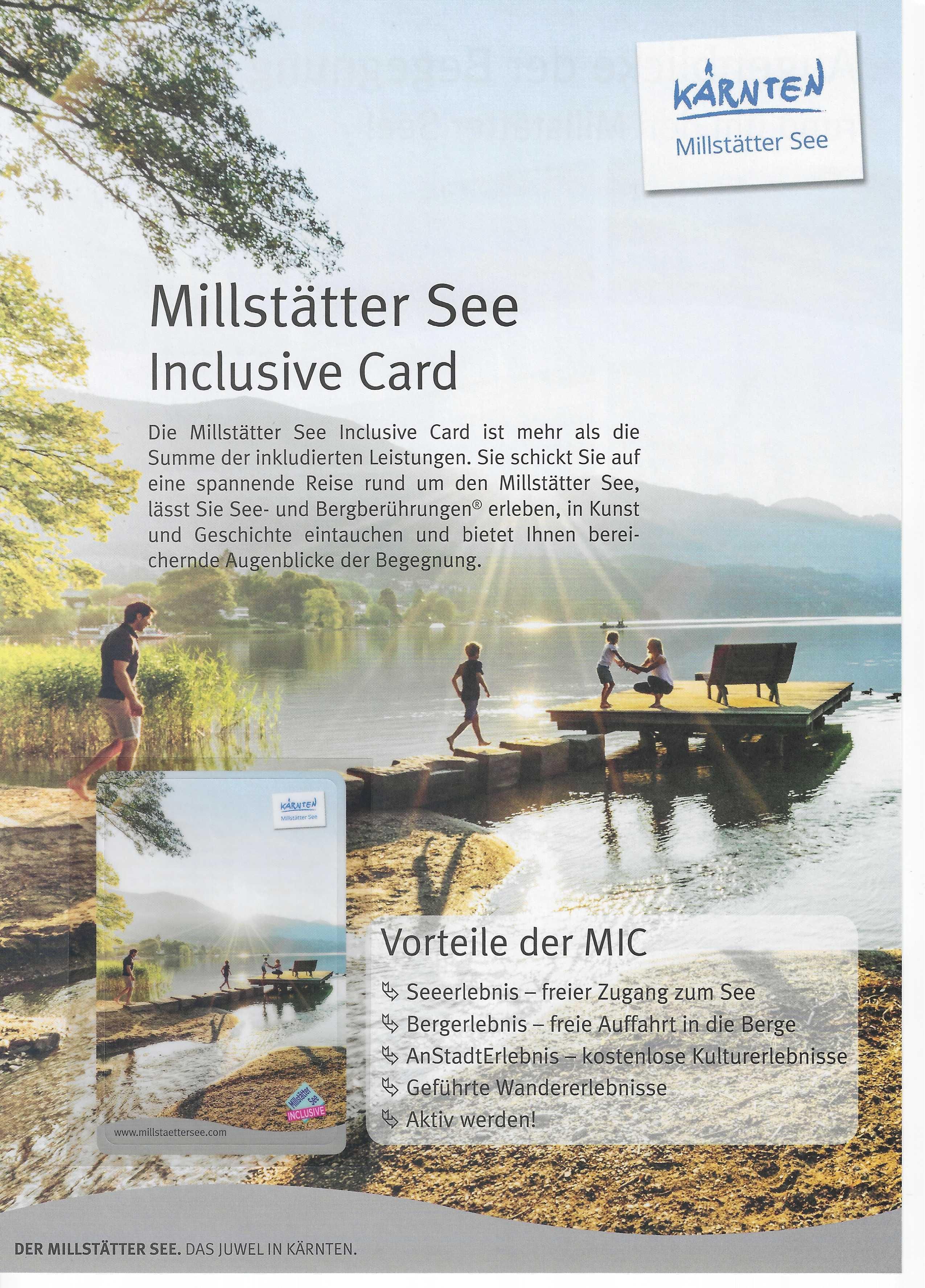 Während ihres Aufenhaltes erhalten Sie von uns die Millstätter See Inclusive Card gratis. Mit dieser Karte gibt für die Region viele verschiedene Vergünstigungen. Genaue Information erhalten Sie von uns bei ihrer Ankunft.