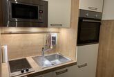 Zwei-Zimmer-Appartement für 2-3 Personen ca. 38 m2, Wohnschlafraum mit Sitzecke-Couchbett, Essplatz, Kochnische, kleiner Schlafraum mit 2 Einzelbetten, Bad/ WC, Balkon