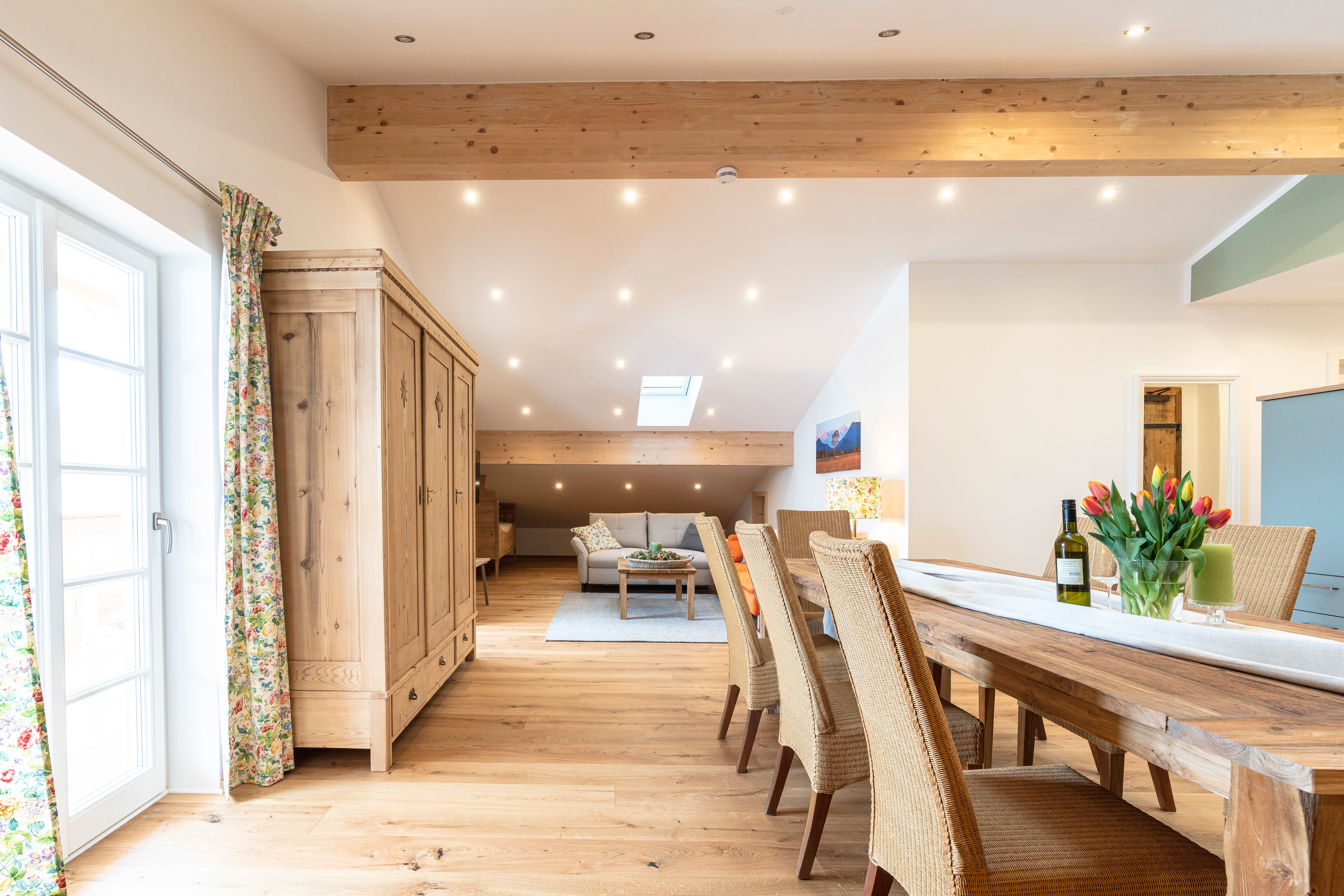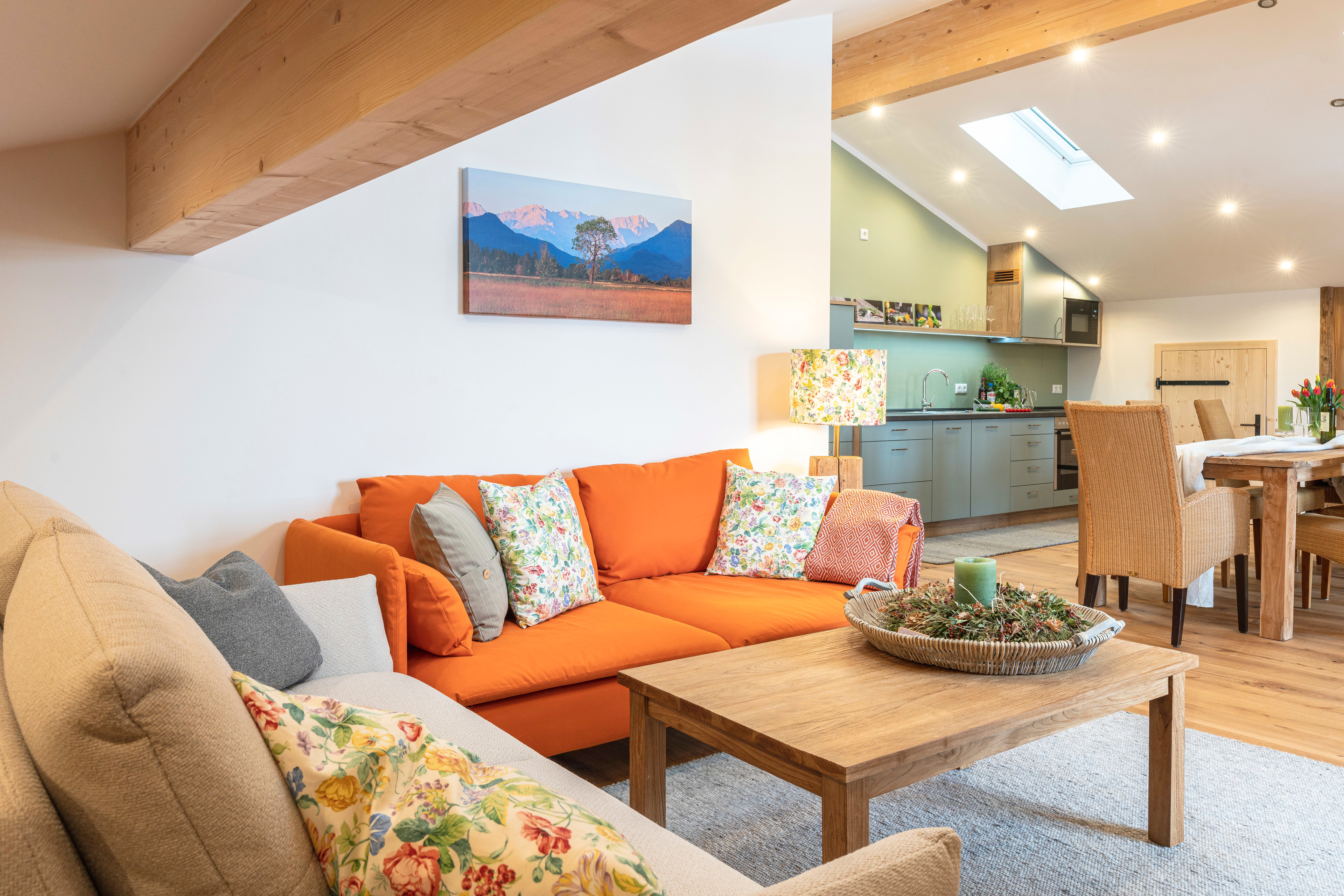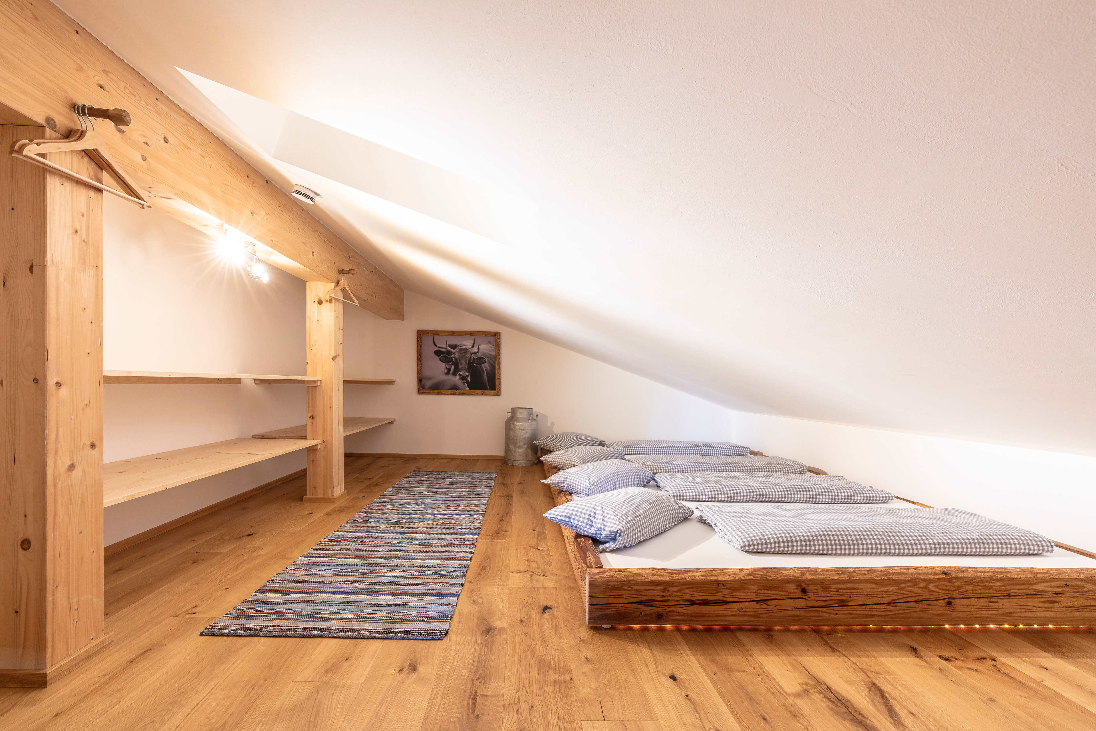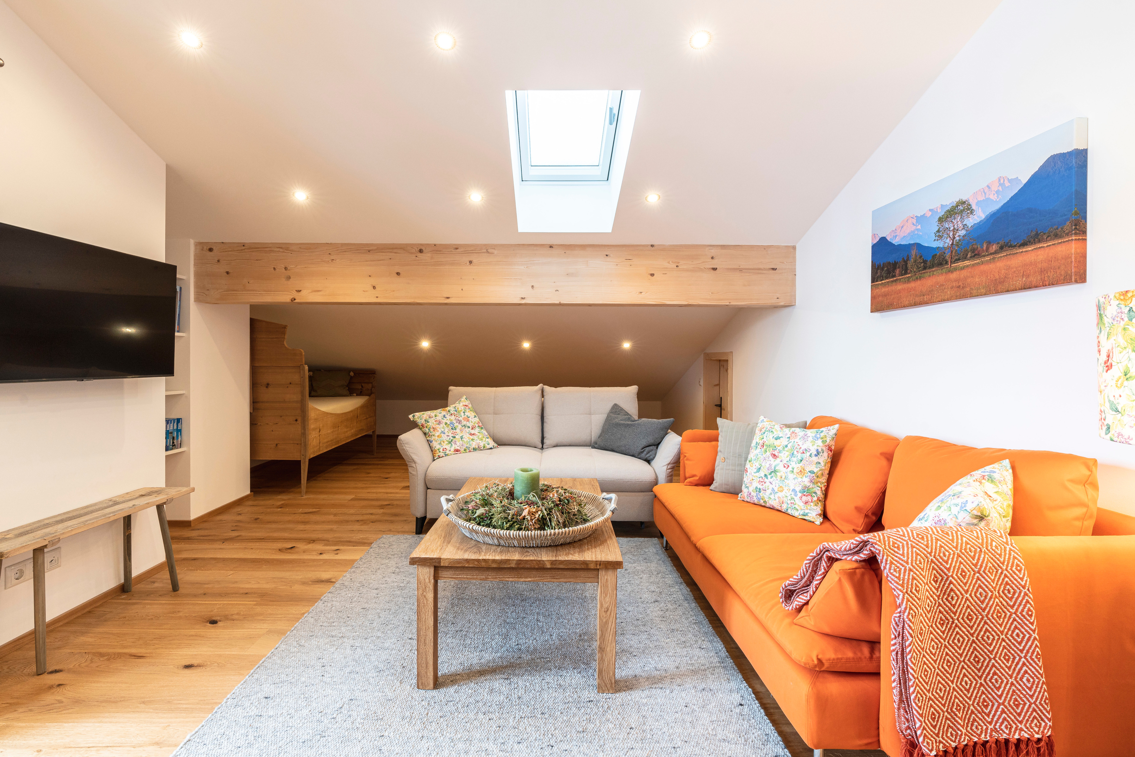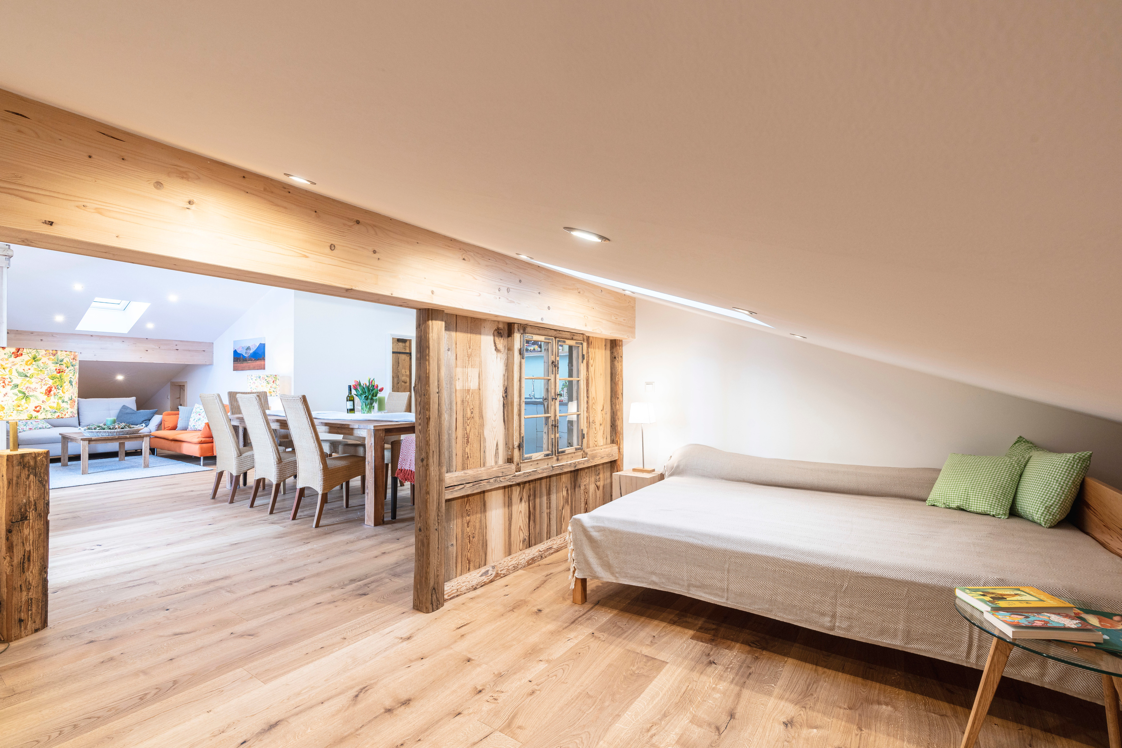 Zusätzlich Schlafplatz für 2 Personen bietet ein ausziehbares Sofa, sowie die Alm unter der Dachschräge - eine liebevoll aus Altholz angefertigte Matratzenstraße auf der weitere 4 Personen schlafen können.