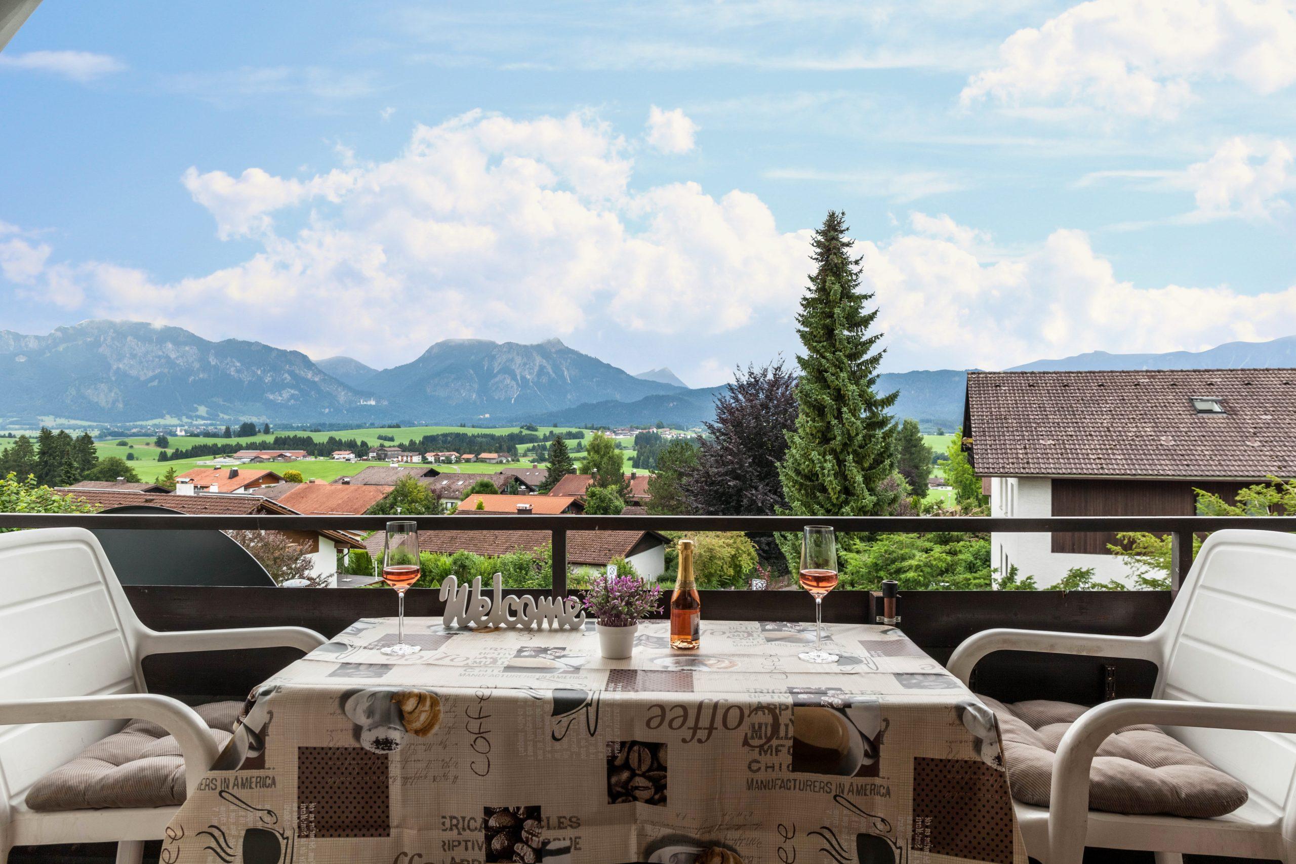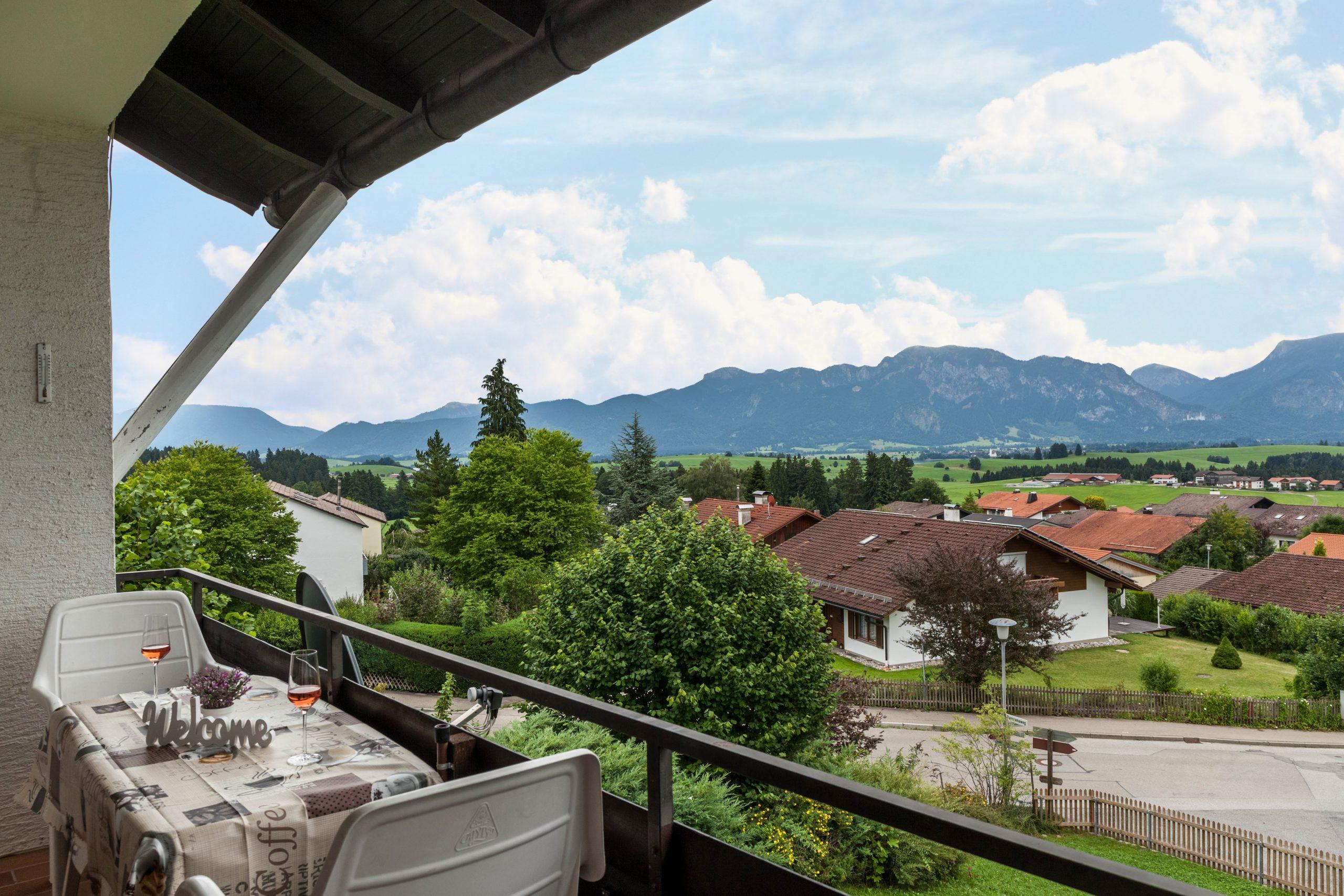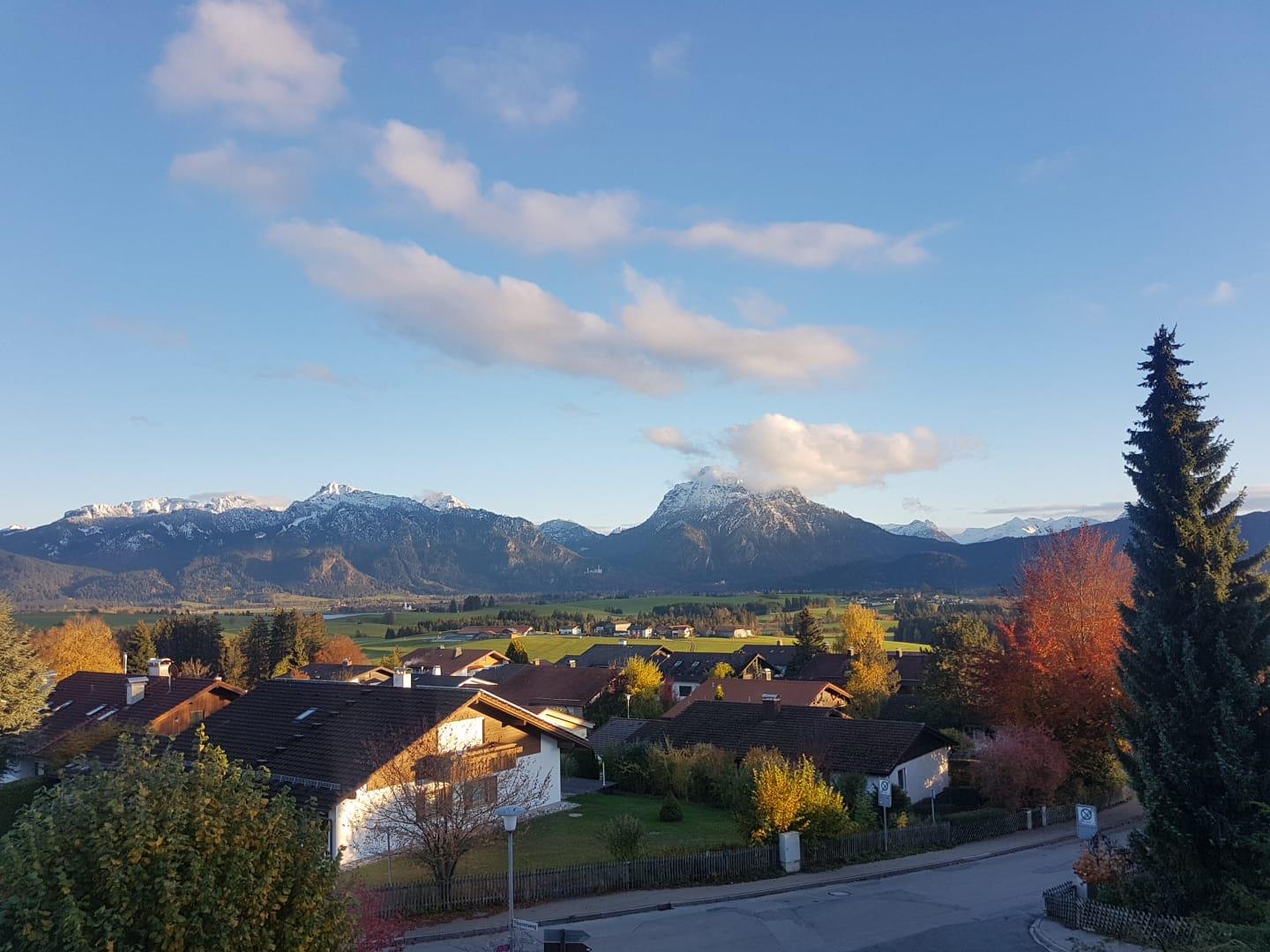 Die wunderschöne gr. 3 Zimmer Wohnung liegt im ersten Stock. Direkt vom Wohnzimmer und dem Schloßblickschlafzimmer haben Sie Zugang zu dem großen Süd Balkon der ihnen einen unvergesslichen Ausblick auf die königlichen Schlösser Neuschwanstein und Hohenschwangau , Hopfensee Forggensee sowie die gesamte Bergkette bietet.