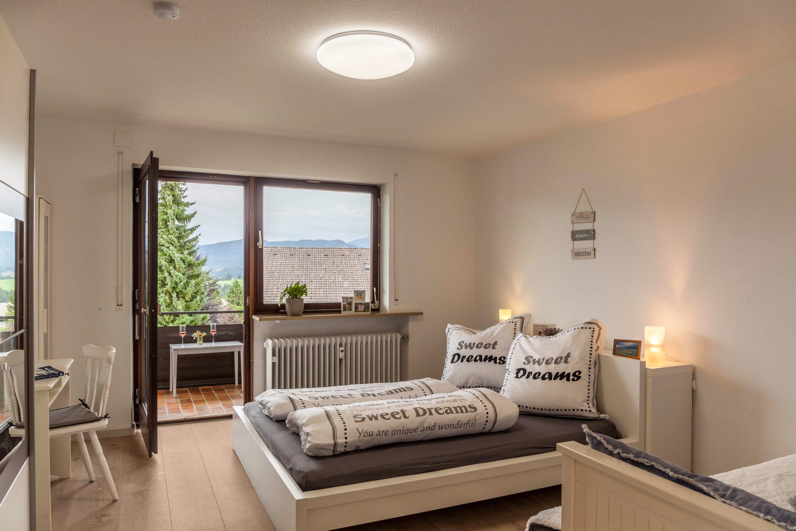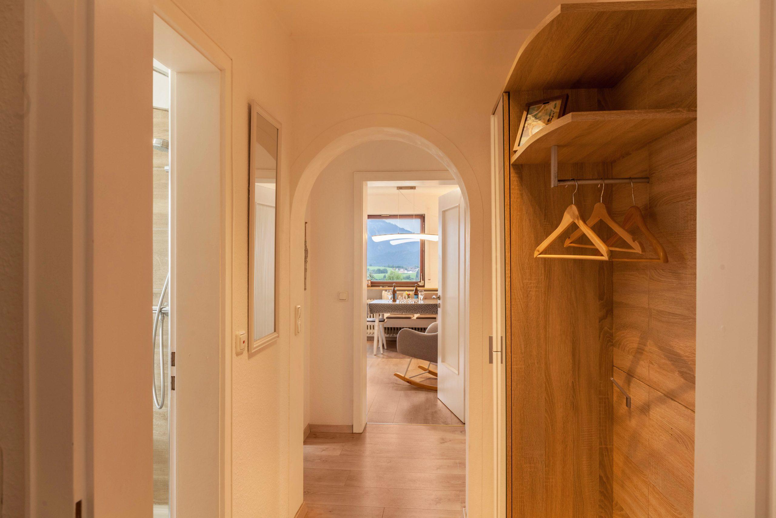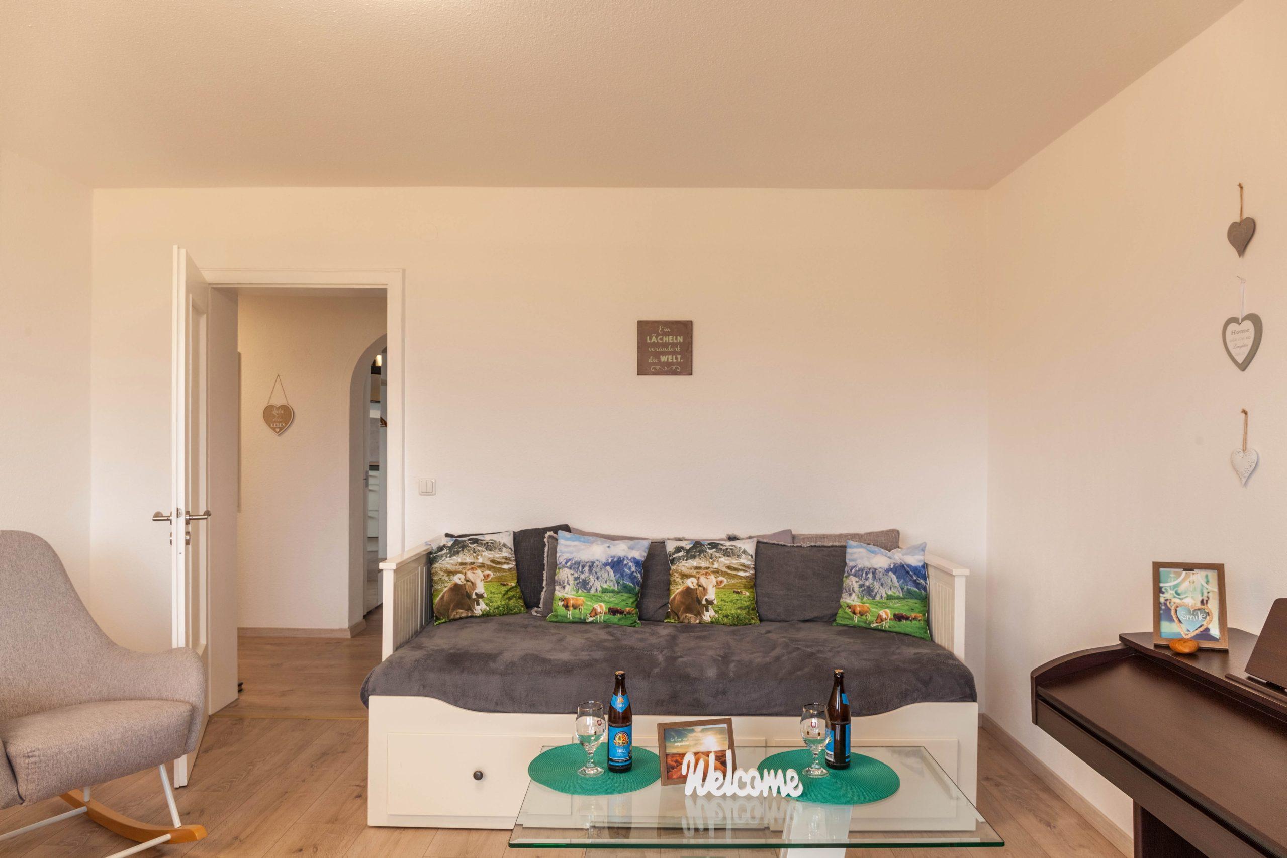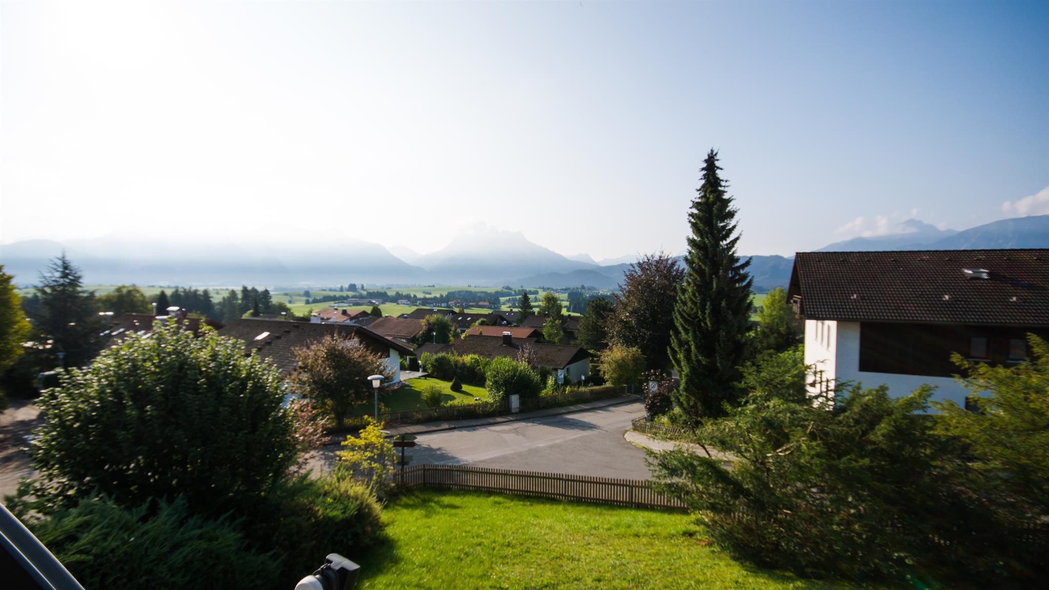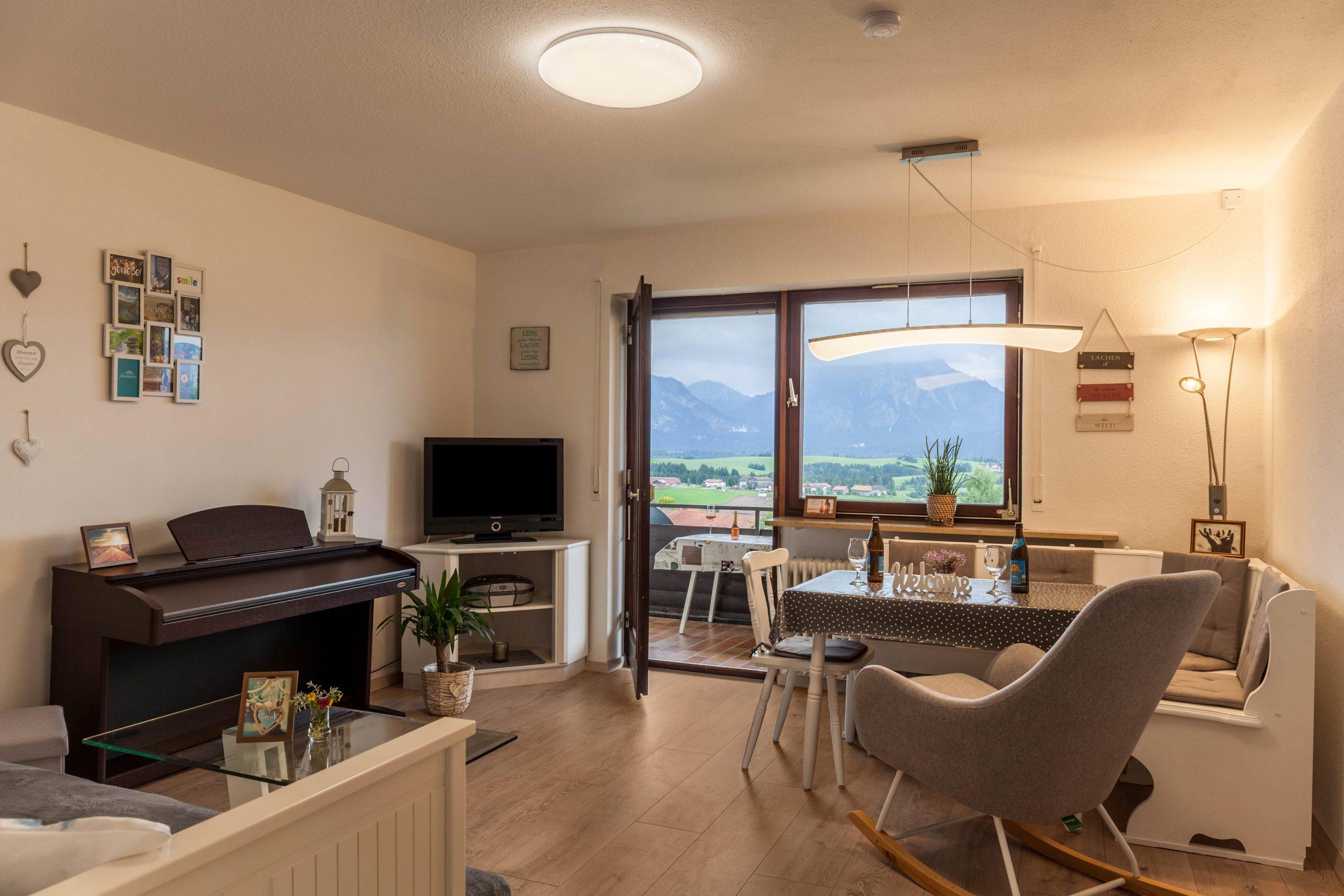 In der Wohnung werden die Gäste in einer angenehmen Atmosphäre empfangen. Es bietet komfortable Zimmer mit gigantischen Ausblick auf die Königsschlösser, Hopfen und den Forggensee sowie die Bergkette von Deutschland und Österreich