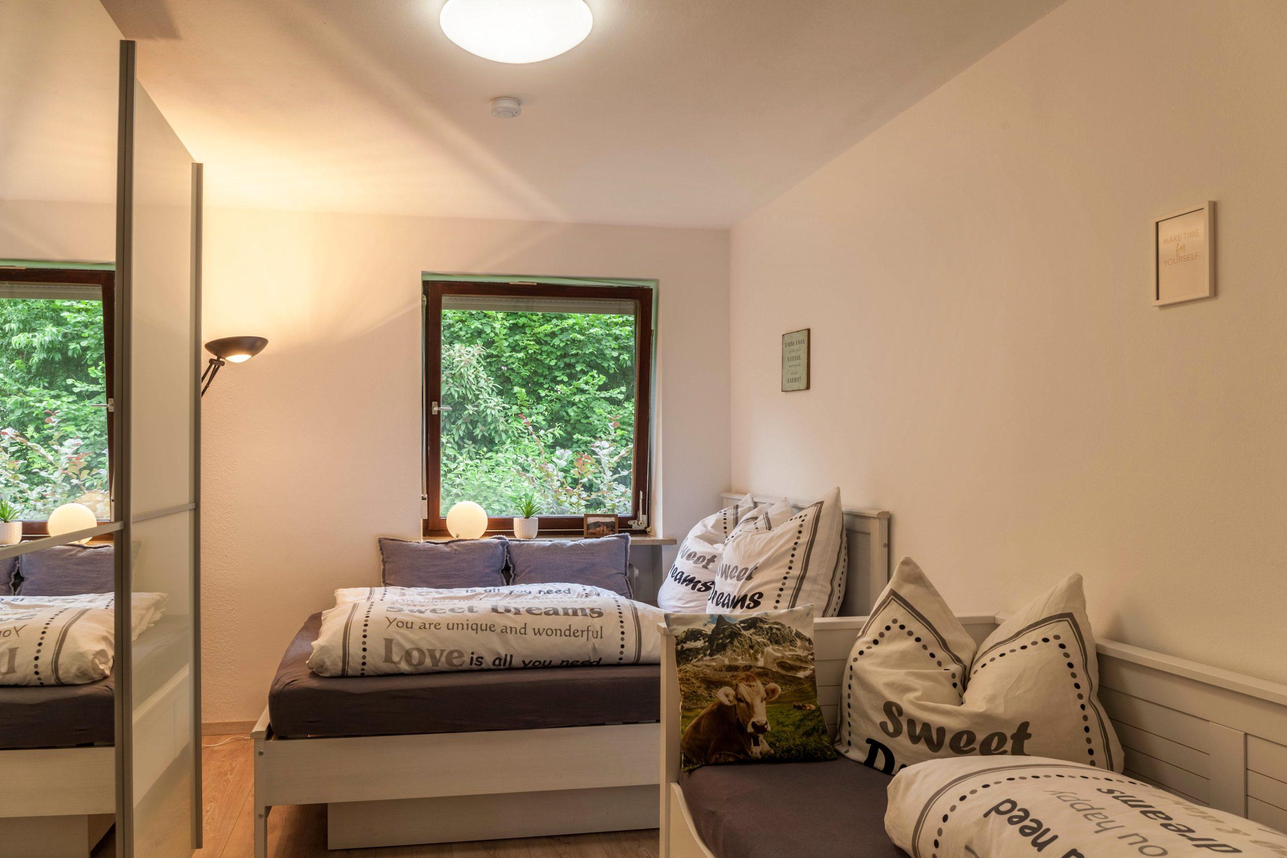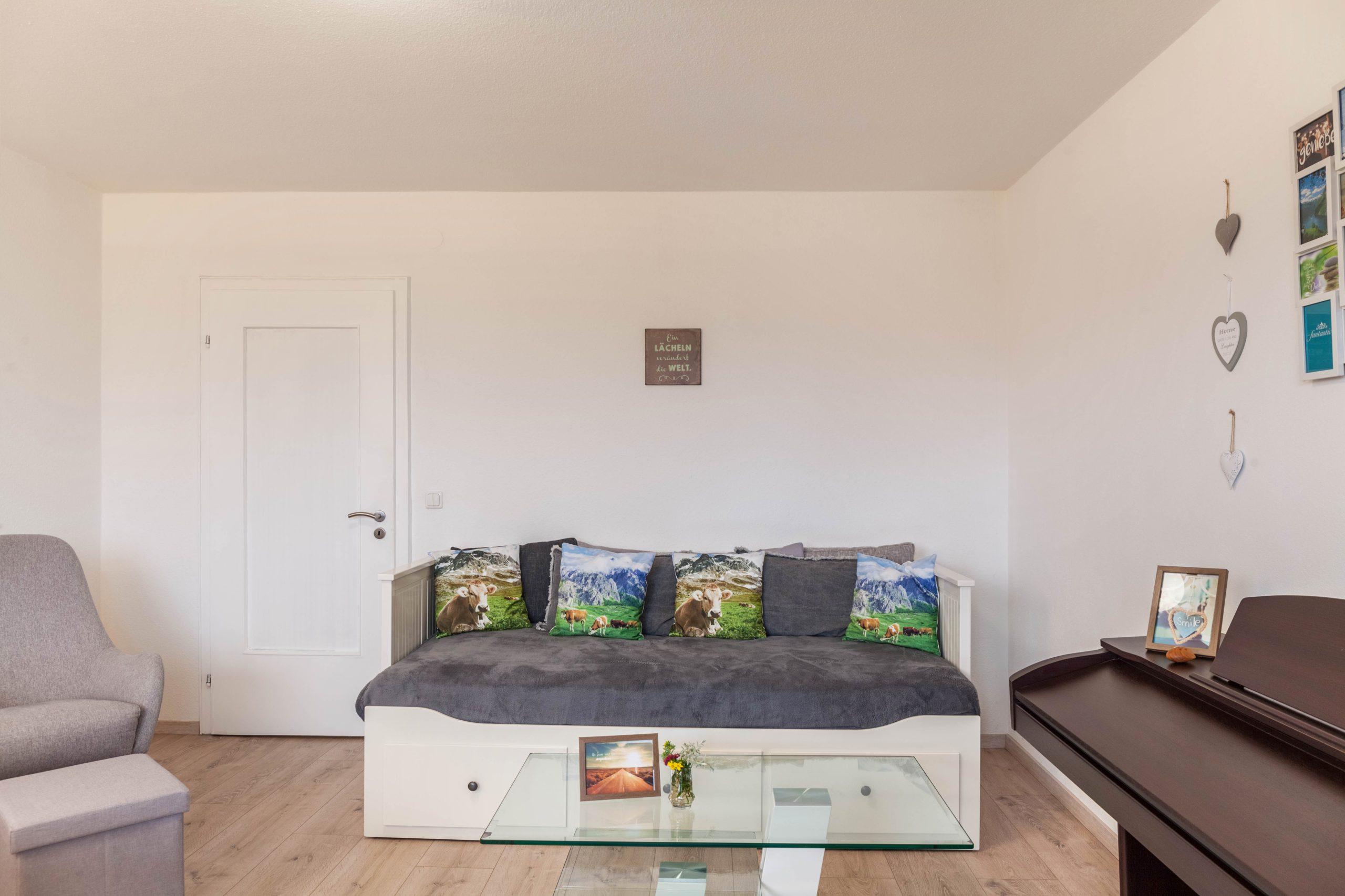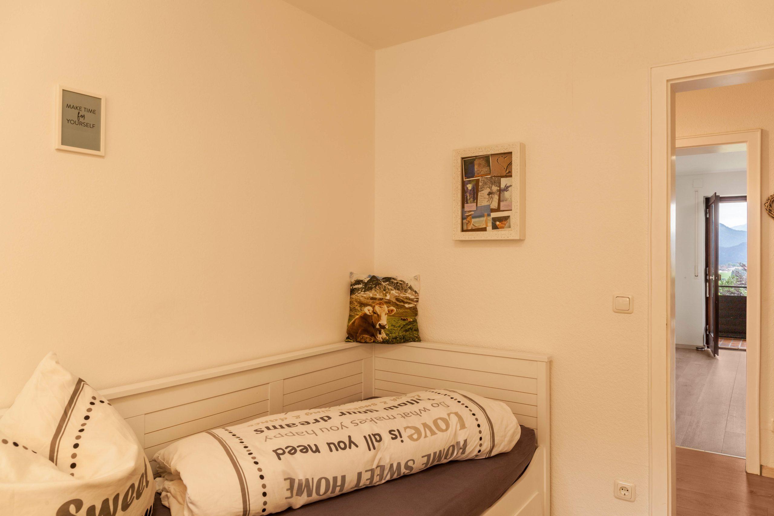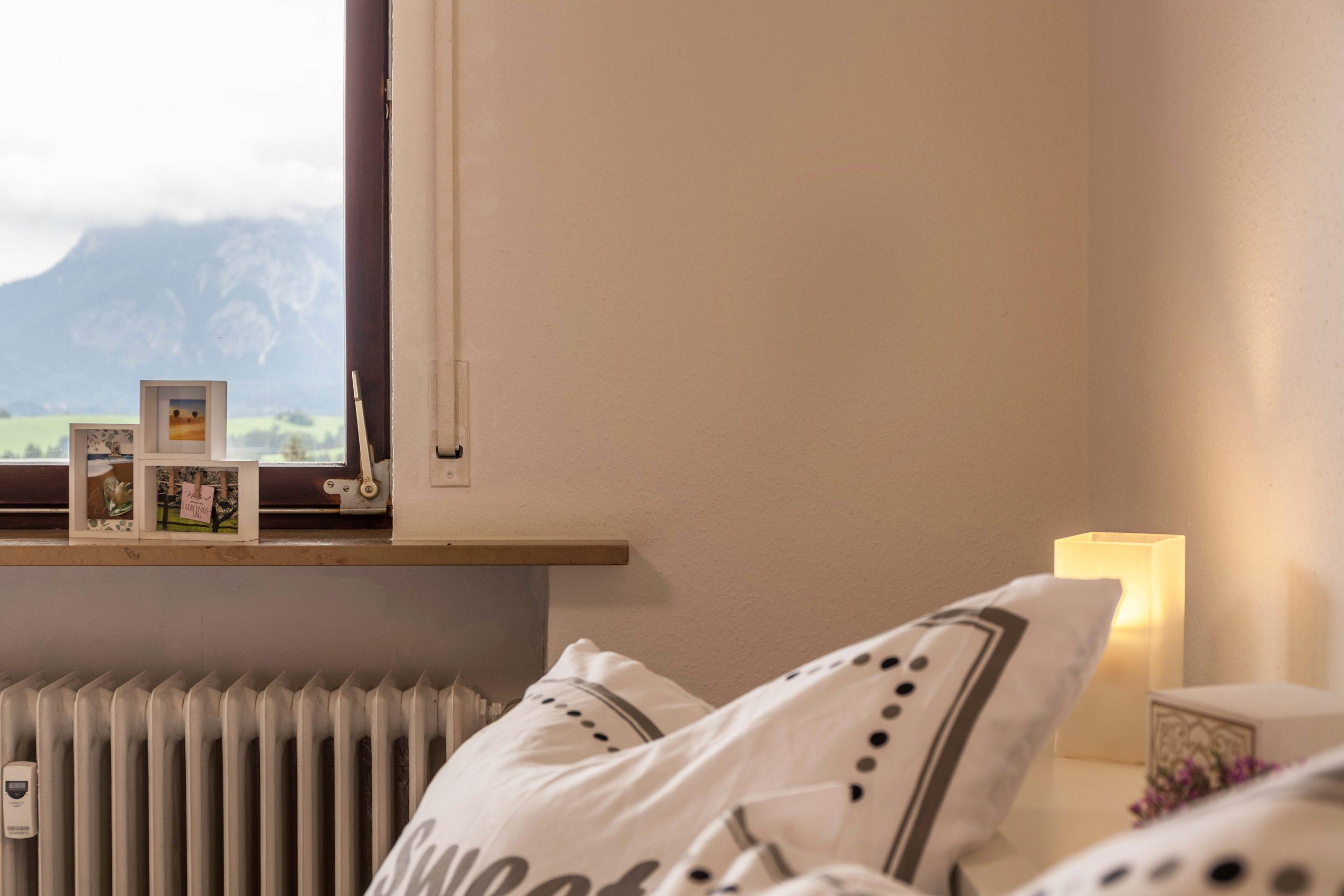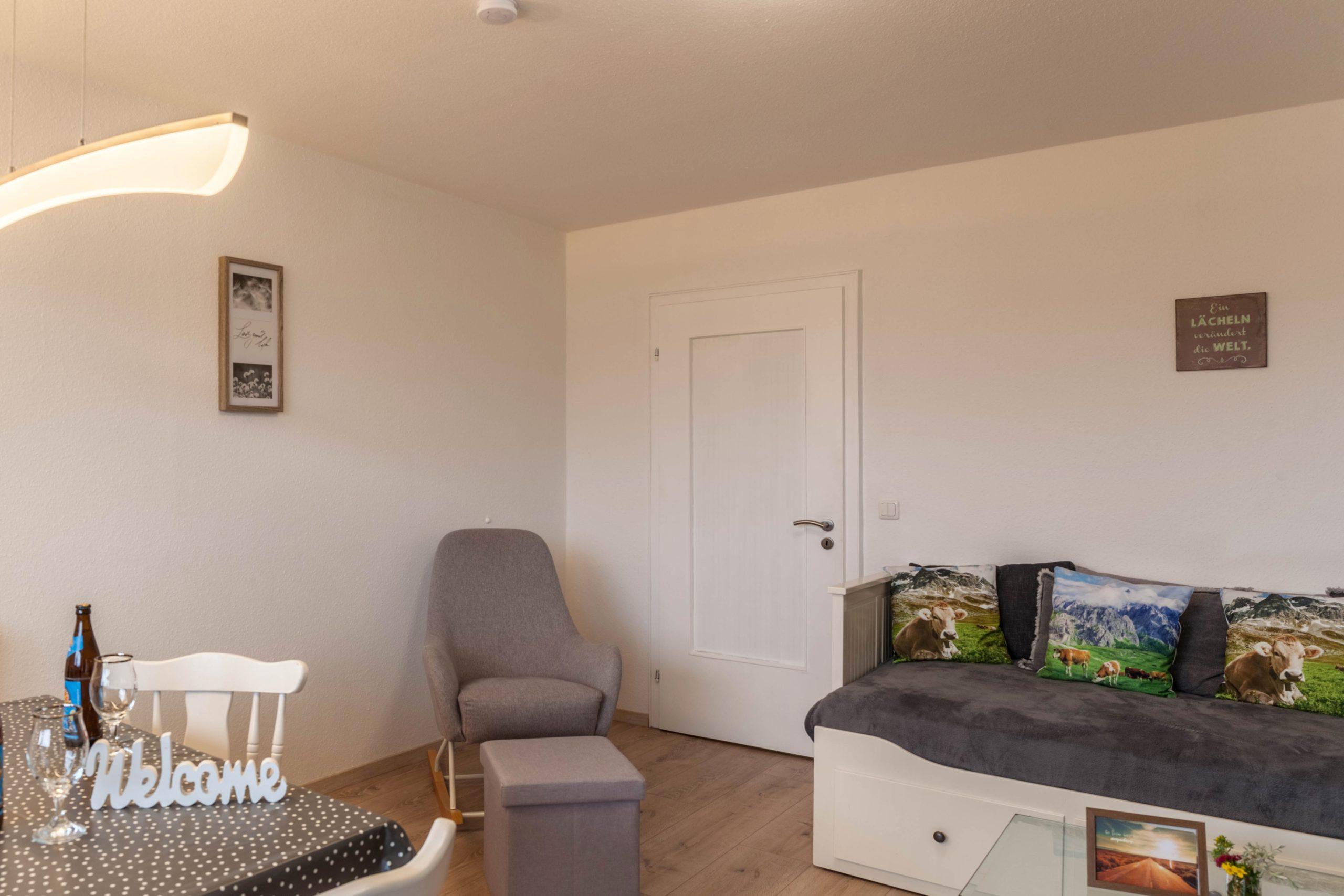 In der Wohnung werden die Gäste in einer angenehmen Atmosphäre empfangen. Es bietet komfortable Zimmer mit gigantischen Ausblick auf die Königsschlösser, Hopfen und den Forggensee sowie die Bergkette von Deutschland und Österreich