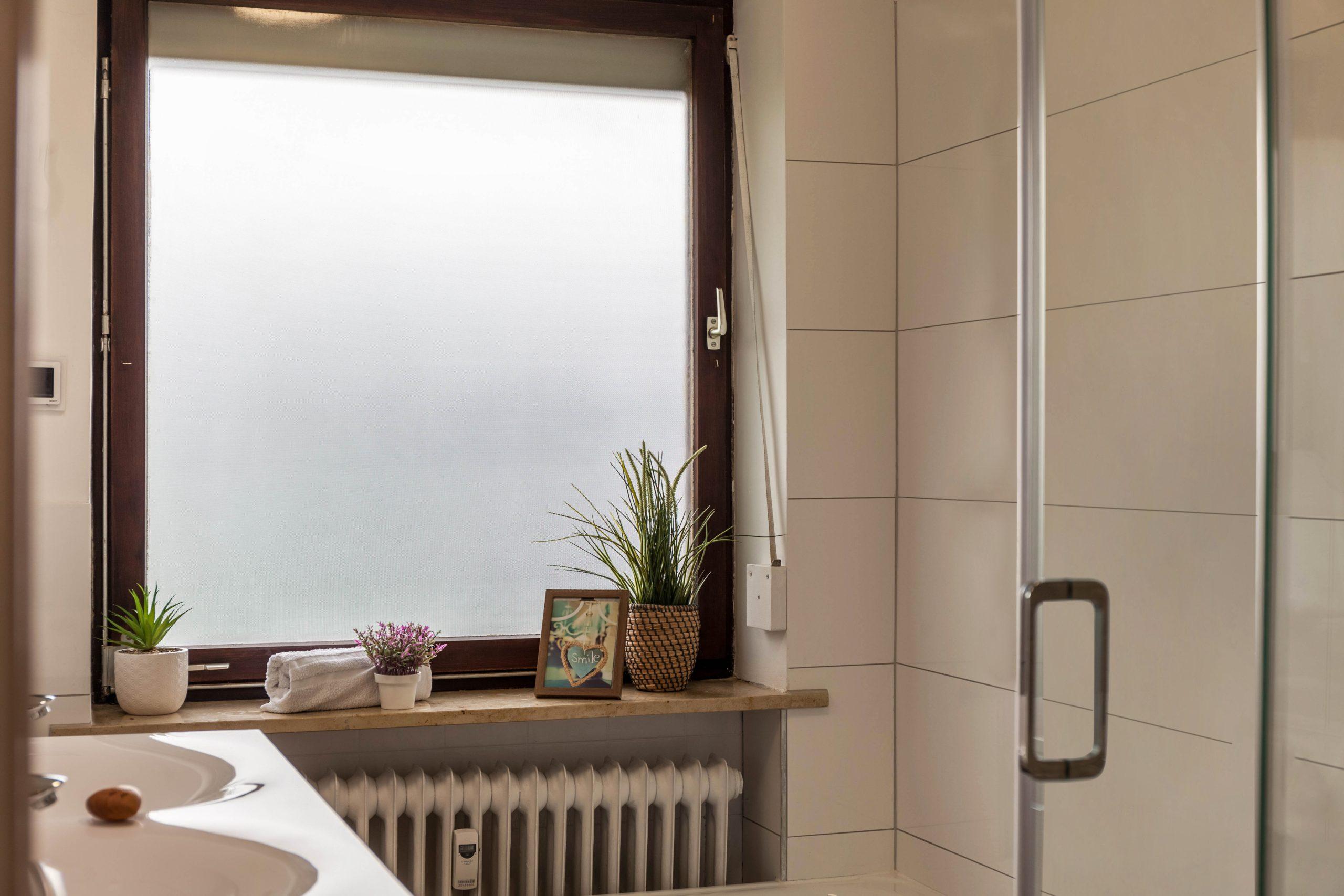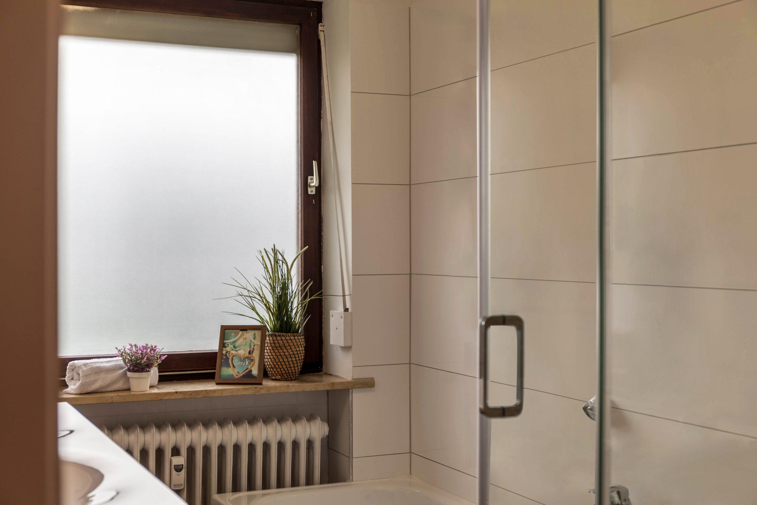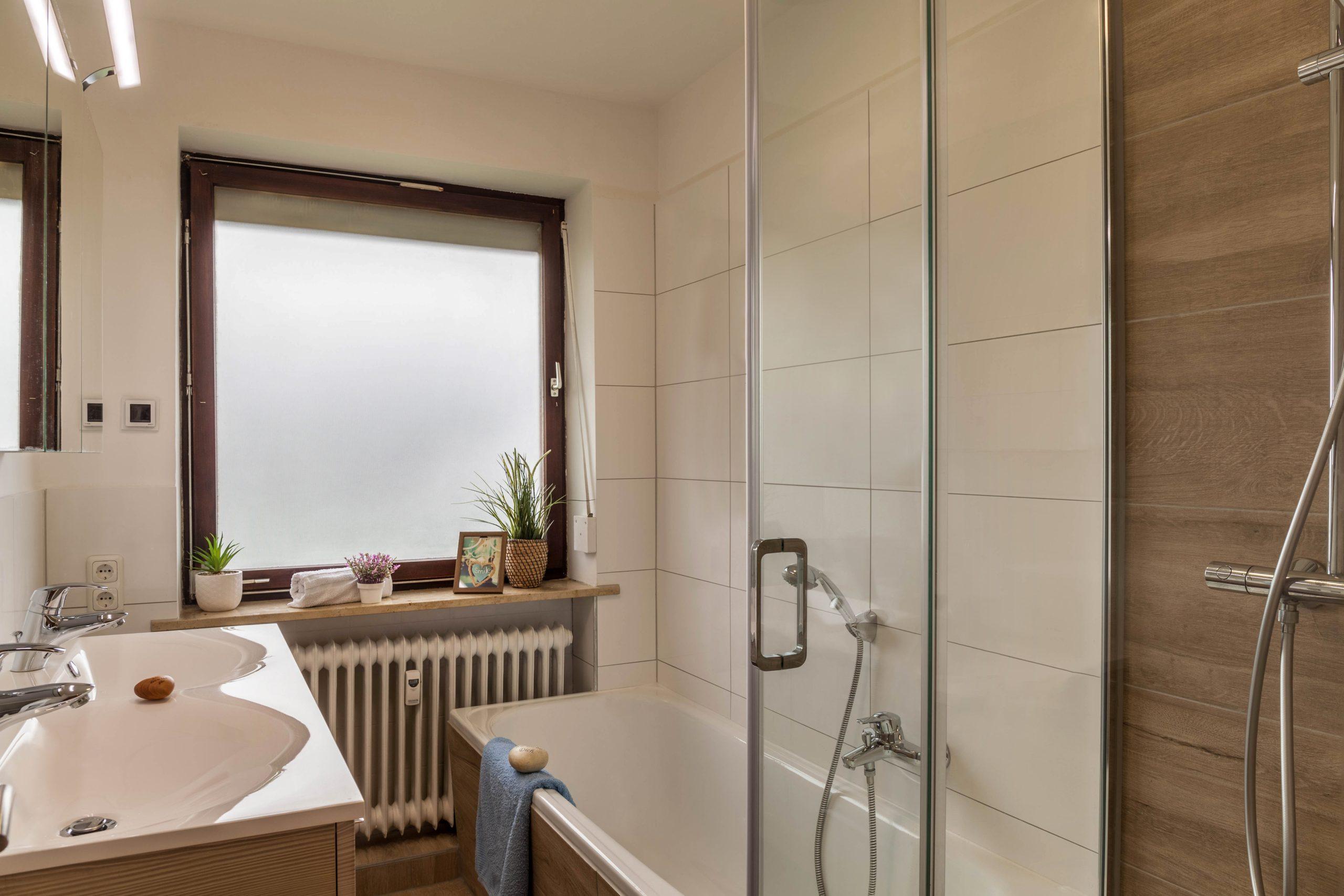 Das Bad verfügt über eine Dusche und und eine Badewanne mit Fußbodenheizung