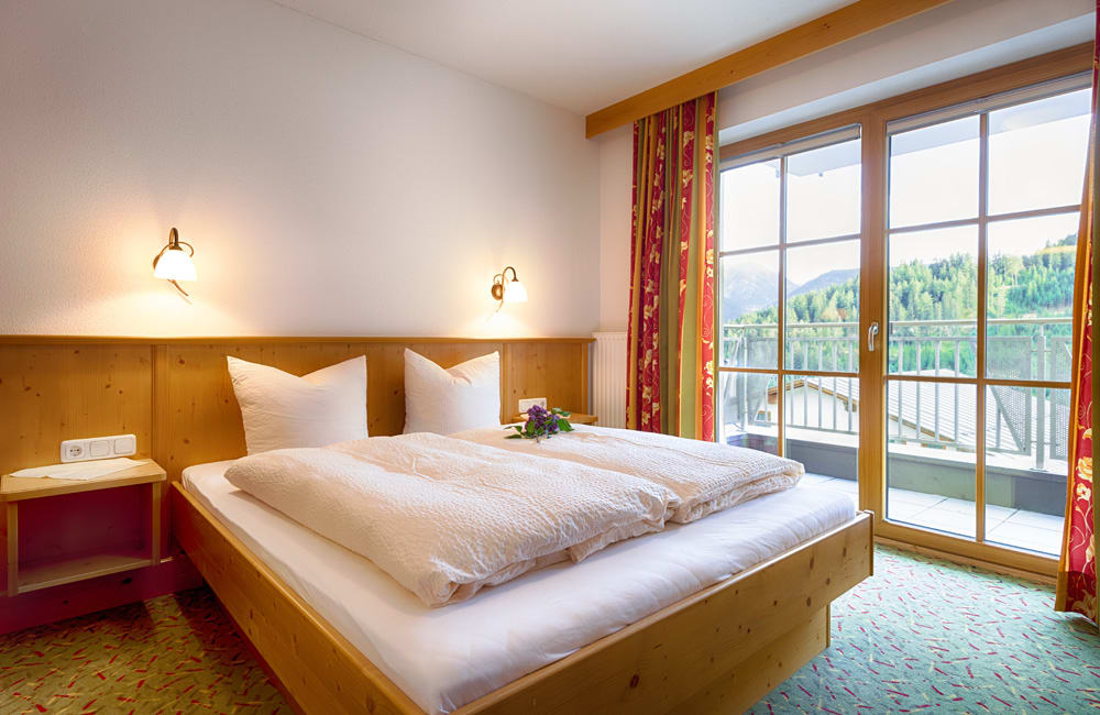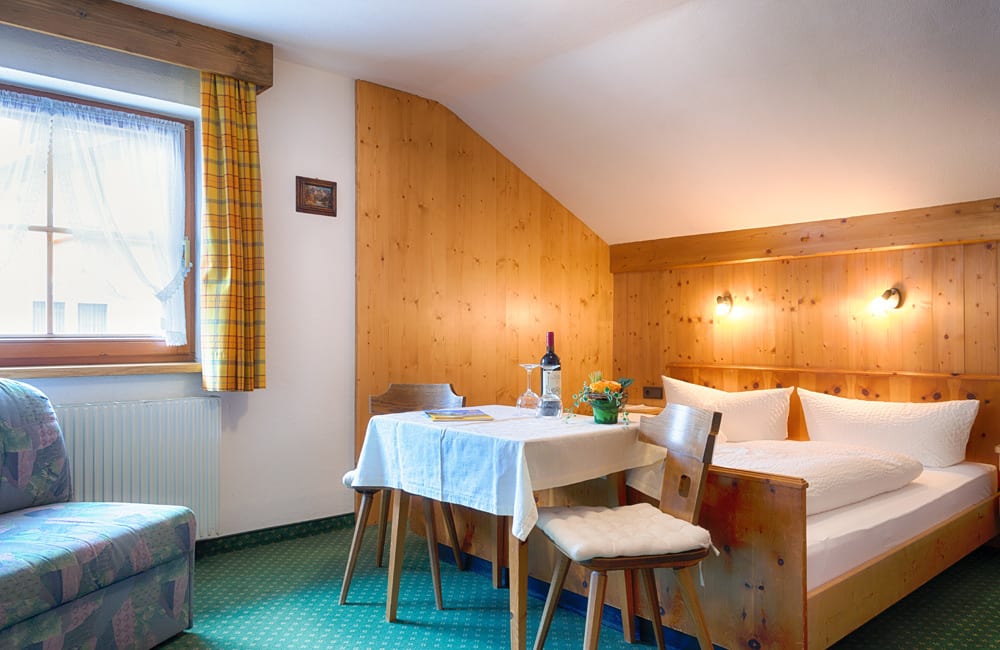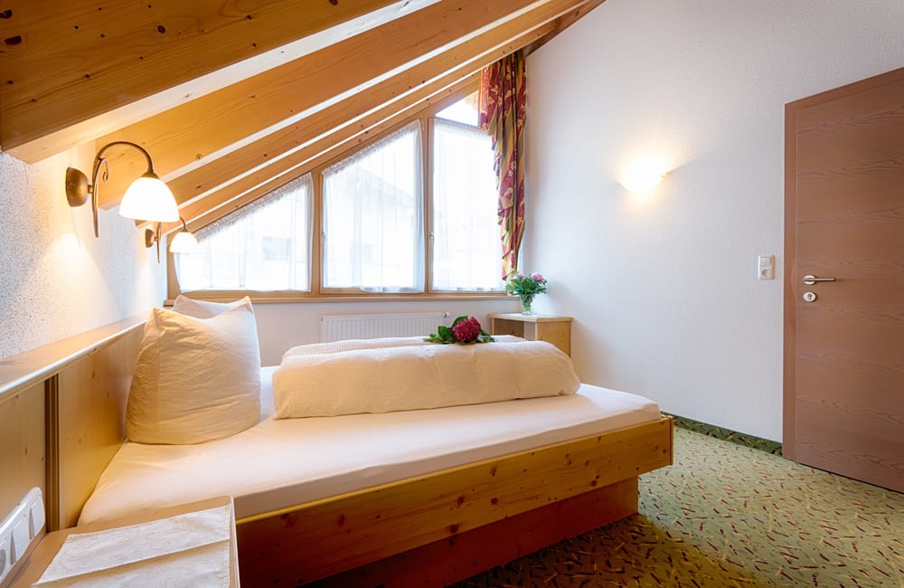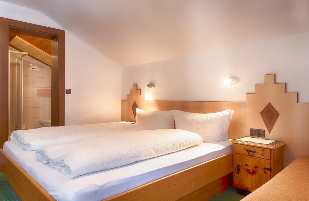 Ein gemütliches Einzelzimmer im rustikalen Tiroler Stil, ausgestattet mit traditionellen Holzmöbeln und warmen Farben. Der Südbalkon bietet einen herrlichen Blick auf die umliegende Bergwelt und lädt zum Entspannen in der Sonne ein. Ideal für einen erholsamen Aufenthalt in authentischer alpiner Atmosphäre.
