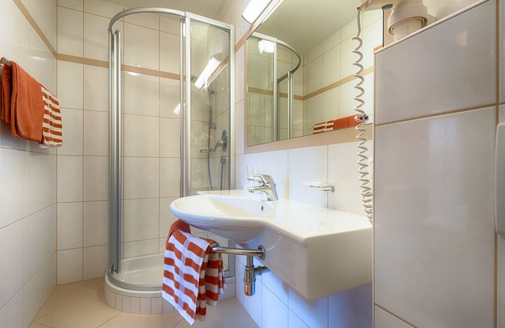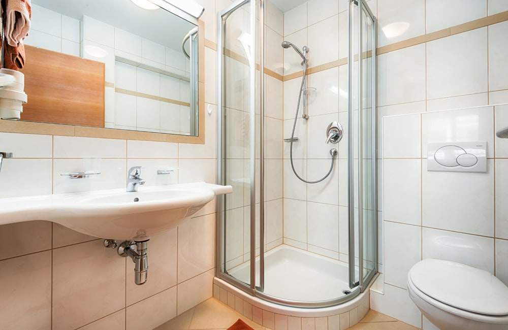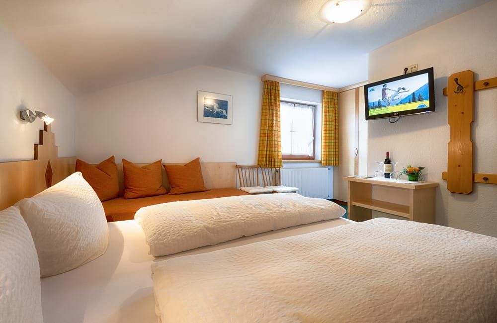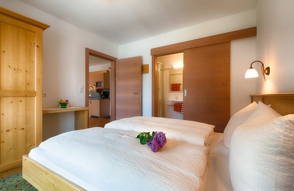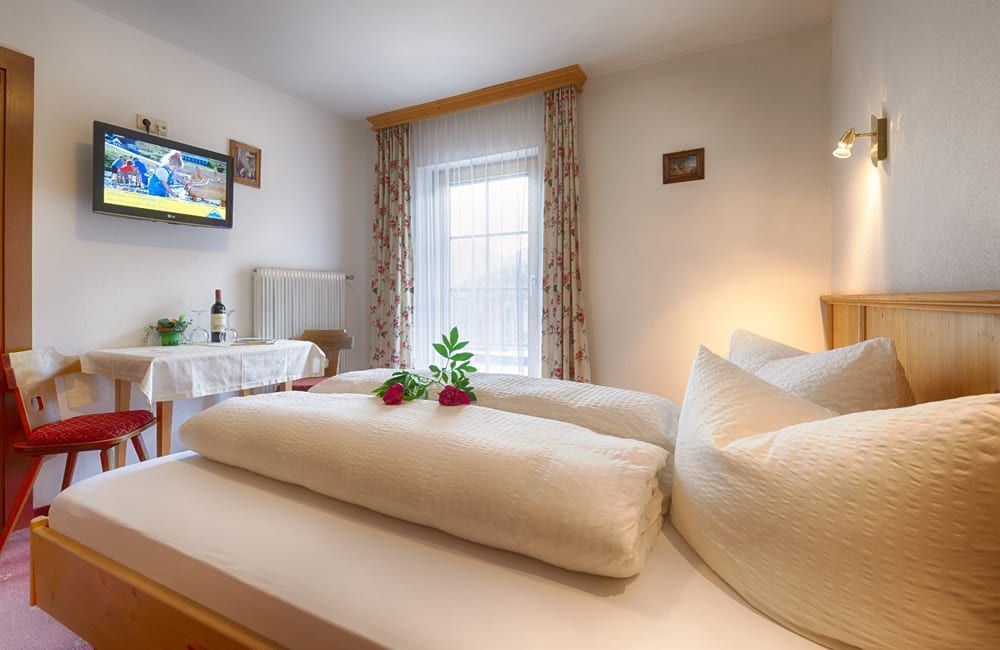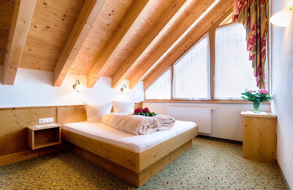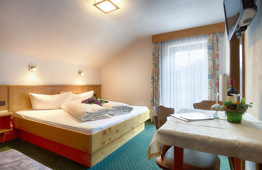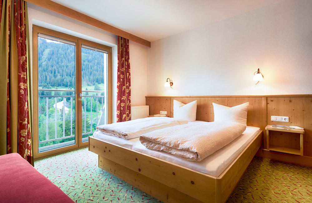 Helles Doppelzimmer im modernen Tiroler Stil und mit natürlichen Materialien ausgestattet. Warme Holzelemente und viel Liebe zum Detail sorgen für eine behagliche Atmosphäre. Vom Südbalkon aus genießen Sie einen herrlichen Ausblick auf die beeindruckende Bergkulisse – perfekt für einen erholsamen Urlaub.