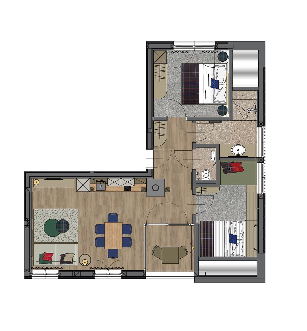 Das gemütliche Appartement Kärnten Karo im 2.Stock mit Mansarde und Akzenten mit dem Kärnten Karo vom Rettl bietet bequem Platz für 4-6 Personen. Auf ca. 60 m² Wohnfläche mit 2 getrennten Schlafräumen, einem gemütlichen Wohn- Schlafraum, einer top ausgestatteten Küche, einem Bad mit separatem WC und einer Loggia, kannst du den Alltagsstress vergessen.