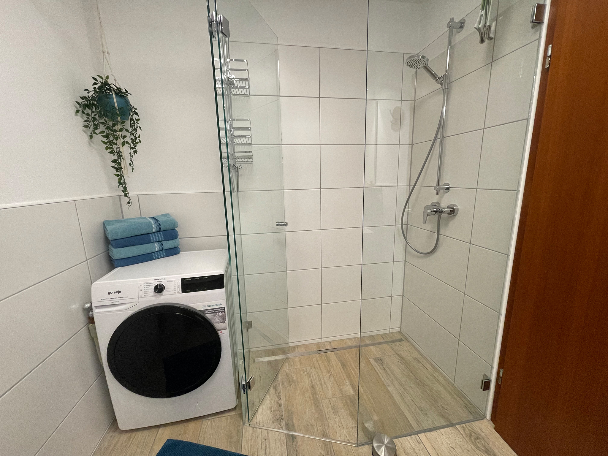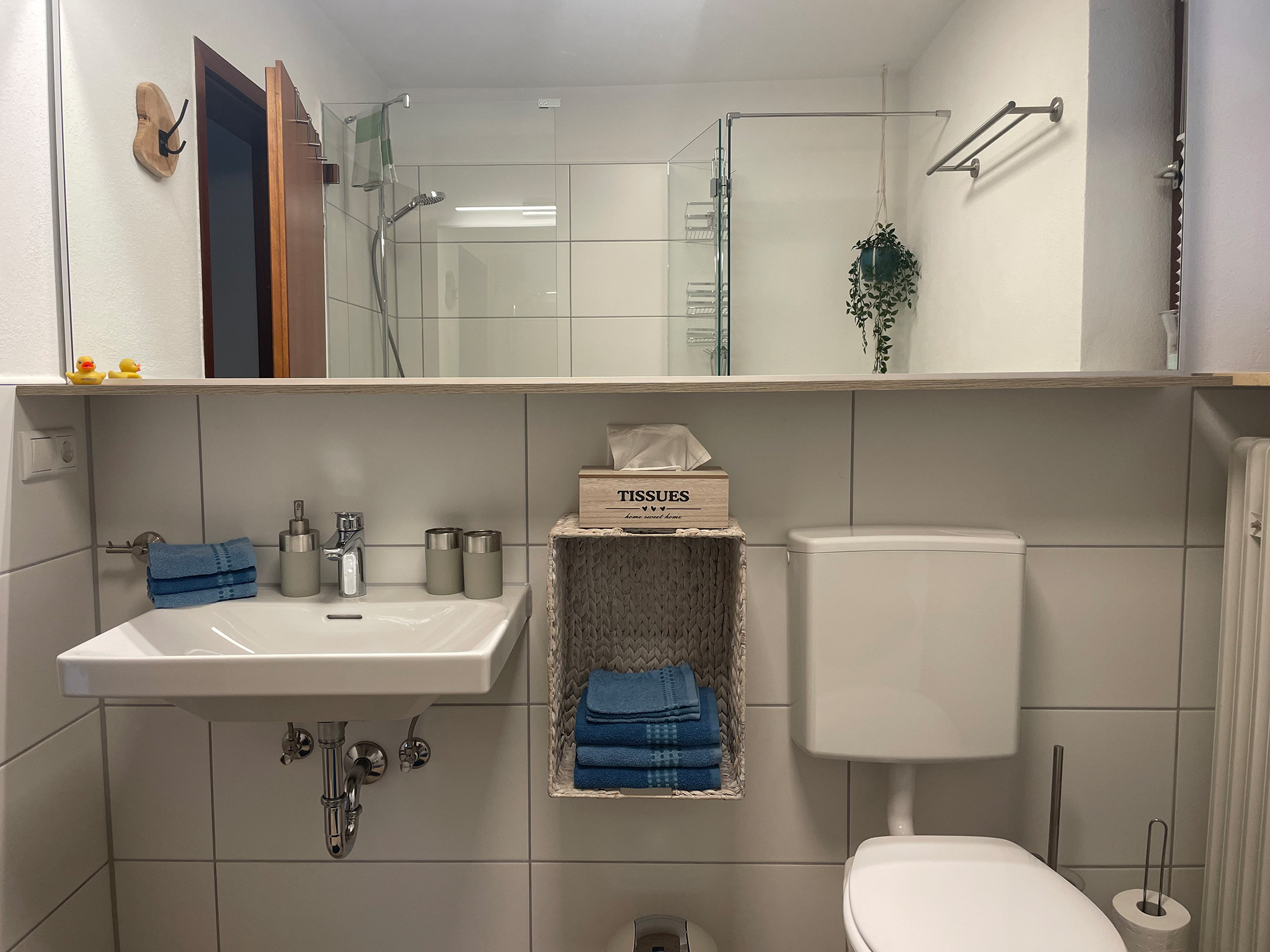 Im Eingangsbereich gibt es eine Sitzbank, Schuhlöffel und Garderobe.