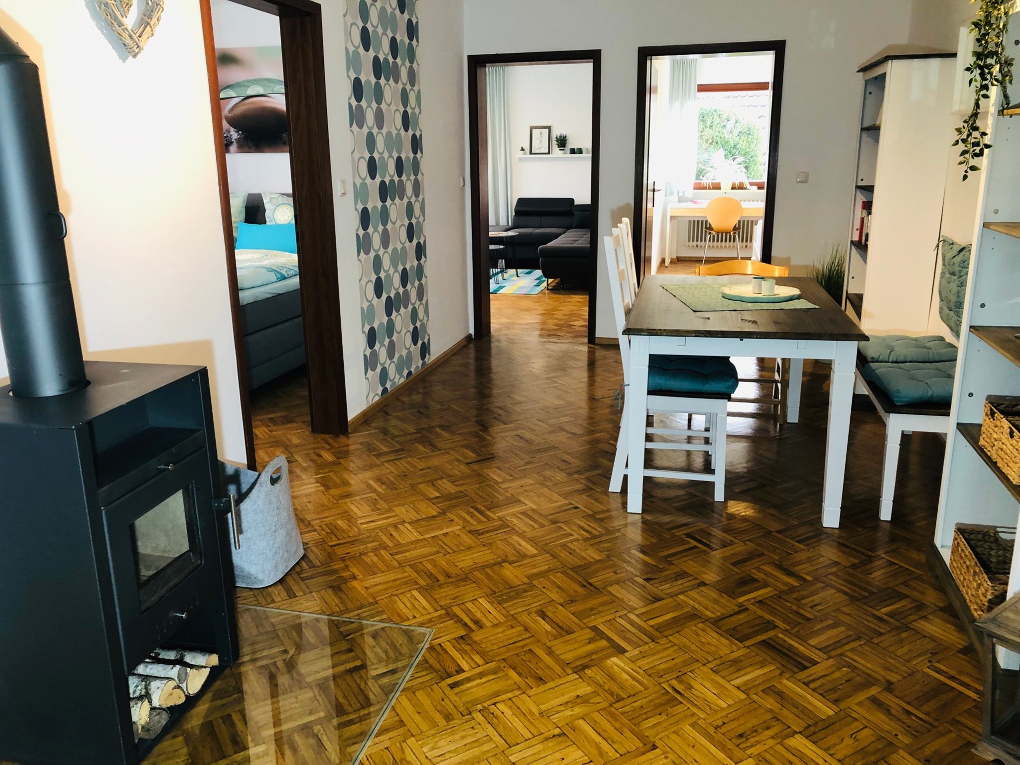 Die separate Küche mit Esstisch ist voll ausgestattet mit Spülmaschine, Kühl-Gefrierkombi, Kaffeemaschine, Nespresso, Mixer, Mikrowelle, reichlich Geschirr, sowie Gewürzen, Kaffee, Tee und Küchenwäsche. Das neue Bad hat eine bodengleiche Dusche sowie eine Waschmaschine, großen Spiegel, und ausreichend Beleuchtung. Alle Zimmer haben einen eigenen Zugang zum Aufenthaltsbereich mit großem Eßplatz und Schwedenofen, lassen sich voll verdunkeln und bleiben im Sommer angenehm kühl.