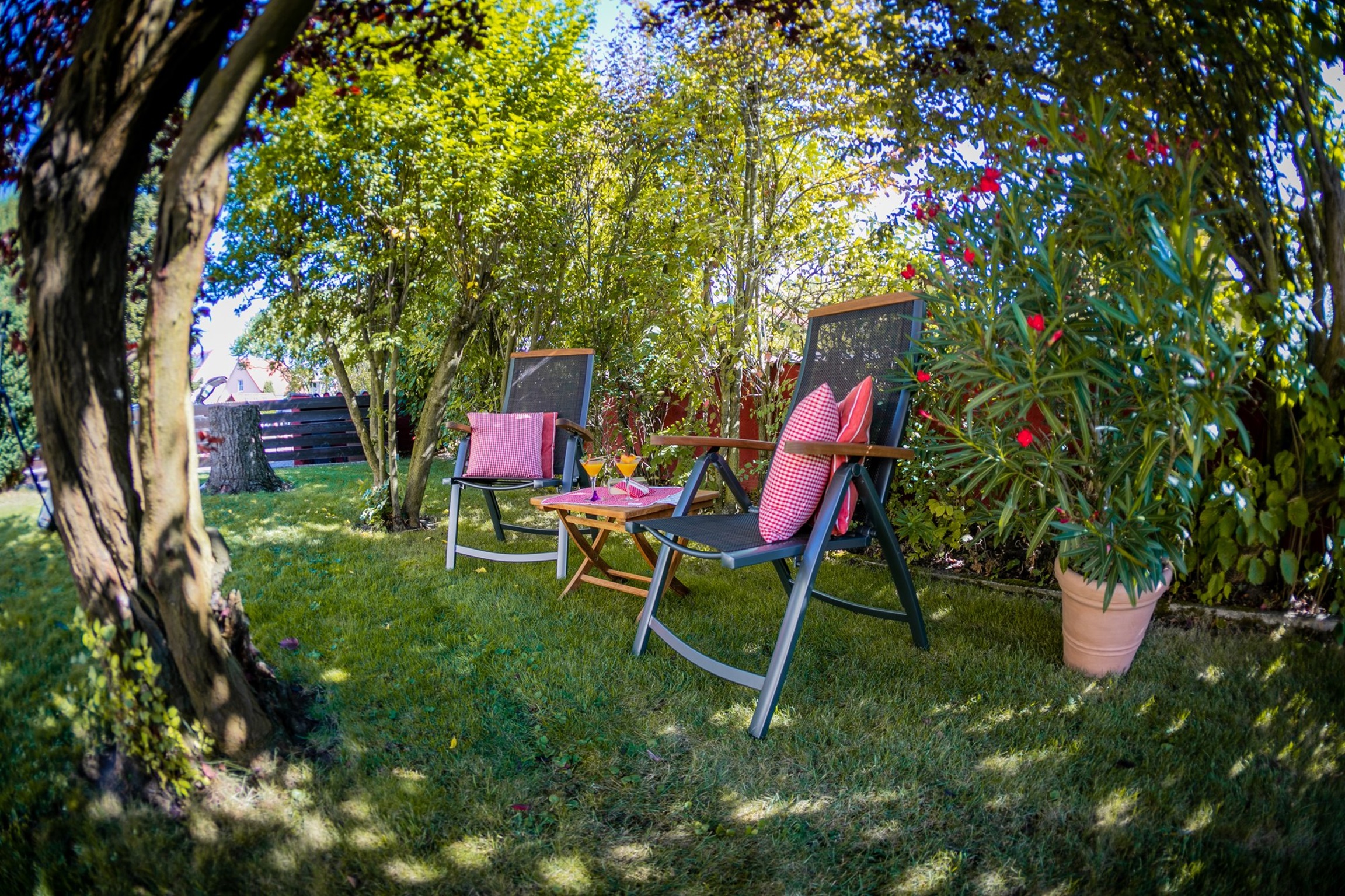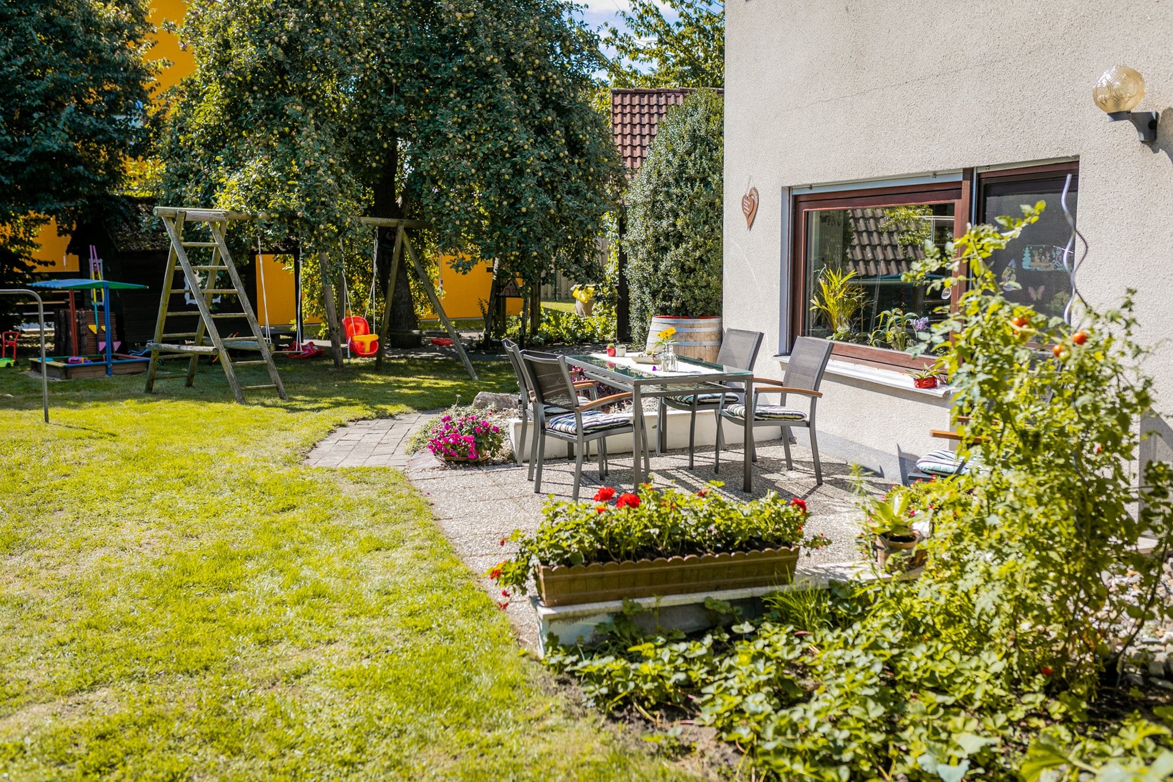 Der allein genutzte Garten hat eine Sitzgruppe und für die Kleinsten viel zu bieten: Spielhaus, Schaukel, Sandkasten, Planschbecken, Bobbycar etc.