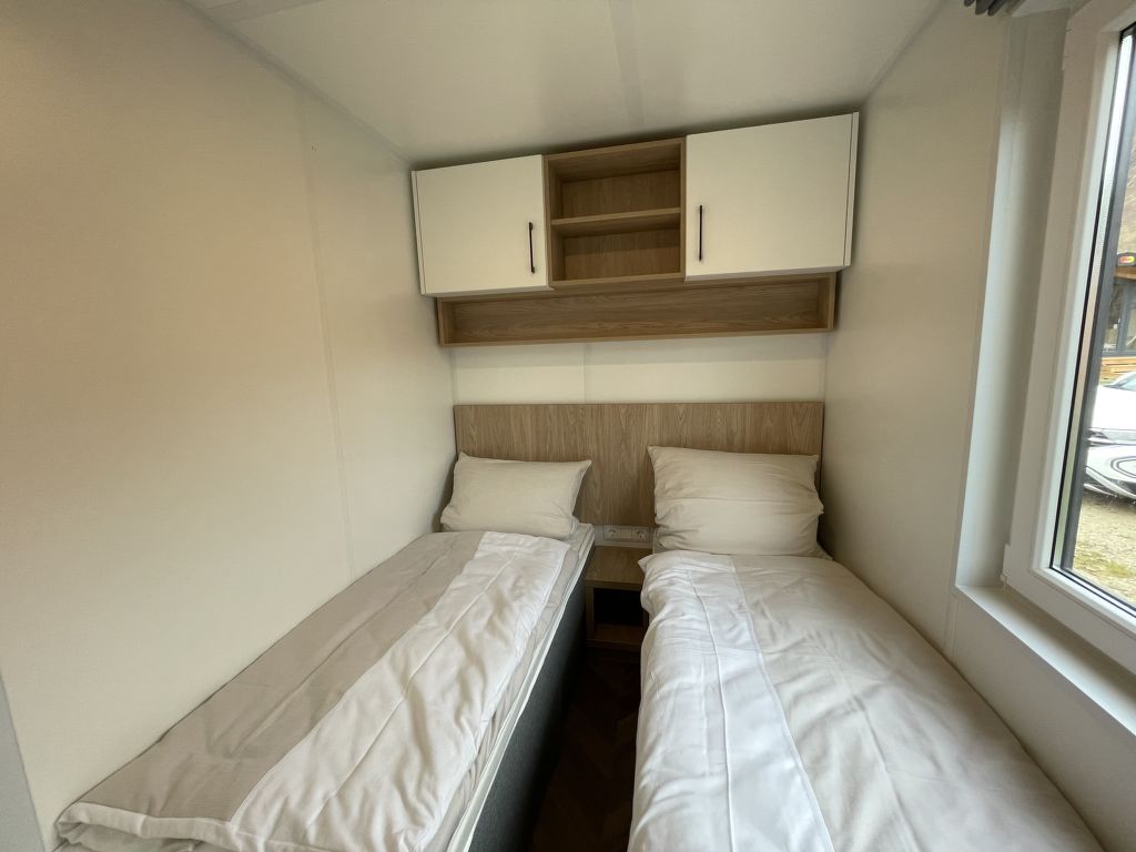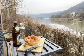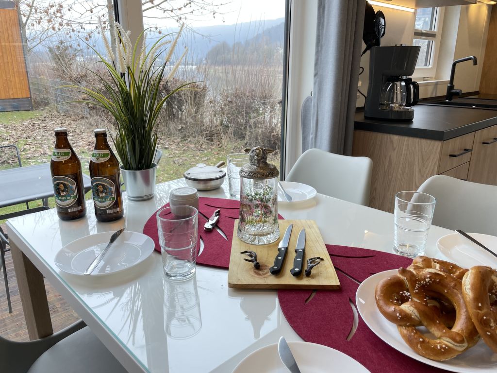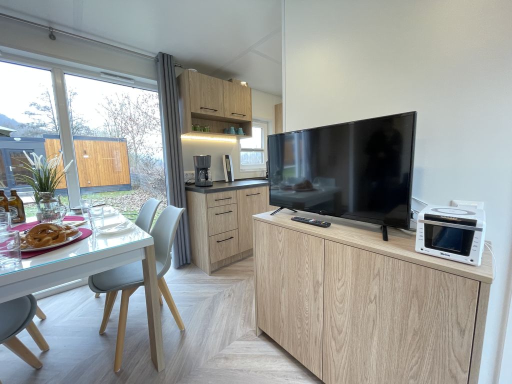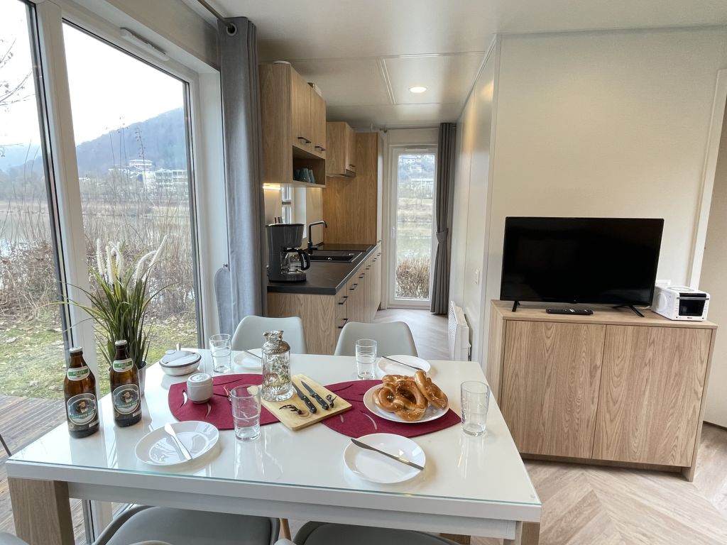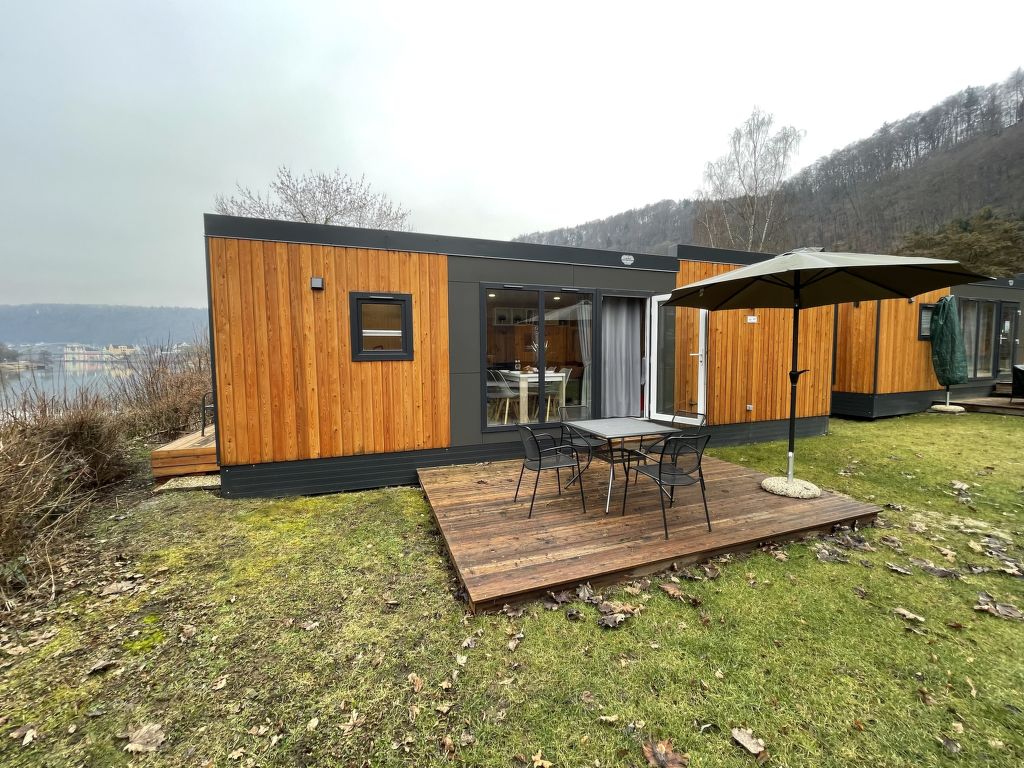 Tiny Haus Schleusenblick, 3-Zimmer-Mobilheim 32 m2, im Erdgeschoss. Gemütlich eingerichtet: Wohn-/Schlafzimmer mit 1 Diwanbett (120 cm, Länge 170 cm), Esstisch und Sat-TV (Flachbildschirm). Ausgang zur Terrasse. 1 Zimmer mit 1 franz. Bett (140 cm, Länge 200 cm). 1 Zimmer mit 2 Betten (80 cm, Länge 200 cm). Offene Küche (4 Glaskeramikplatten, Wasserkocher, elektrische Kaffeemaschine). Dusche/WC. E-Heizung. Kleine Terrasse. Terrassenmöbel. Schöne Sicht auf den Fluss. Parkplatz (1 Auto) beim Haus. Bitte beachten: Nichtraucher-Haus. Maximal 1 Haustier/Hund erlaubt. Rauchmelder. Flexibilität bei der Bettenaufteilung: Es stehen mehr Schlafmöglichkeiten zur Verfügung als die maximal zugelassene Personenzahl, diese darf dennoch nicht überschritten werden.