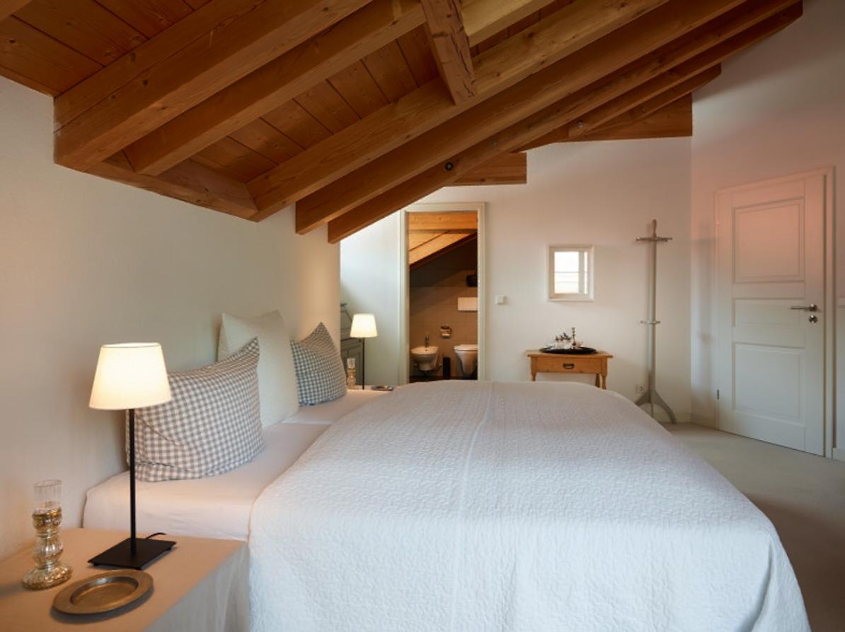 Geschmackvoll eingerichtetes Doppelzimmer (26qm) mit Dusche / WC, TV und WLAN. Balkon mit Aussicht auf den Hirschberg. Bitte beachten Sie, dass das Appartement keine Küche hat (kleiner Kühlschrank und eine Nespressomaschiene sind im Zimmer) und wir keinen Frühstücksservice mehr anbieten.
