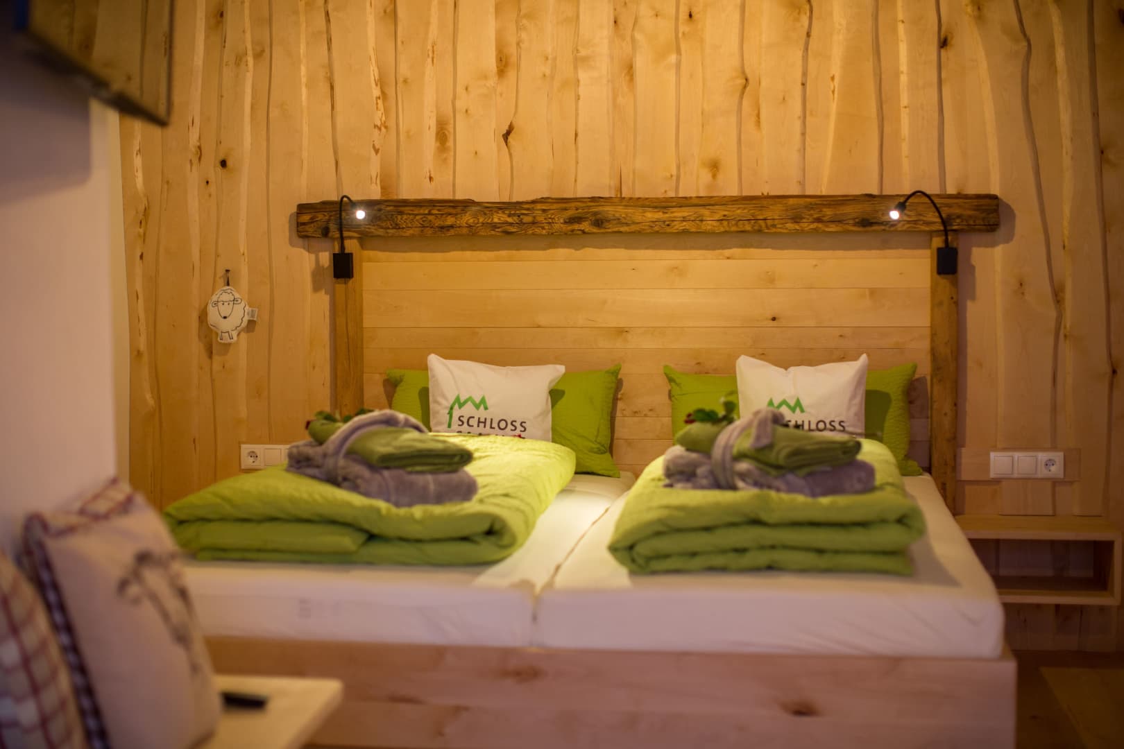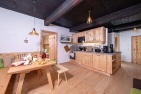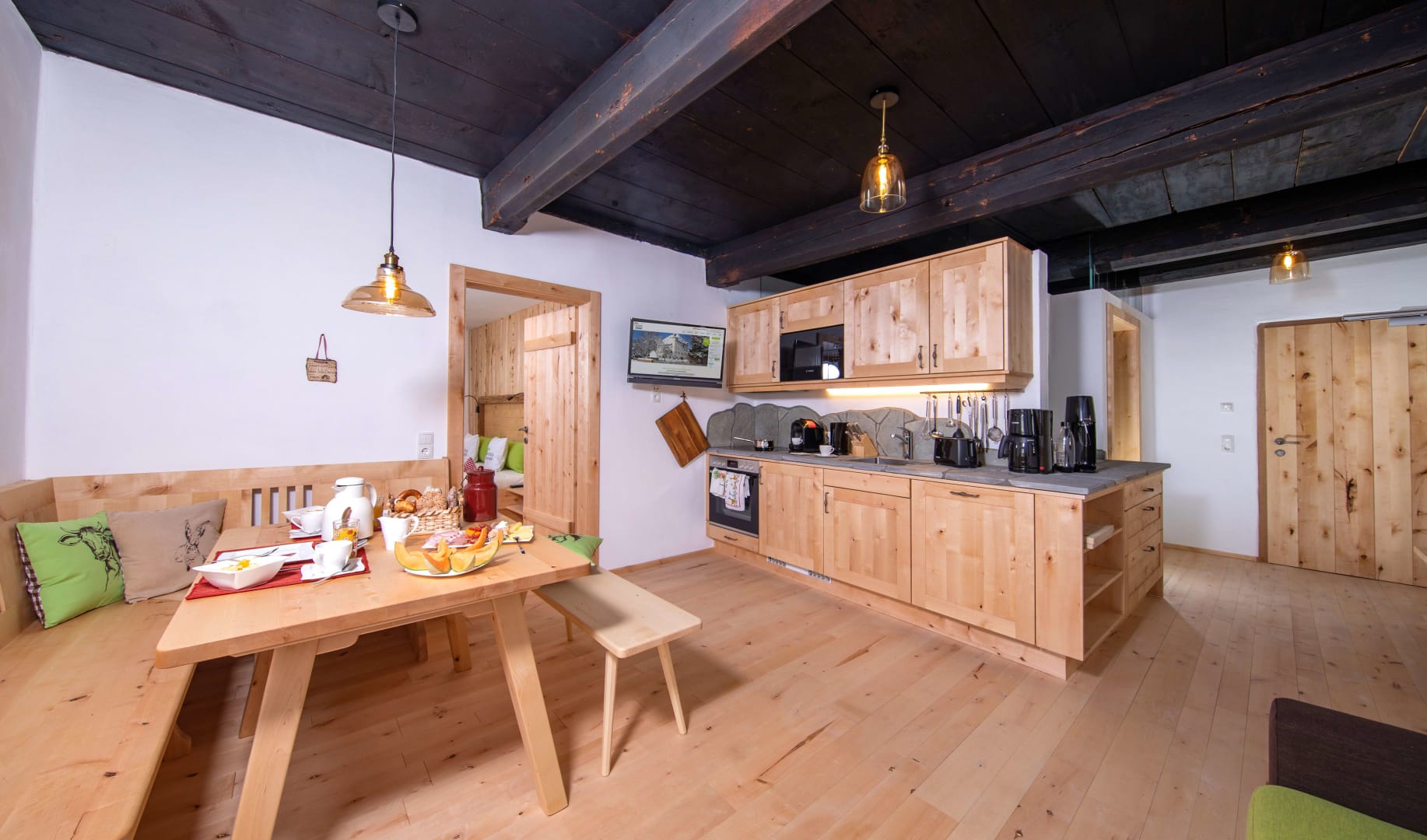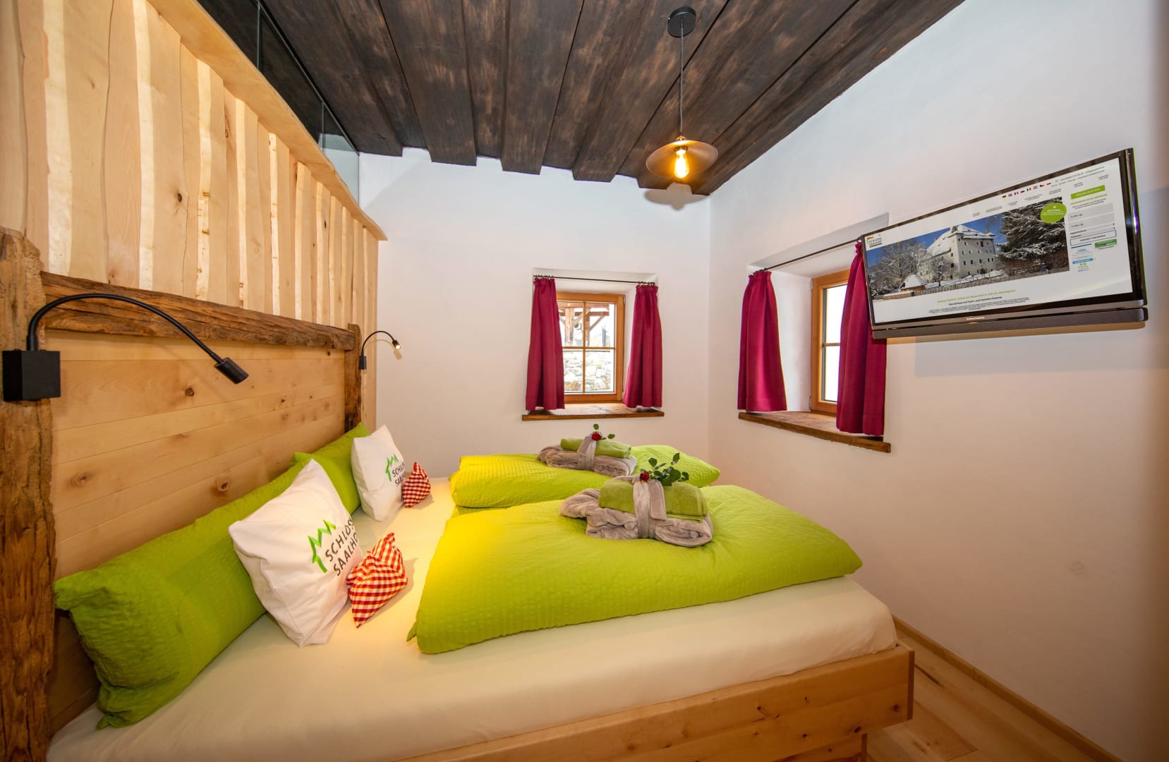 Das 8. Schlafzimmer ist das Dachkammerl, ein Doppelzimmer mit Küchenzeile und Klappbett (160x200cm) im 2. Stock, das optional dazu gebucht werden kann.