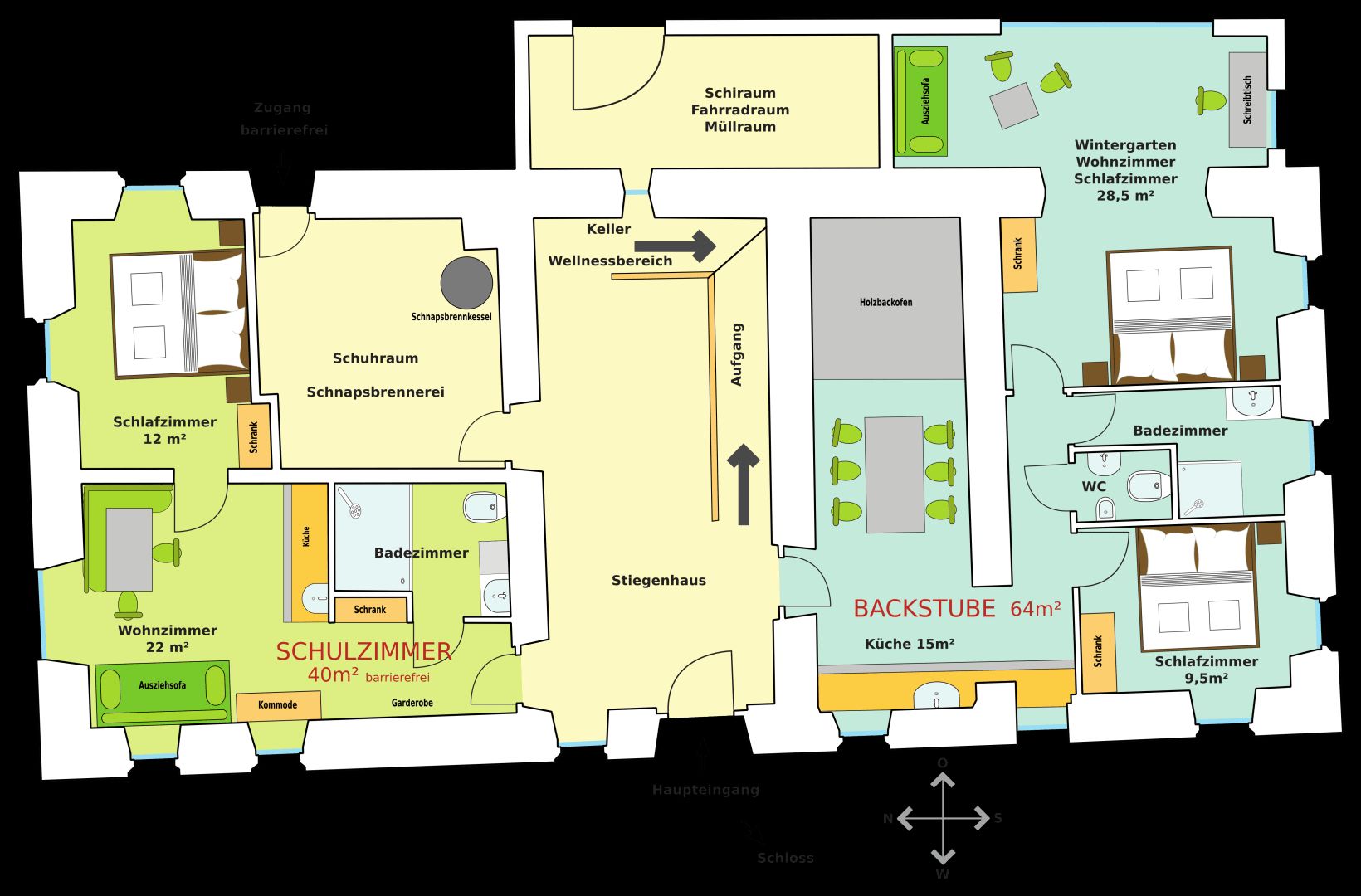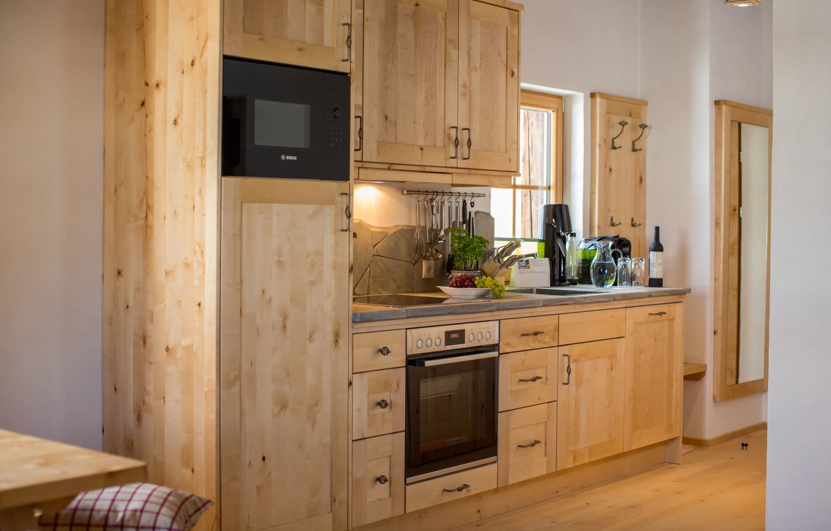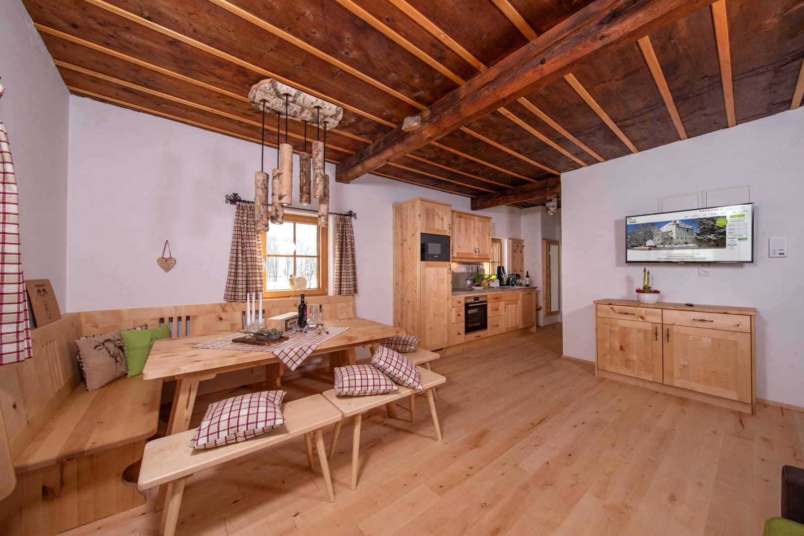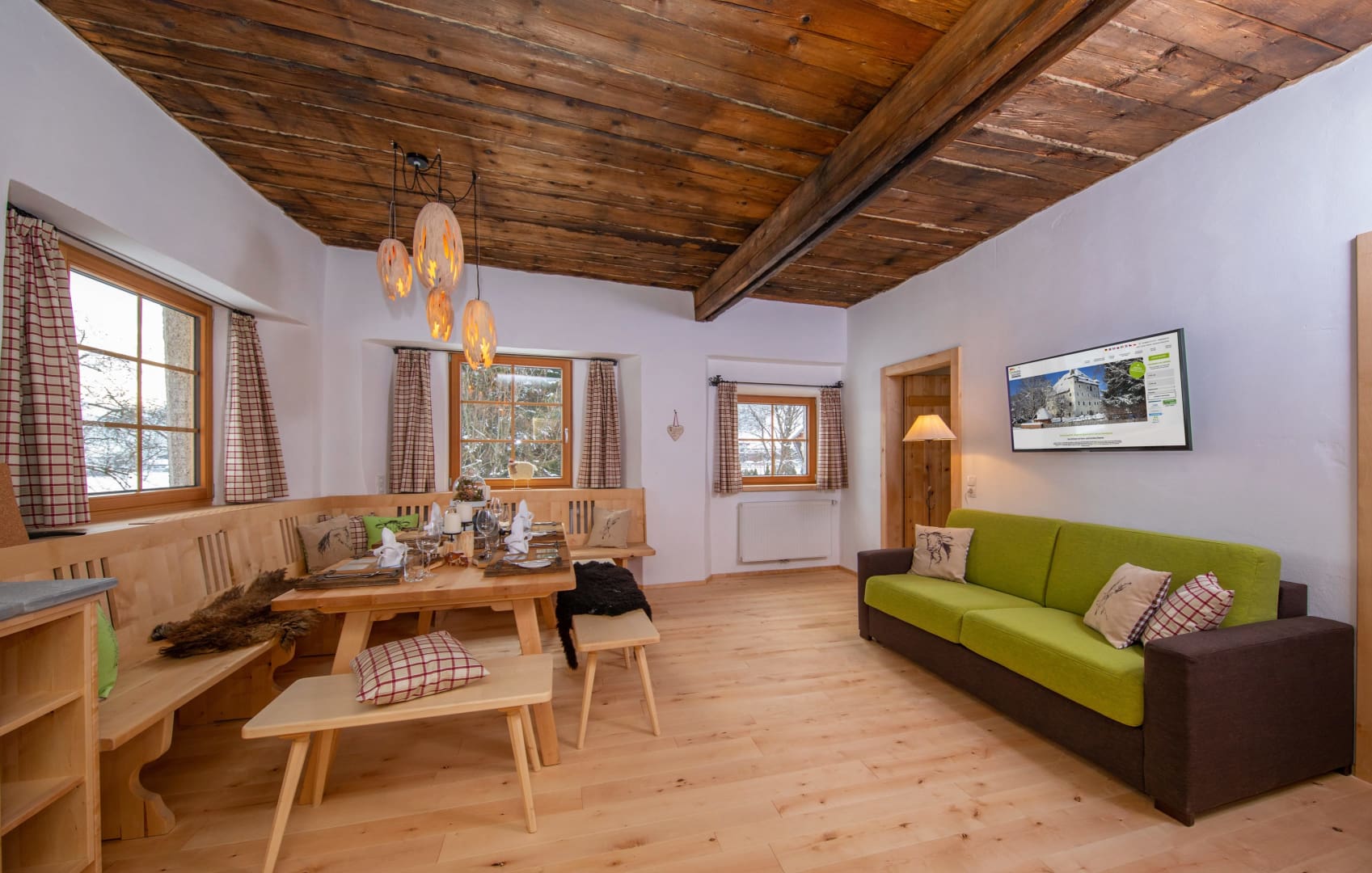 Es bietet mit 7-8 vollwertigen Schlafzimmern, 5 Bädern, 4 separaten WCs, einem großen gemeinsamen Essbereich und Lounge im 1. Stock Gruppen und Familien von 14 bis 27 Personen Platz. Die große Küche der Moarstube bietet sich zum gemeinsamen Kochen an. Trotzdem hat jede Familie einen eigenen Rückzugsbereich durch die Aufteilung in 4 Appartements: Schulzimmer, Backstube, Moarstube und Hiatakammer.