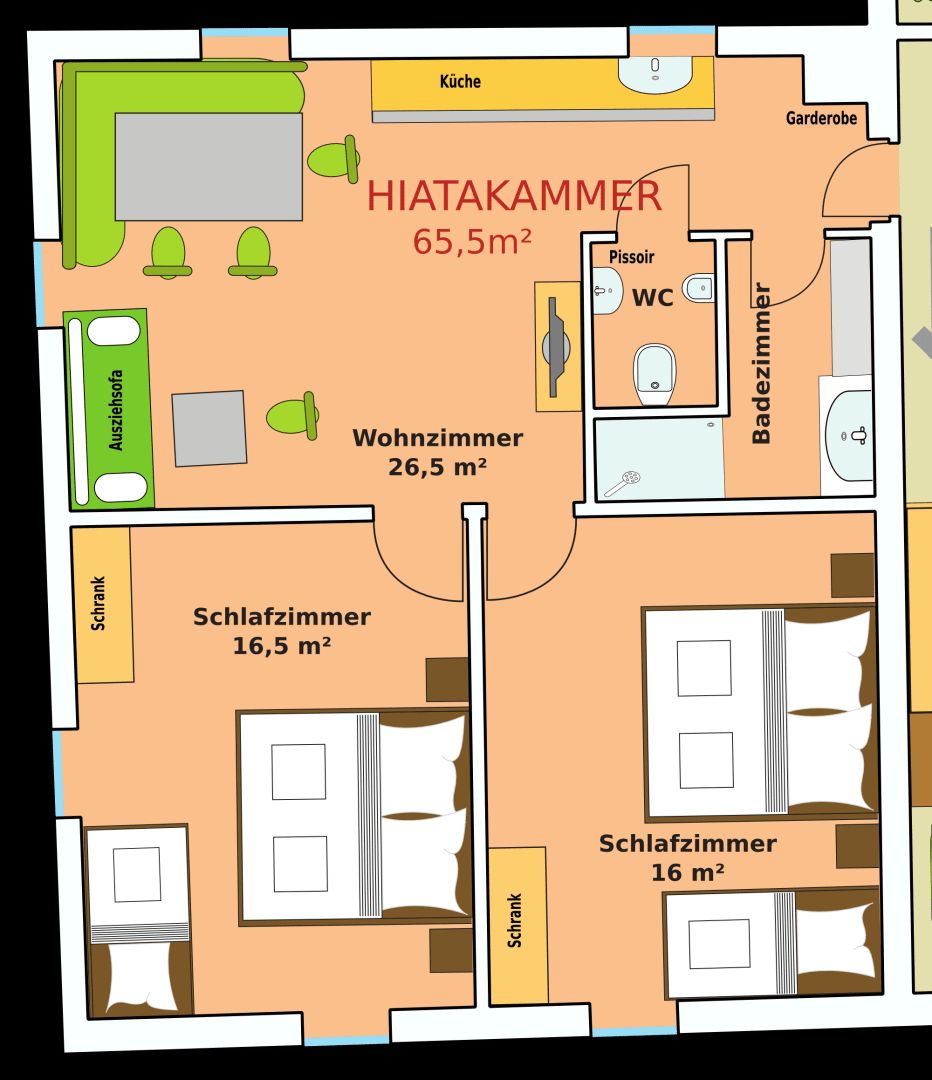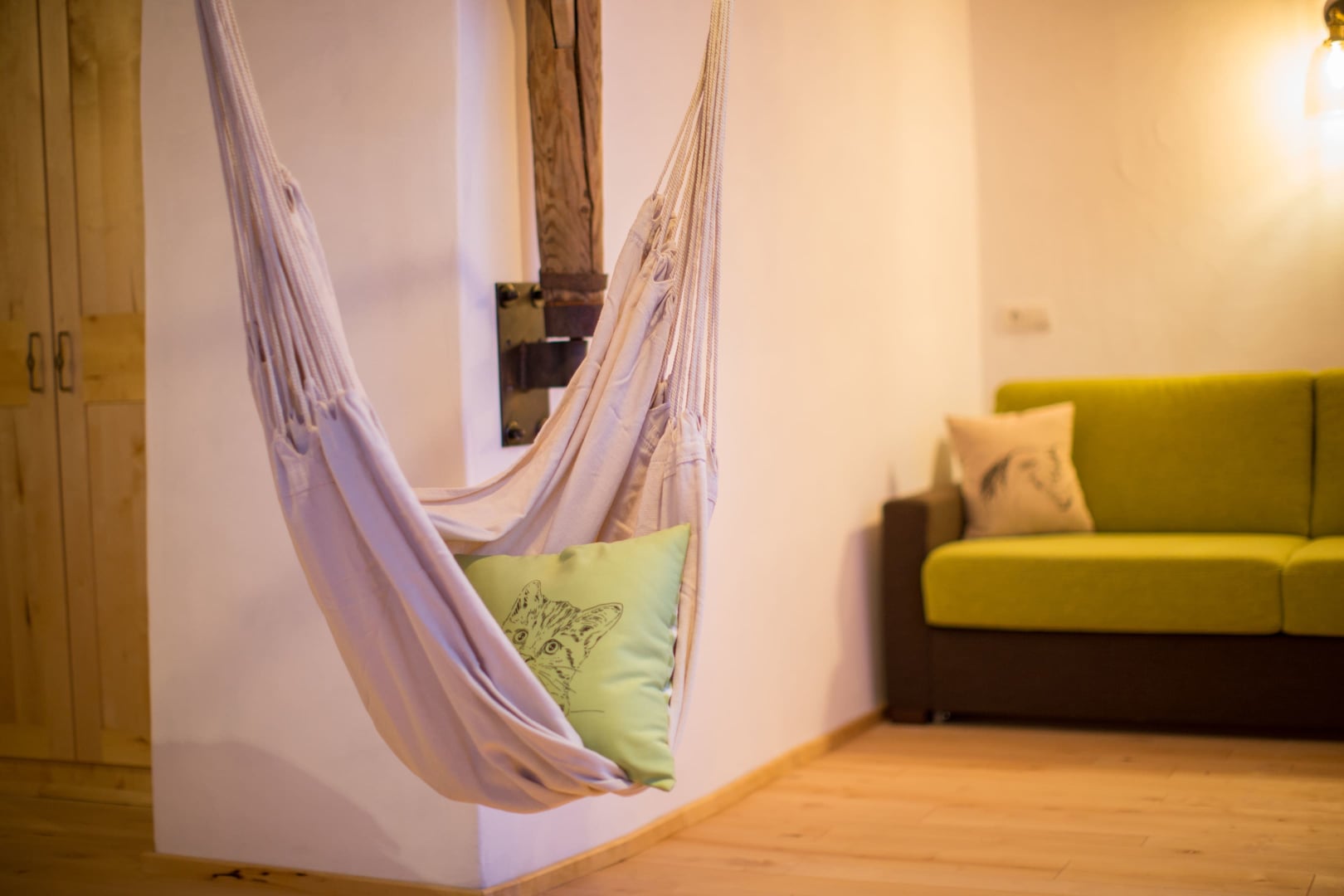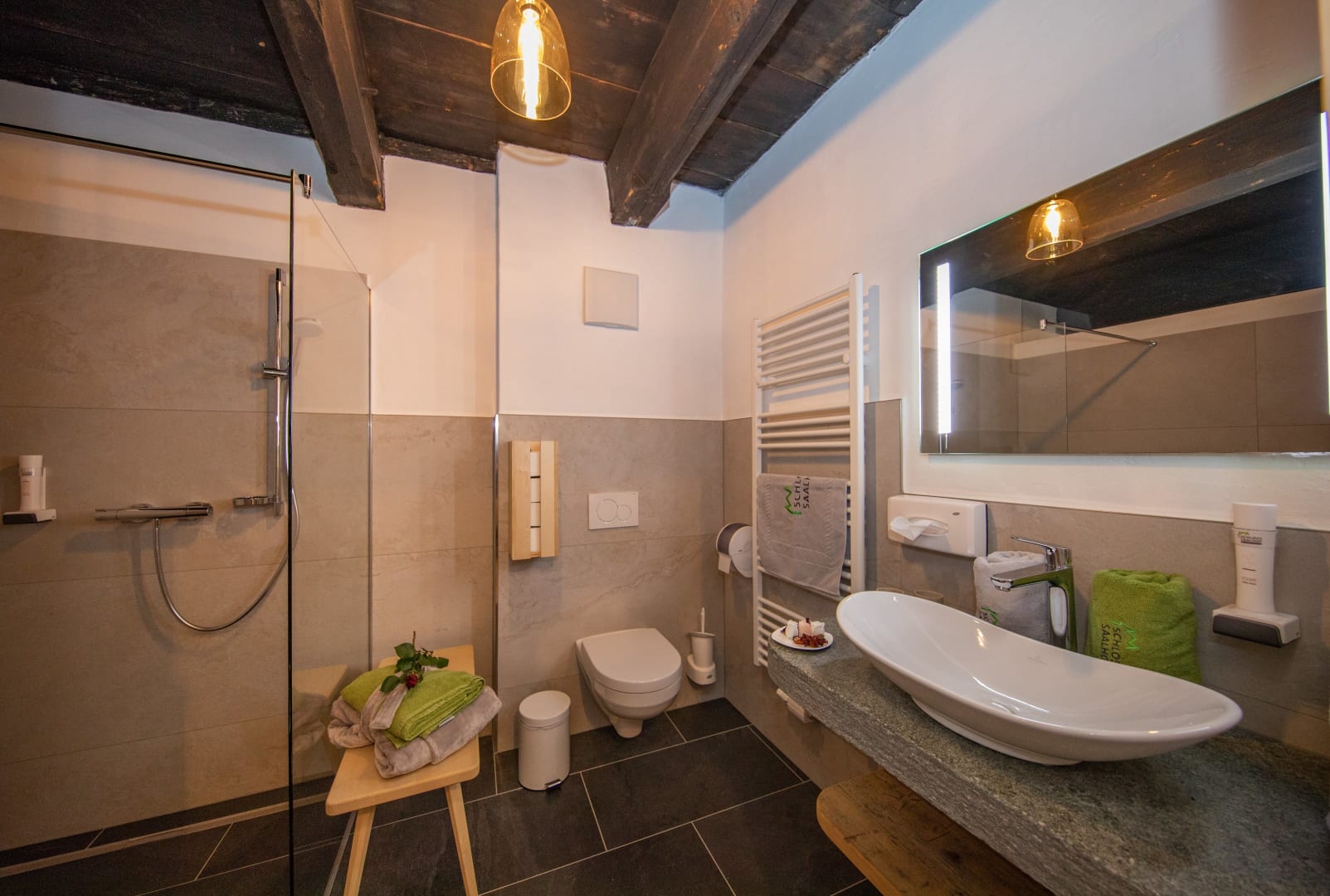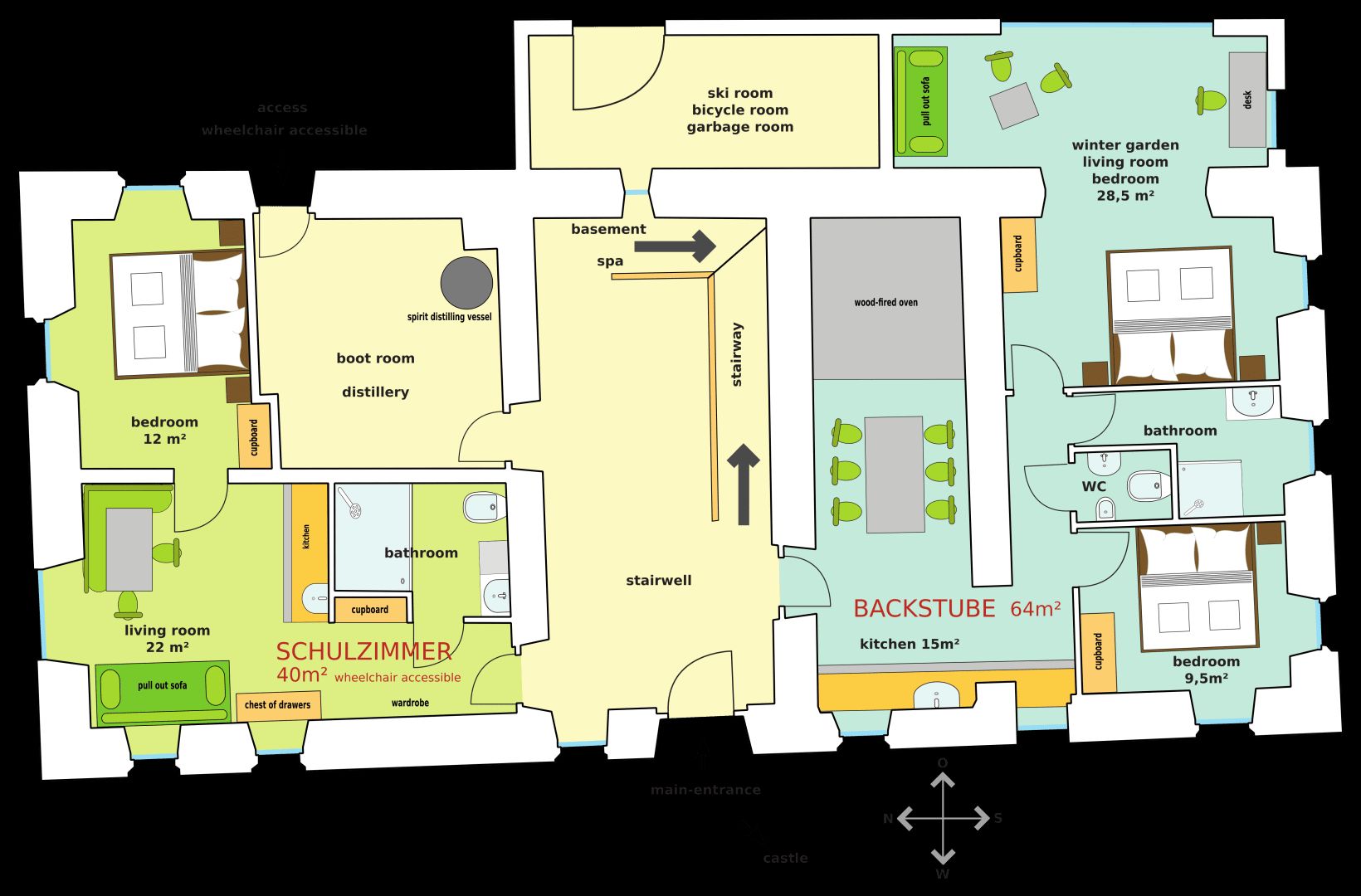 Es bietet mit 7-8 vollwertigen Schlafzimmern, 5 Bädern, 4 separaten WCs, einem großen gemeinsamen Essbereich und Lounge im 1. Stock Gruppen und Familien von 14 bis 27 Personen Platz. Die große Küche der Moarstube bietet sich zum gemeinsamen Kochen an. Trotzdem hat jede Familie einen eigenen Rückzugsbereich durch die Aufteilung in 4 Appartements: Schulzimmer, Backstube, Moarstube und Hiatakammer.