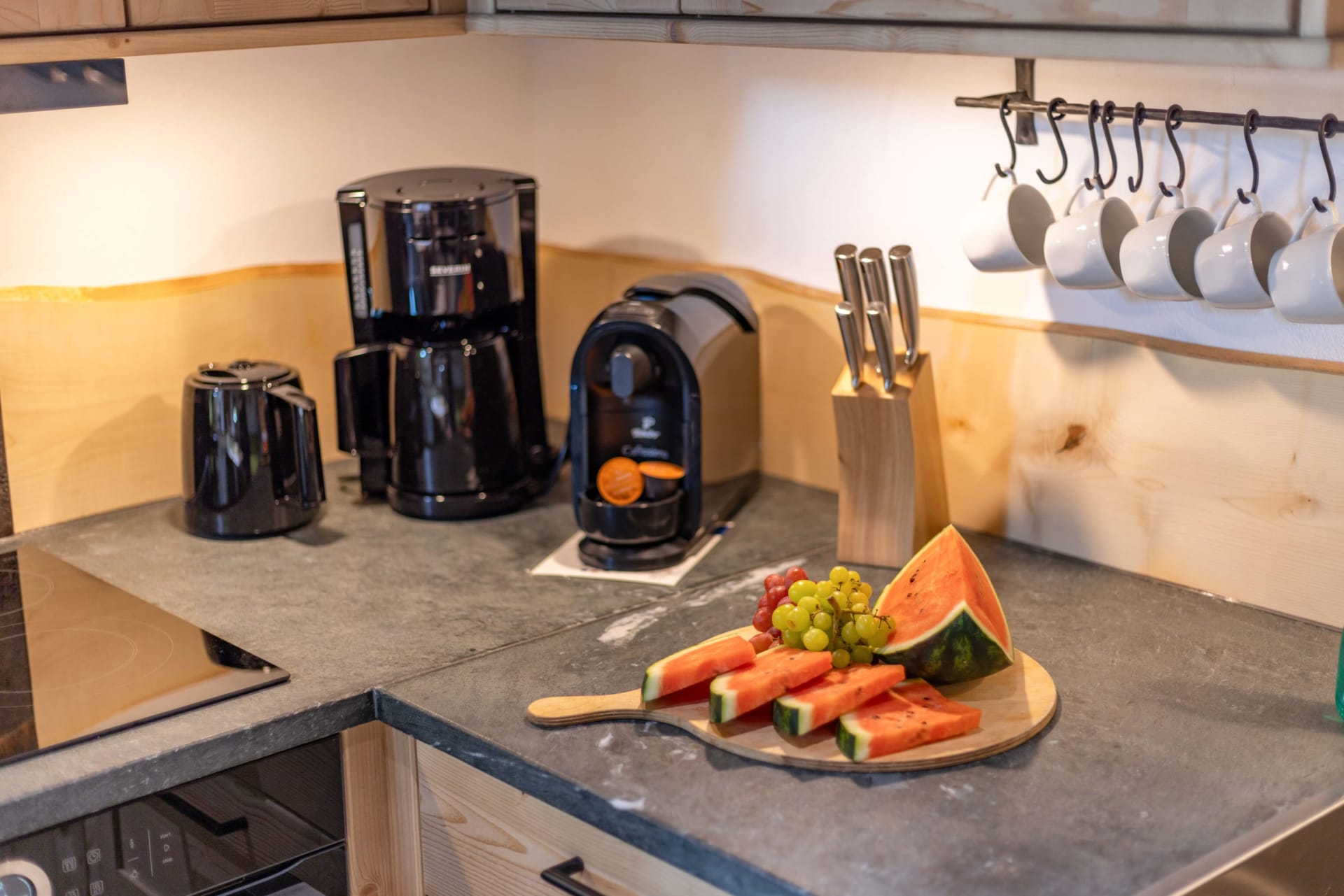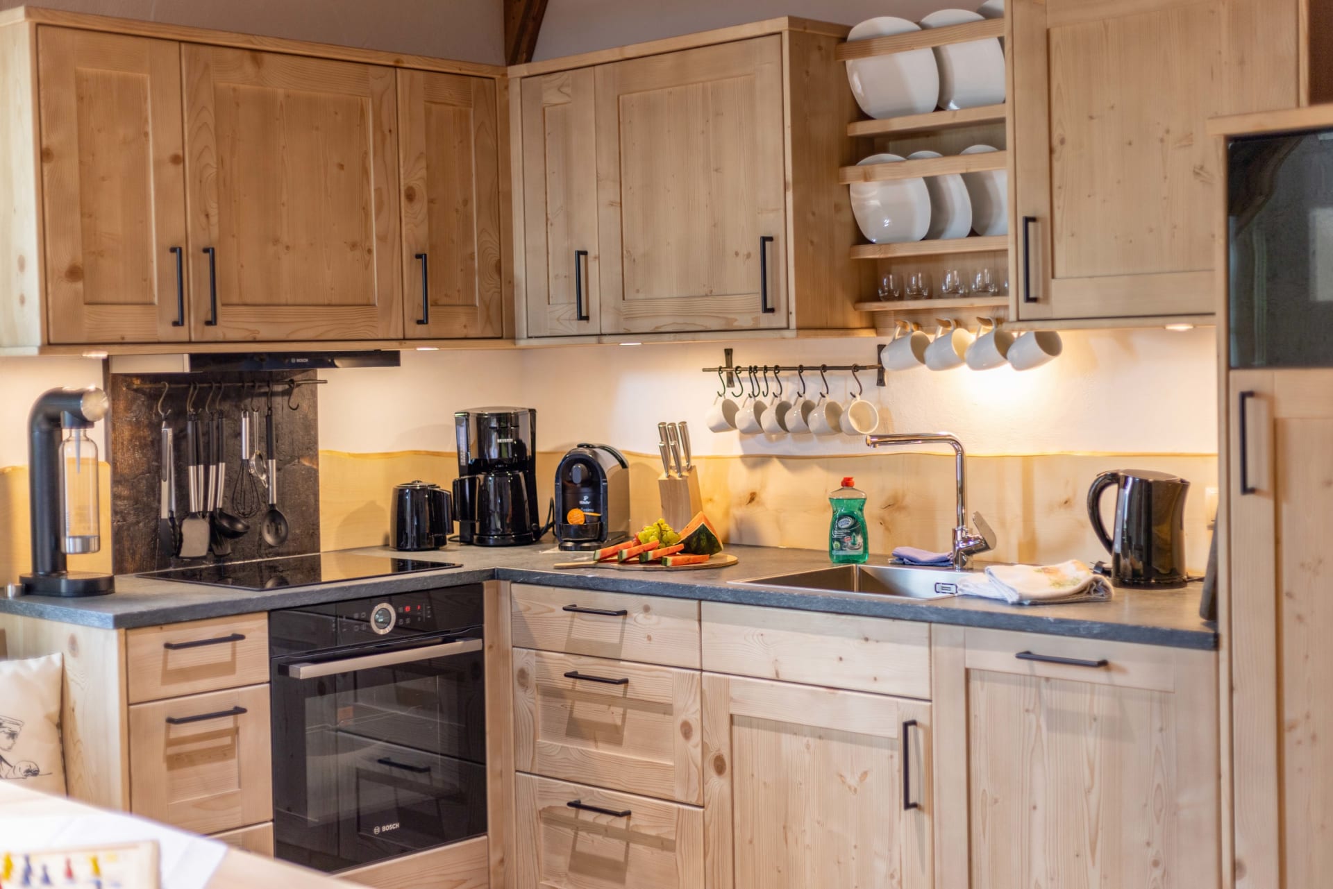 • Hier macht Kochen Spaß: Markenküchengeräte der Firma Bosch: Geschirrspüler, Kühlschrank mit Gefrierfach, Herd mit Backofen, Mikrowelle. Außerdem Spüle, Kaffeefiltermaschine, Espressotabsmaschine (Marke Tchibo), Sodastream, Wasserkocher, Eierkocher, Pürierstab, Toaster, Geschirrspülmittel- und Tabs, Geschirrtuch.