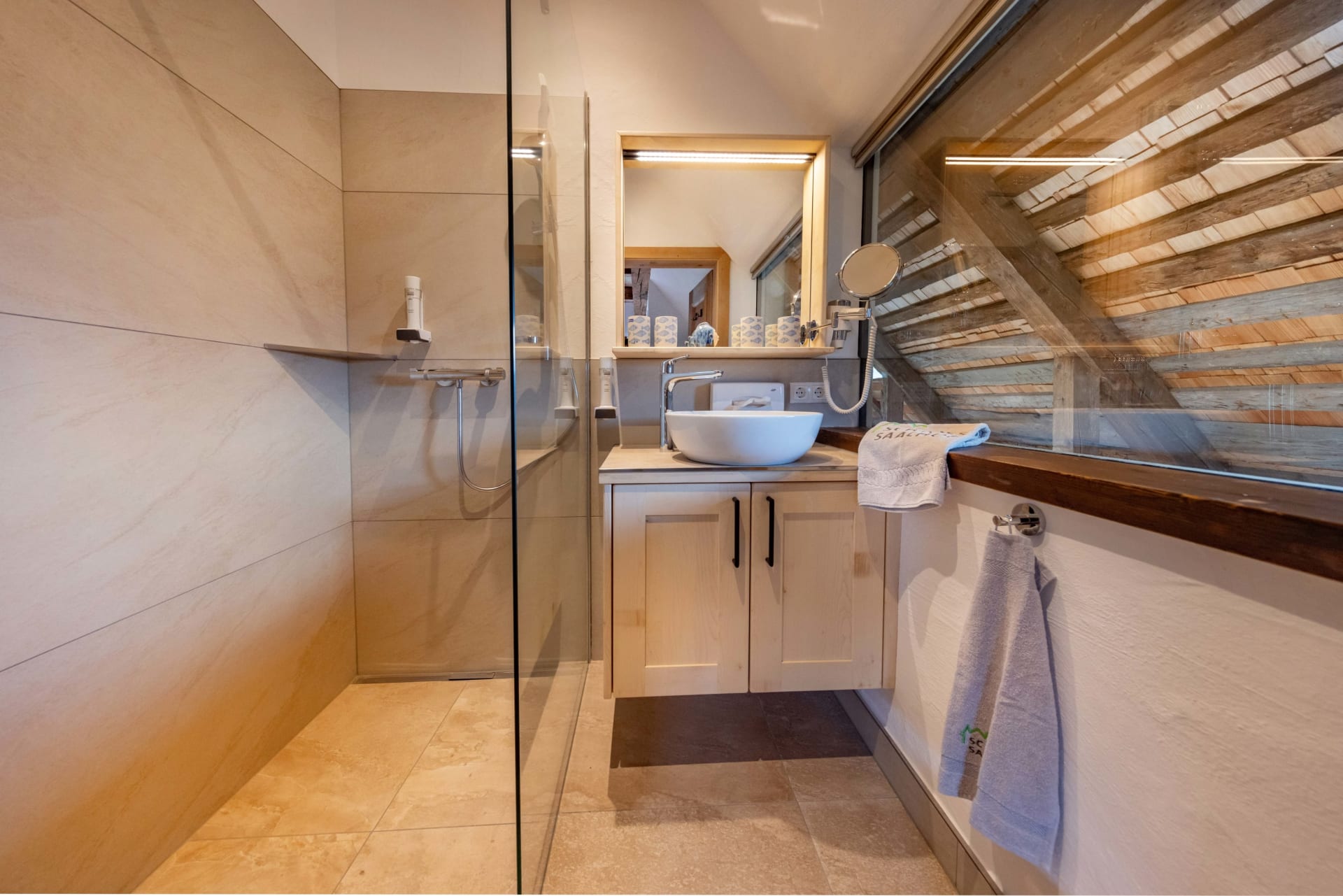 • Bad mit begehbarer Dusche, stylischem Waschtisch, Föhn, Shampoo, Seife, Hand- und Duschtücher, Schminkspiegel...