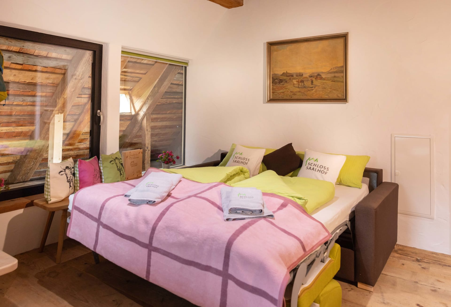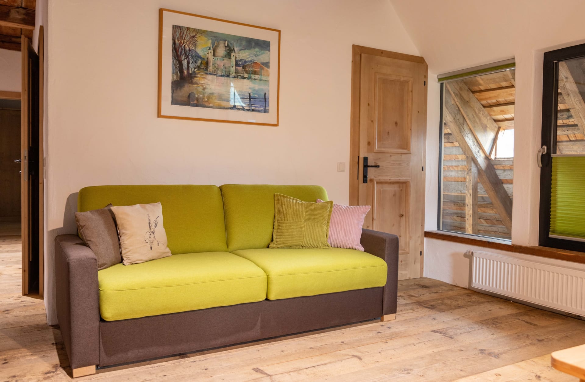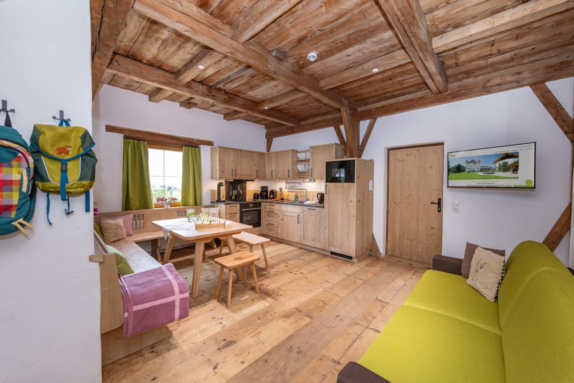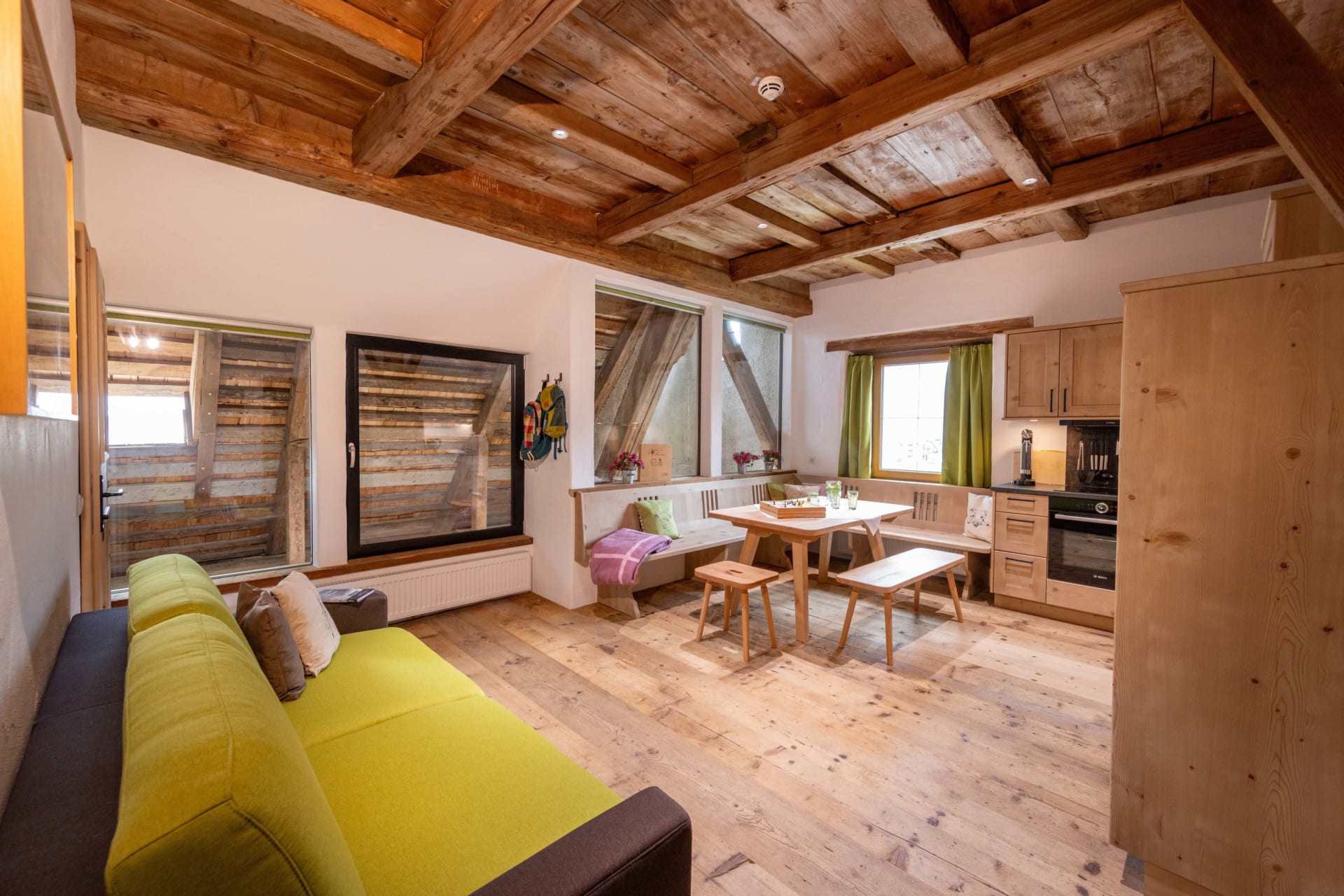 • Große Vollholzwohnküche mit Klappbett (Hochbirgsfichte aus dem eigenen Wald) mit edler Steinplatte (regionaler Stein aus Österreich) mit Sitzecke am Schlossturm und Sofa (mit vollwertiger Matratze ausklappbar für 2 Personen), originale 400 Jahre alte, rustikale Altholzdielen
