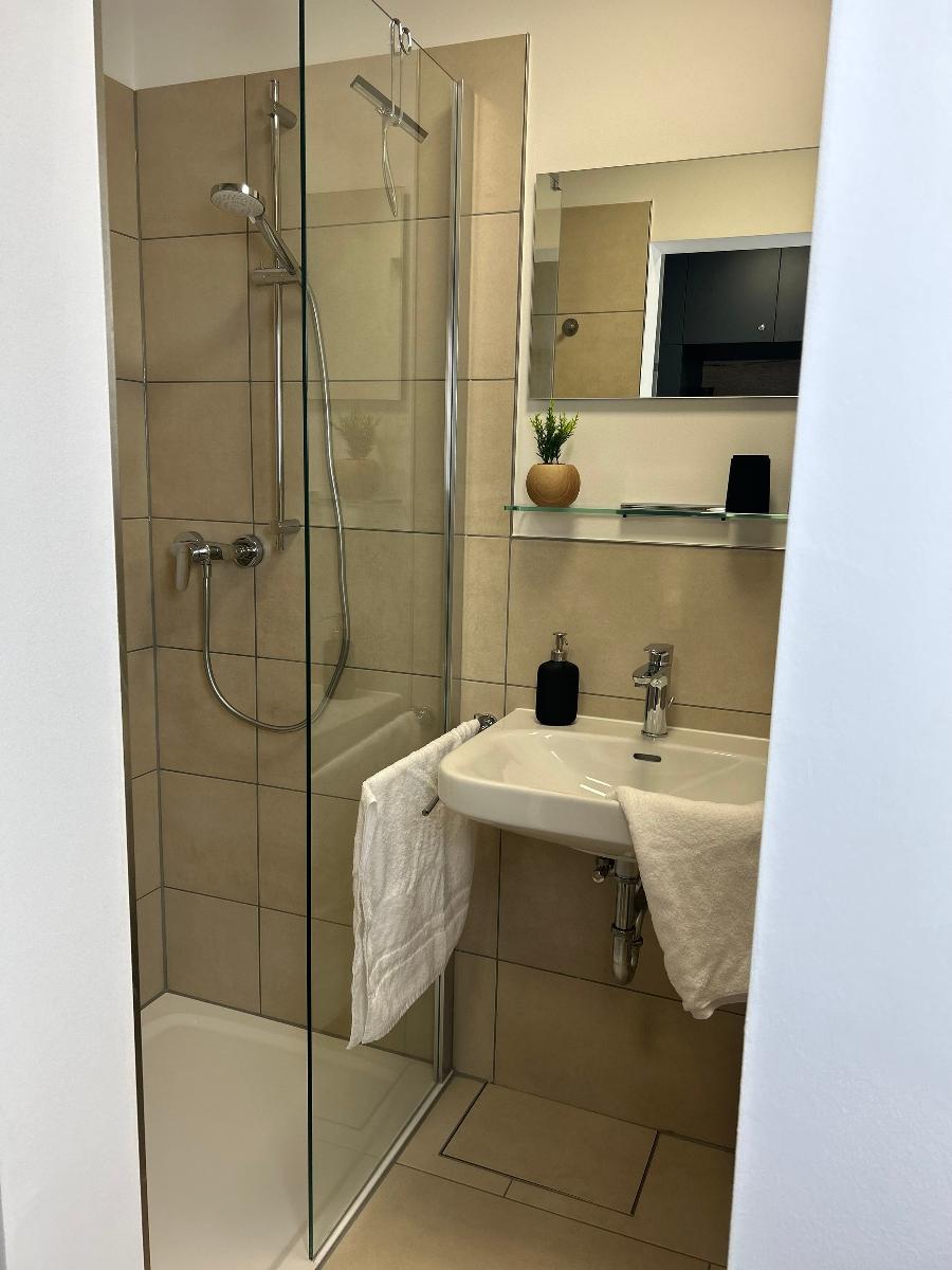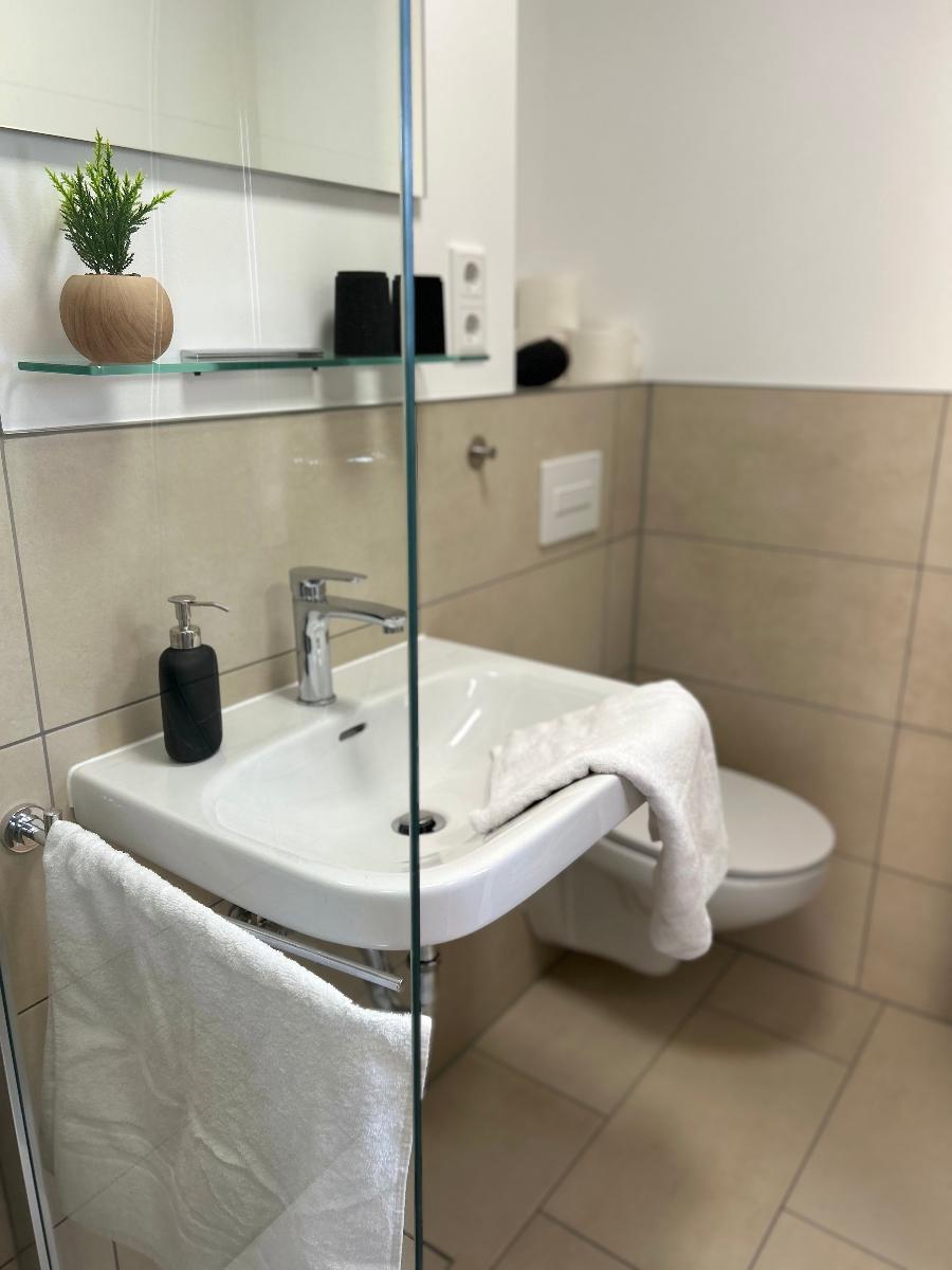 Ein neues eingerichtetes Badezimmer mit Dusche und WC befindet sich in der Ferienwohnung.