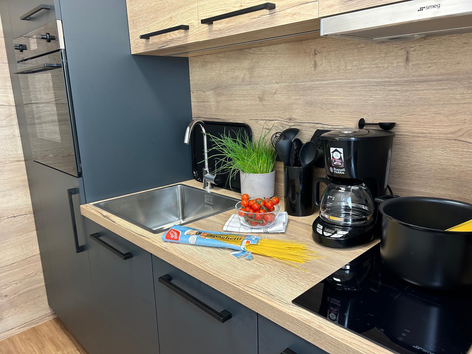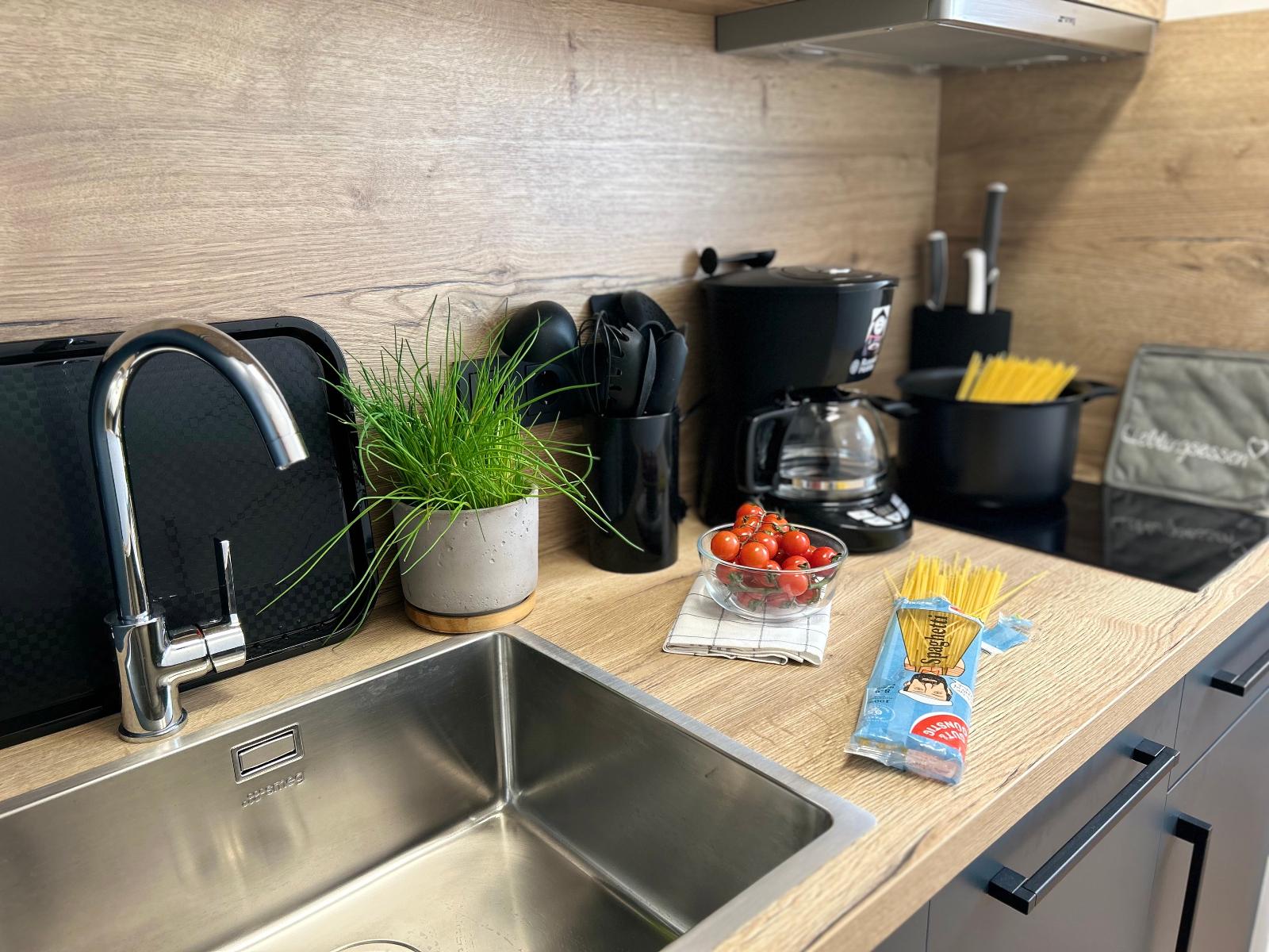 Die 35 qm große, gemütlich eingerichtete Ferienwohnung, mit Balkon, bietet Platz für maximal 4 Personen. Sie besitzt eine gut ausgestattete Küche mit Kochfeld, Kühlschrank mit kleinem Gefrierfach, Kaffeemaschine, Geschirrspüler, Toaster und Wasserkocher. Die Küche ist komplett eingerichtet, Teller, Tassen, Gläser und Kochutensilien stehen zur Verfügung.