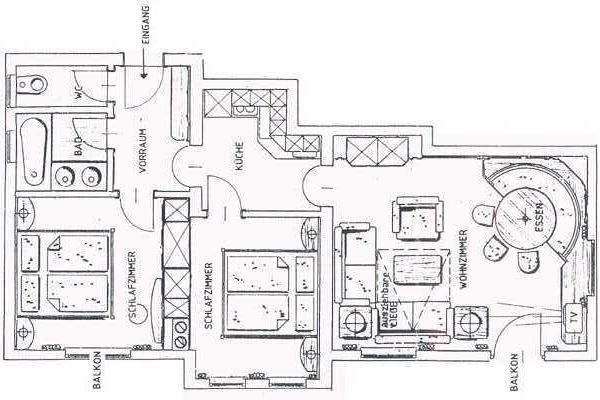 Großzügige FEWO mit 68 m²mit: Wohn-Schlafraum, großer Esstisch, gemütliche Sitzgruppe, zwei Schlafzimmer, Küchenzeile mit E-Herd, Backofen, Kühlschrank, Geschirrspüler, Bad, separates WC, 2 Balkone oder Terrasse; Ausstattung: Besteck, Geschirr, Bettwäsche, Handtücher, Duschtücher; Zusätzlich: Fernseher mit Kabel-TV, Telefon, Hifi-Anlage, Gratisparkplatz, Rad- und Skistall, Schuhtrockenraum.