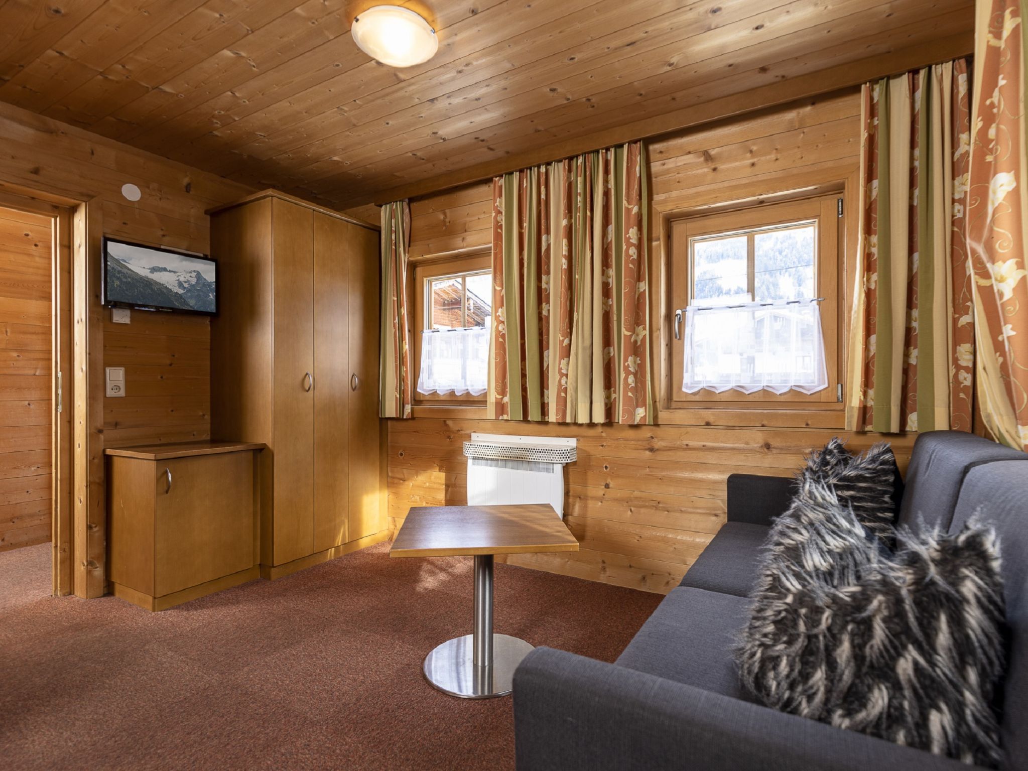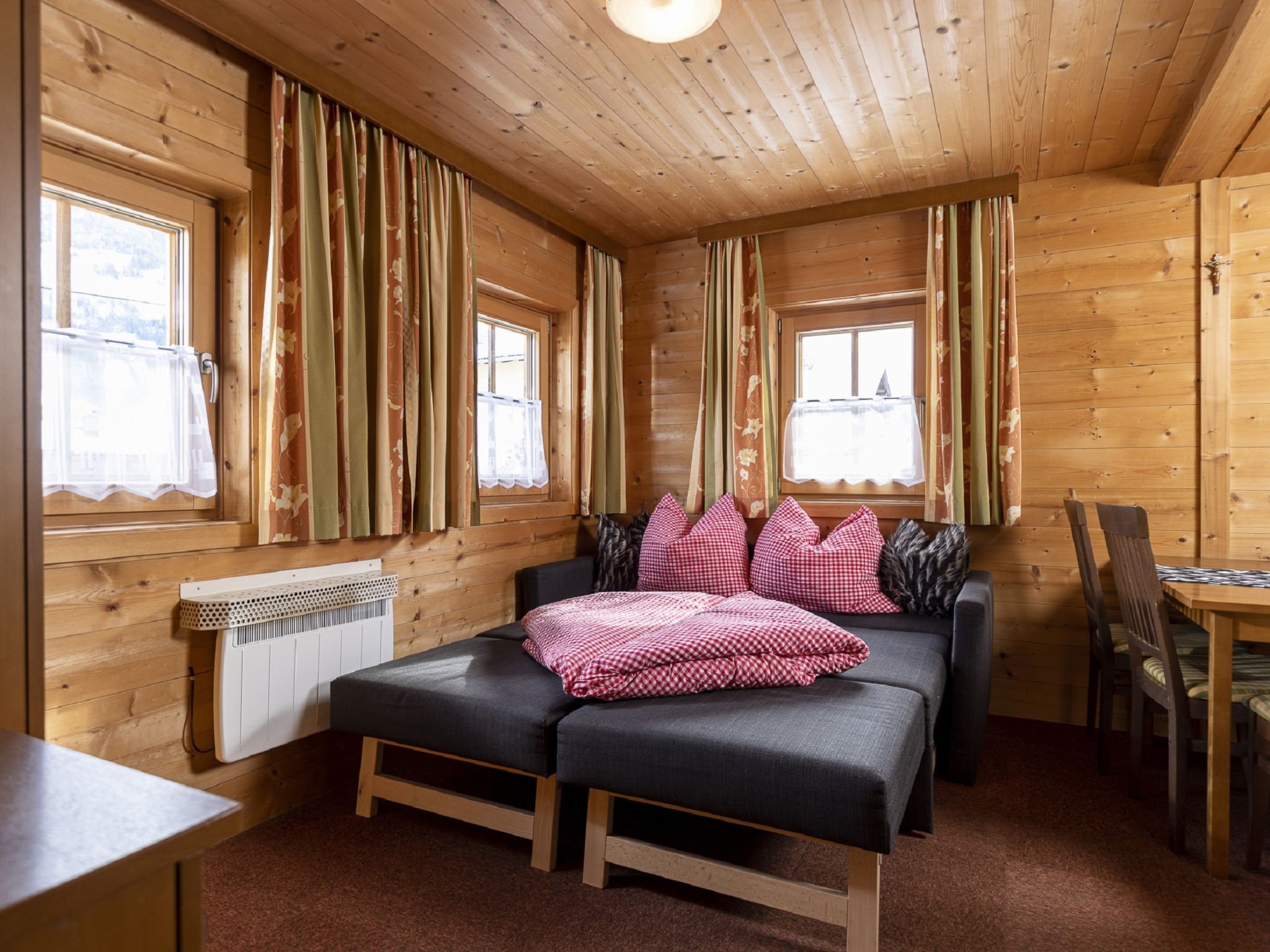Lindenalm, 3-Zimmer-Haus 60 m2. Schön und mit viel Holz eingerichtet: Eingang. 2 Doppelzimmer, jedes Zimmer mit Radio. Wohn-/Esszimmer mit 1 Doppeldiwanbett und offenem Kamin (nur Deko), Flachbildschirm. Offene Küche (4 Kochplatten, Backofen, Geschirrspüler, Toaster, Wasserkocher, Mikrowelle, elektrische Kaffeemaschine). Dusche, sep. WC. E-Heizung. Zur Verfügung: Safe. E-Ladestation. Bitte beachten: Maximal 2 Haustiere/Hunde erlaubt. Rauchmelder.