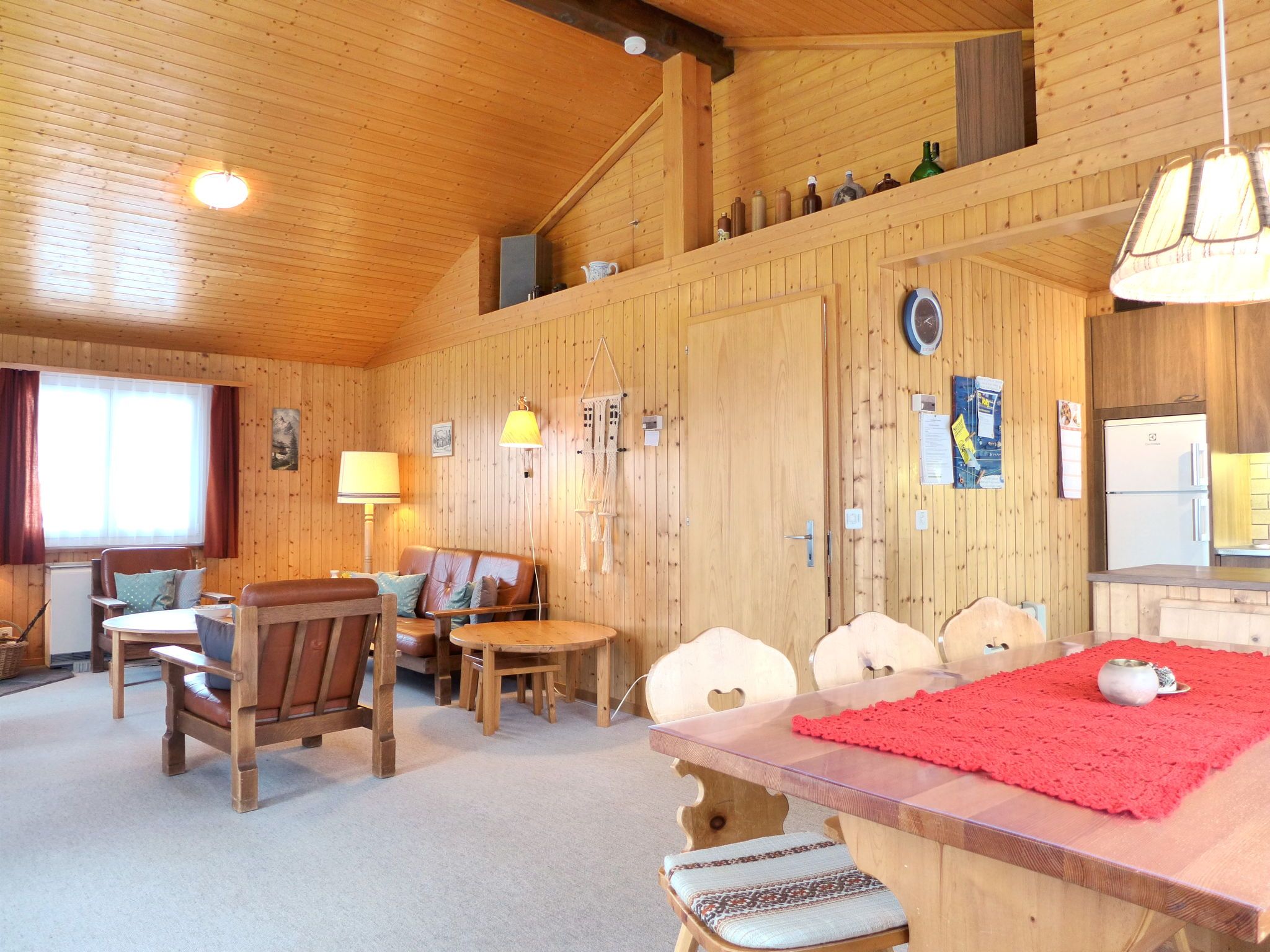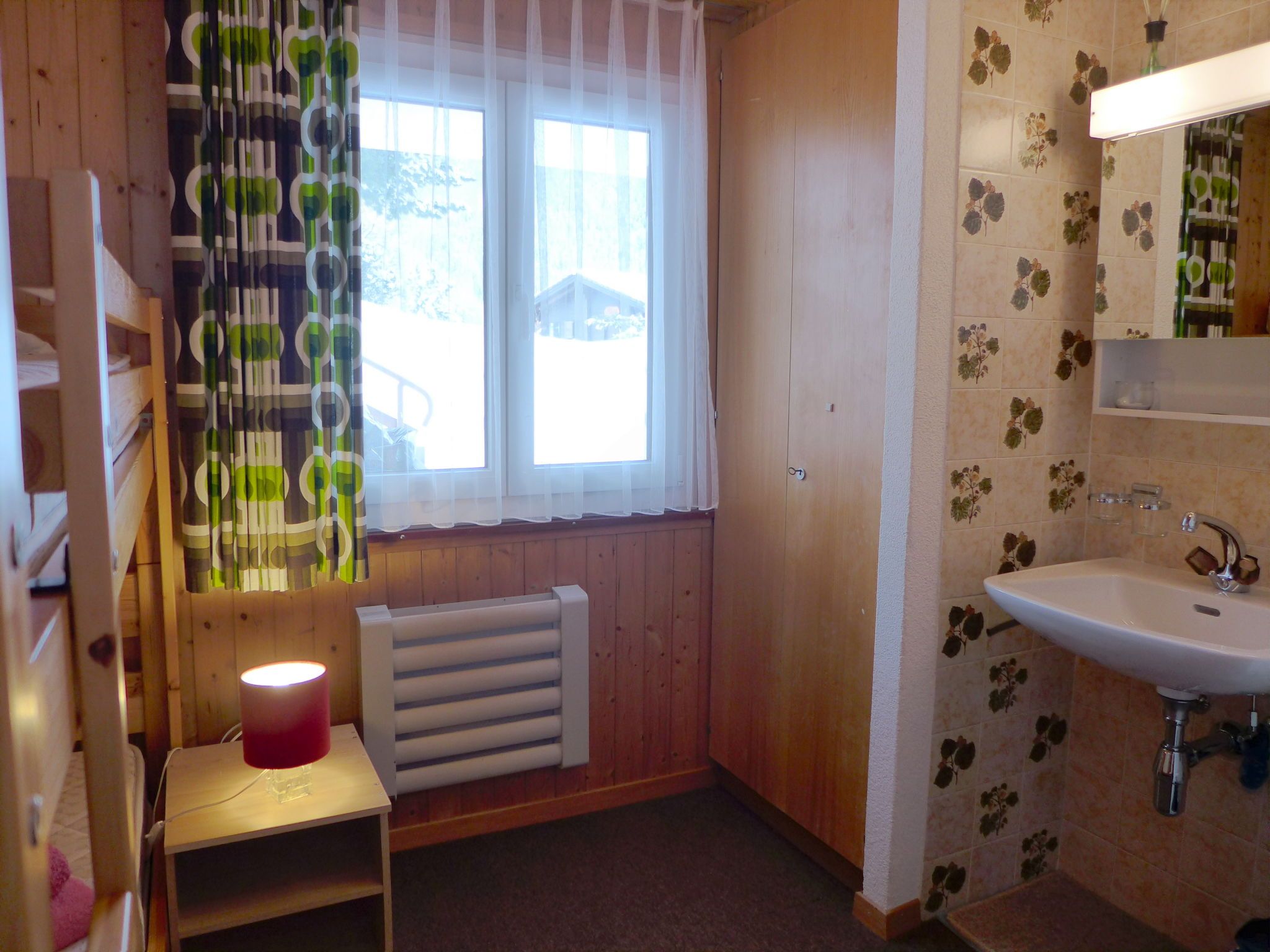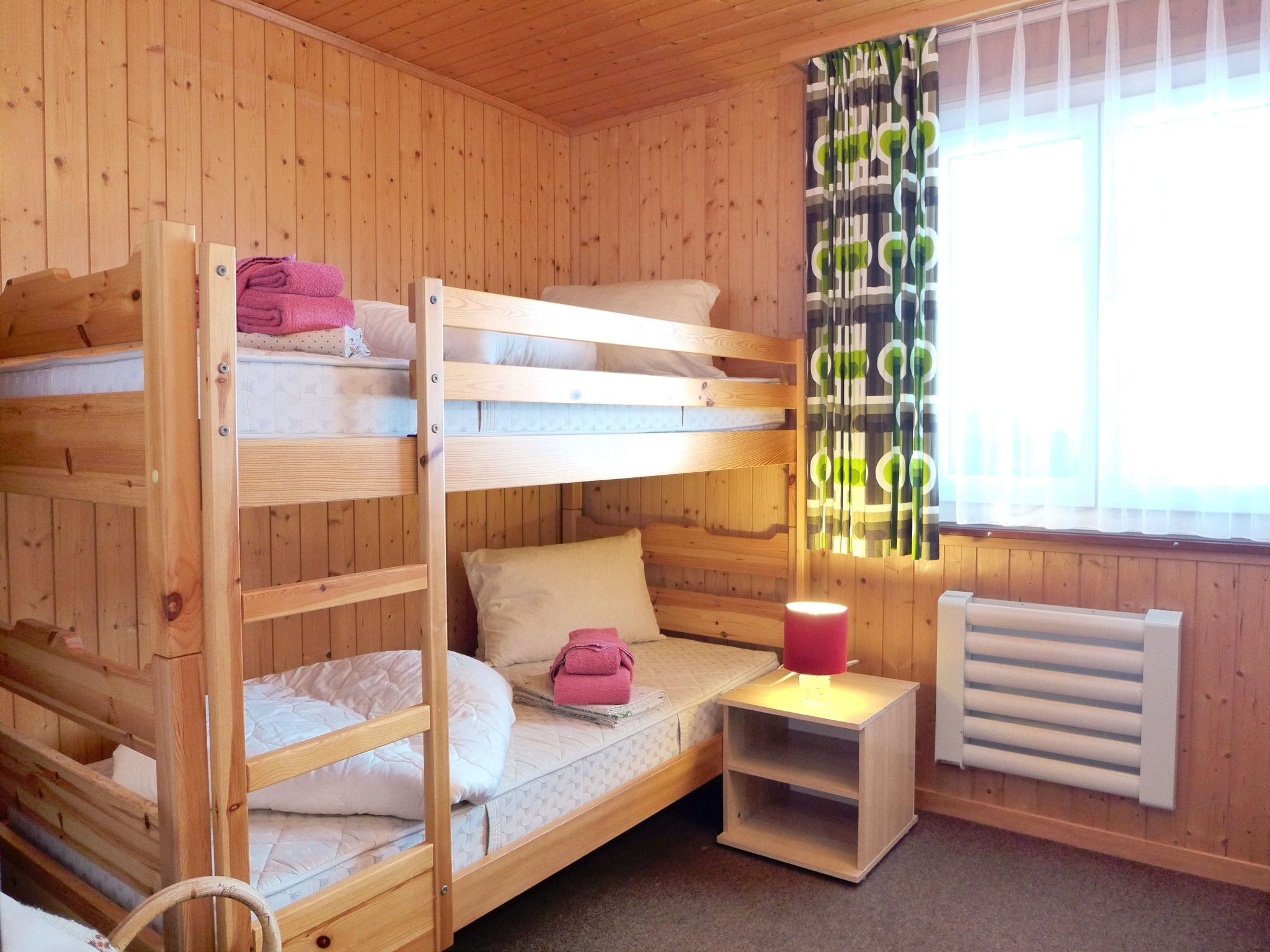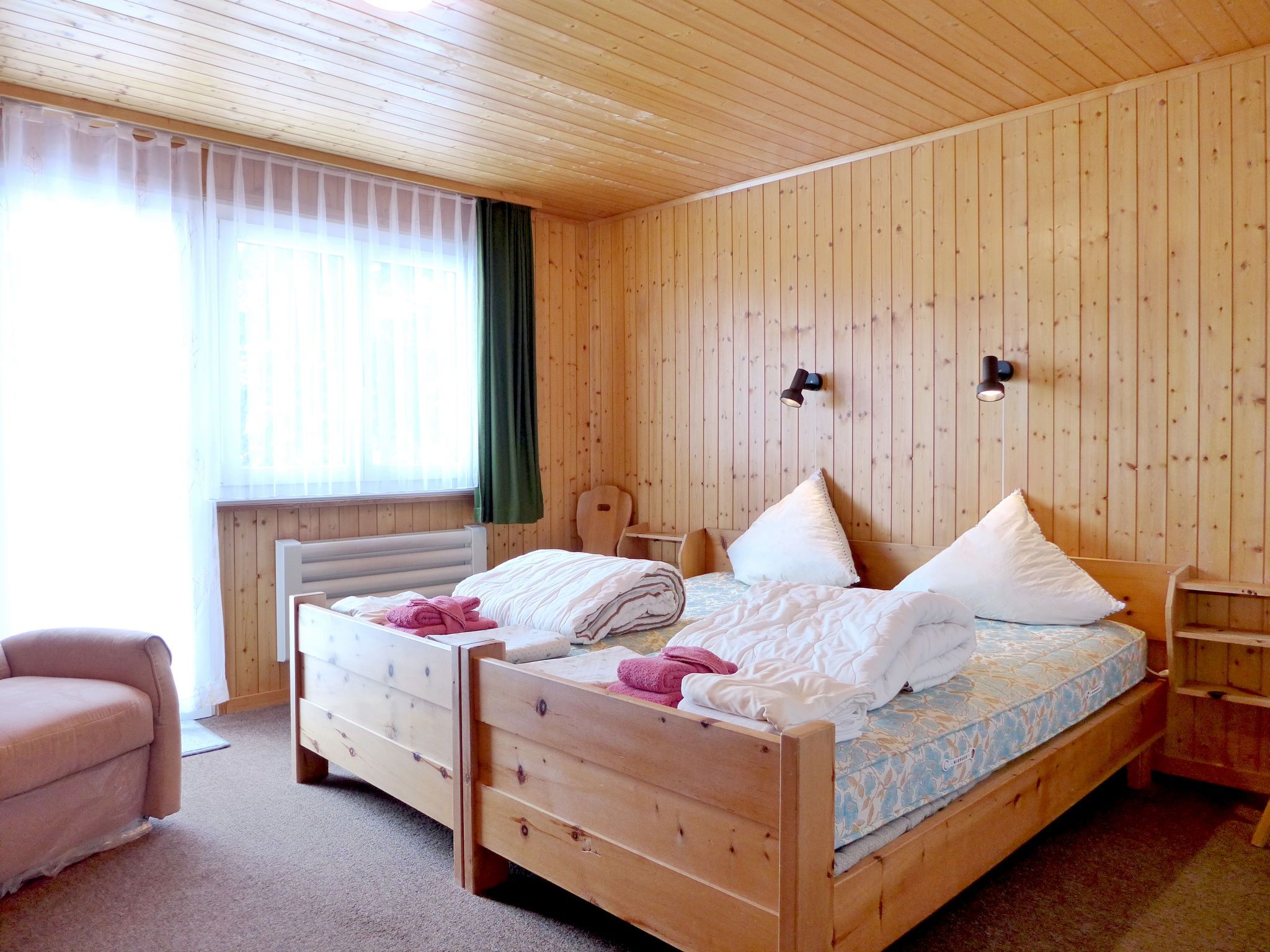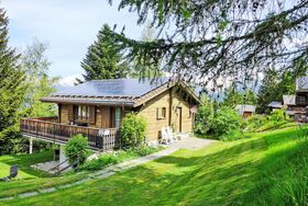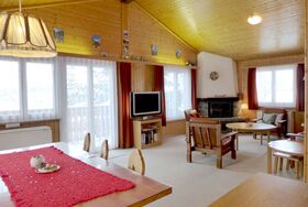 4-Zimmer-Chalet 100 m2 auf 2 Stockwerken. Geräumig und hell, sehr komfortabel und gemütlich eingerichtet: grosses Wohn-/Esszimmer mit Panoramafenster mit offenem Kamin, Essecke und Digital-TV. Ausgang zum Balkon. Offene Küche (4 Kochplatten, Backofen, Toaster, Wasserkocher, Mikrowelle, elektrische Kaffeemaschine, Racletteofen, Fondue Set (Käse)). Sep. WC. Unteres Geschoss: 1 Zimmer mit 1 Doppelbett (2 x 90 cm, Länge 200 cm), Waschbecken. 1 Zimmer mit 1 Doppelbett (2 x 90 cm, Länge 200 cm). Ausgang zum Gartensitzplatz. 1 Kinderzimmer mit 1 x 2 Etagenbetten (80 cm, Länge 190 cm), Waschbecken. Bad/WC. E-Heizung. Grosser Balkon, Gartensitzplatz. Balkonmöbel, Liegestühle. Herrliche Panoramasicht auf die Berge und die Landschaft. Bitte beachten: Nichtraucher-Haus. 1 kleines Haustier/Hund erlaubt. Rauchmelder, Feuerlöscher.
