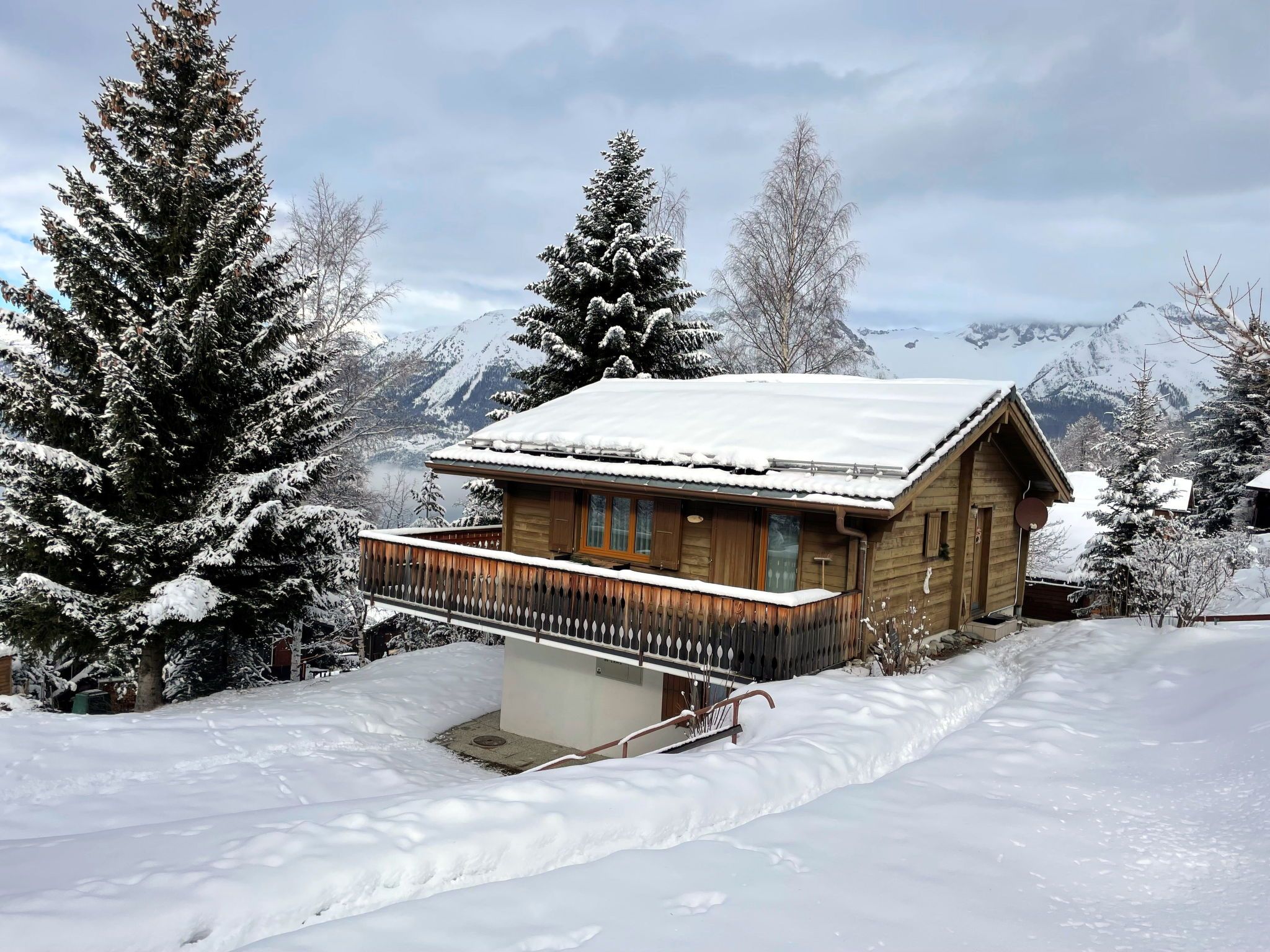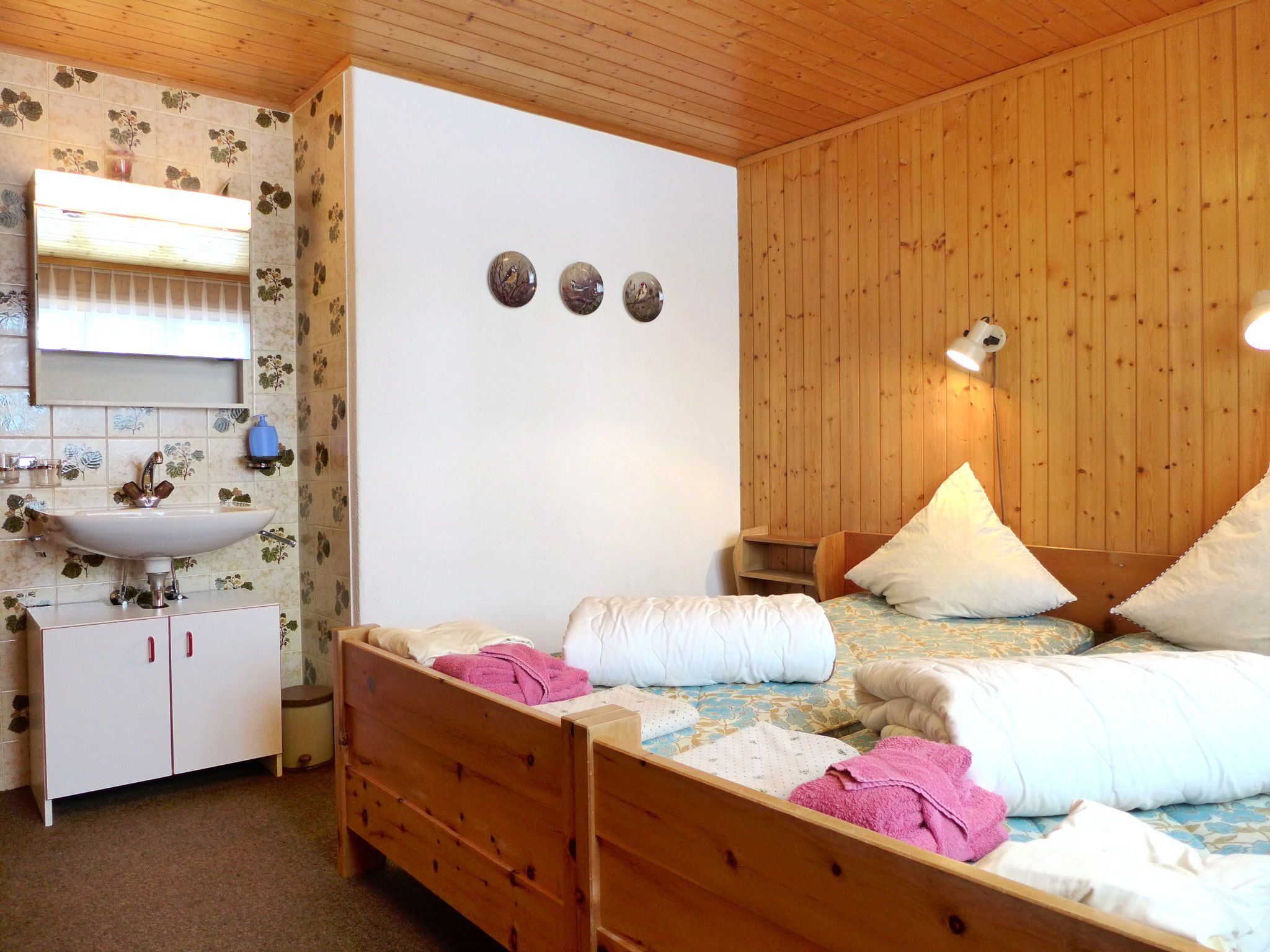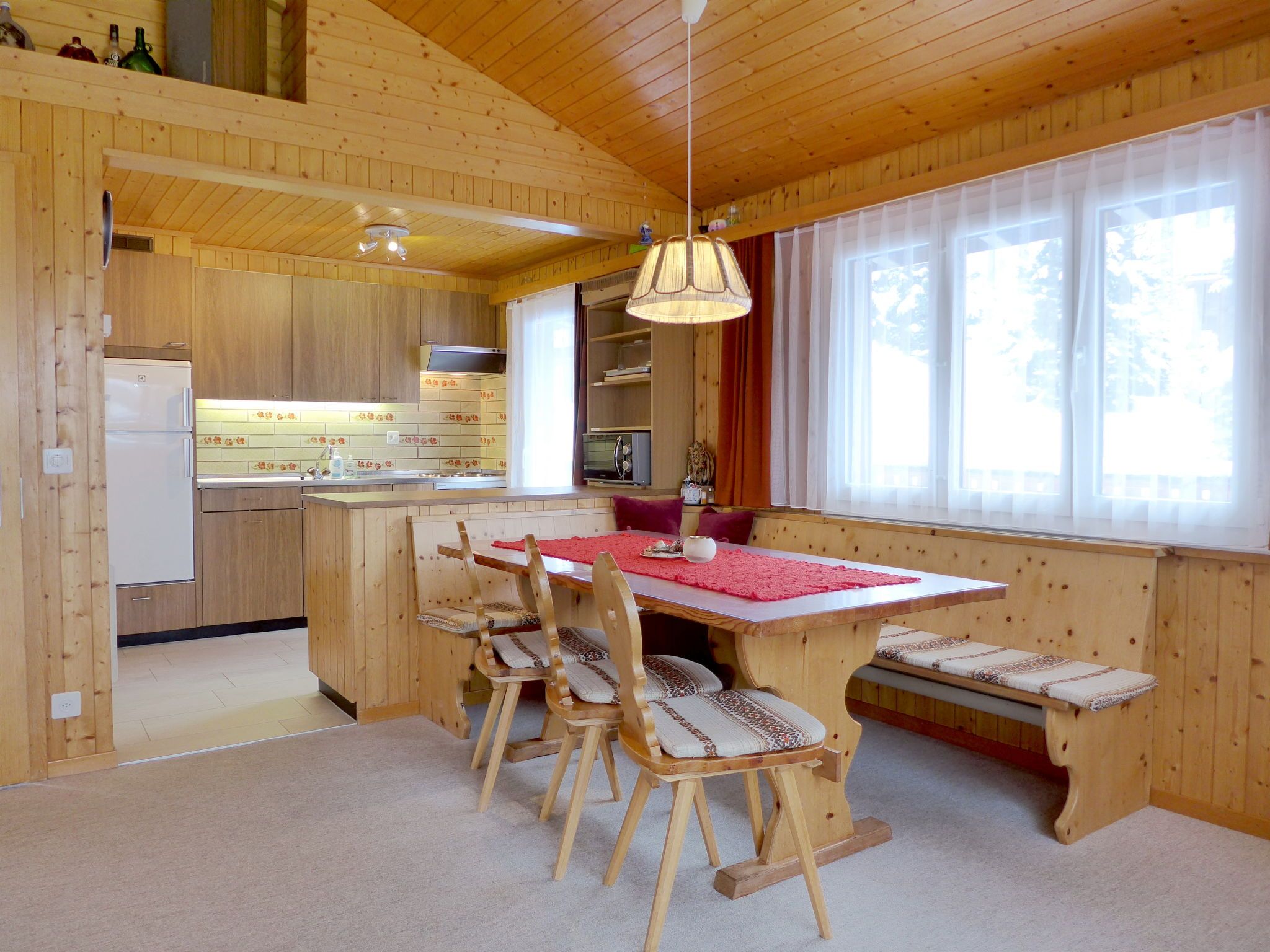 4-Zimmer-Chalet 100 m2 auf 2 Stockwerken. Geräumig und hell, sehr komfortabel und gemütlich eingerichtet: grosses Wohn-/Esszimmer mit Panoramafenster mit offenem Kamin, Essecke und Digital-TV. Ausgang zum Balkon. Offene Küche (4 Kochplatten, Backofen, Toaster, Wasserkocher, Mikrowelle, elektrische Kaffeemaschine, Racletteofen, Fondue Set (Käse)). Sep. WC. Unteres Geschoss: 1 Zimmer mit 1 Doppelbett (2 x 90 cm, Länge 200 cm), Waschbecken. 1 Zimmer mit 1 Doppelbett (2 x 90 cm, Länge 200 cm). Ausgang zum Gartensitzplatz. 1 Kinderzimmer mit 1 x 2 Etagenbetten (80 cm, Länge 190 cm), Waschbecken. Bad/WC. E-Heizung. Grosser Balkon, Gartensitzplatz. Balkonmöbel, Liegestühle. Herrliche Panoramasicht auf die Berge und die Landschaft. Bitte beachten: Nichtraucher-Haus. 1 kleines Haustier/Hund erlaubt. Rauchmelder, Feuerlöscher.