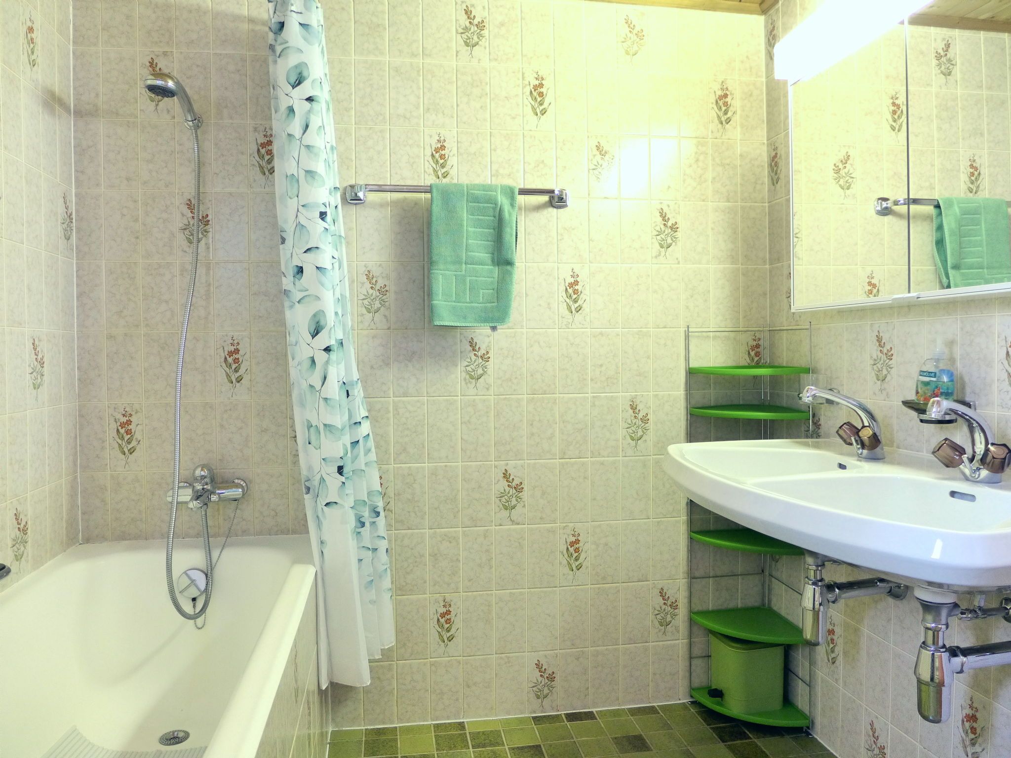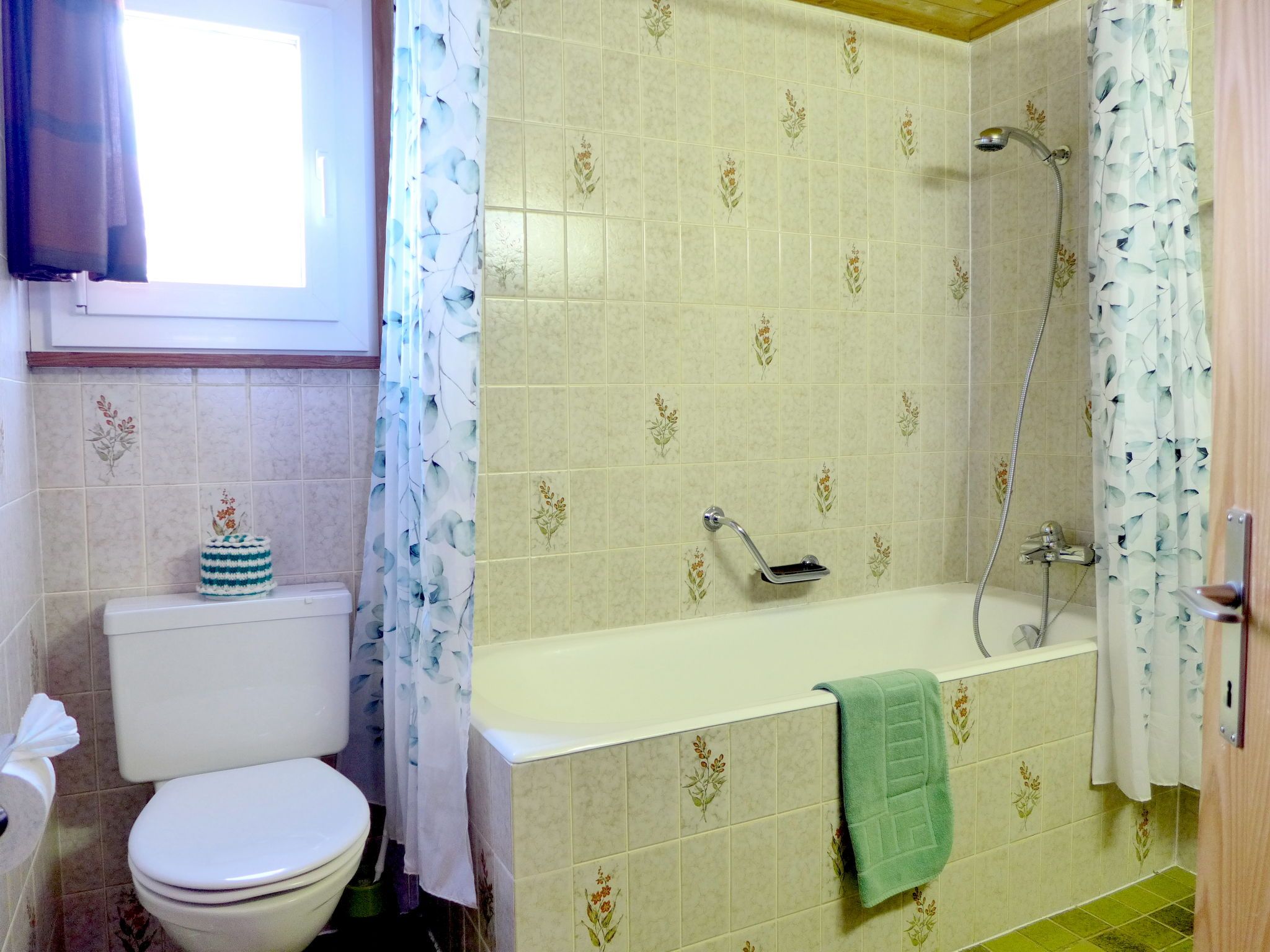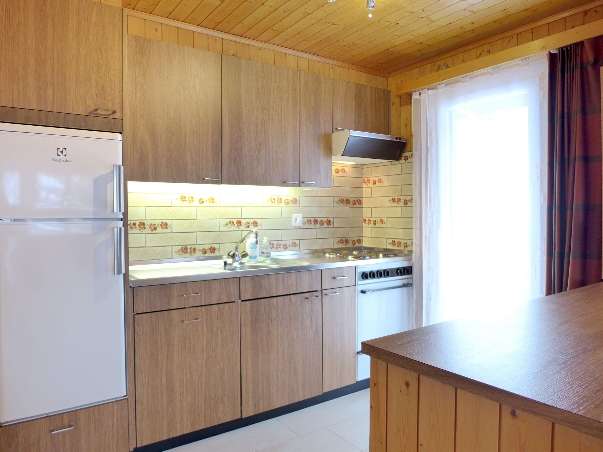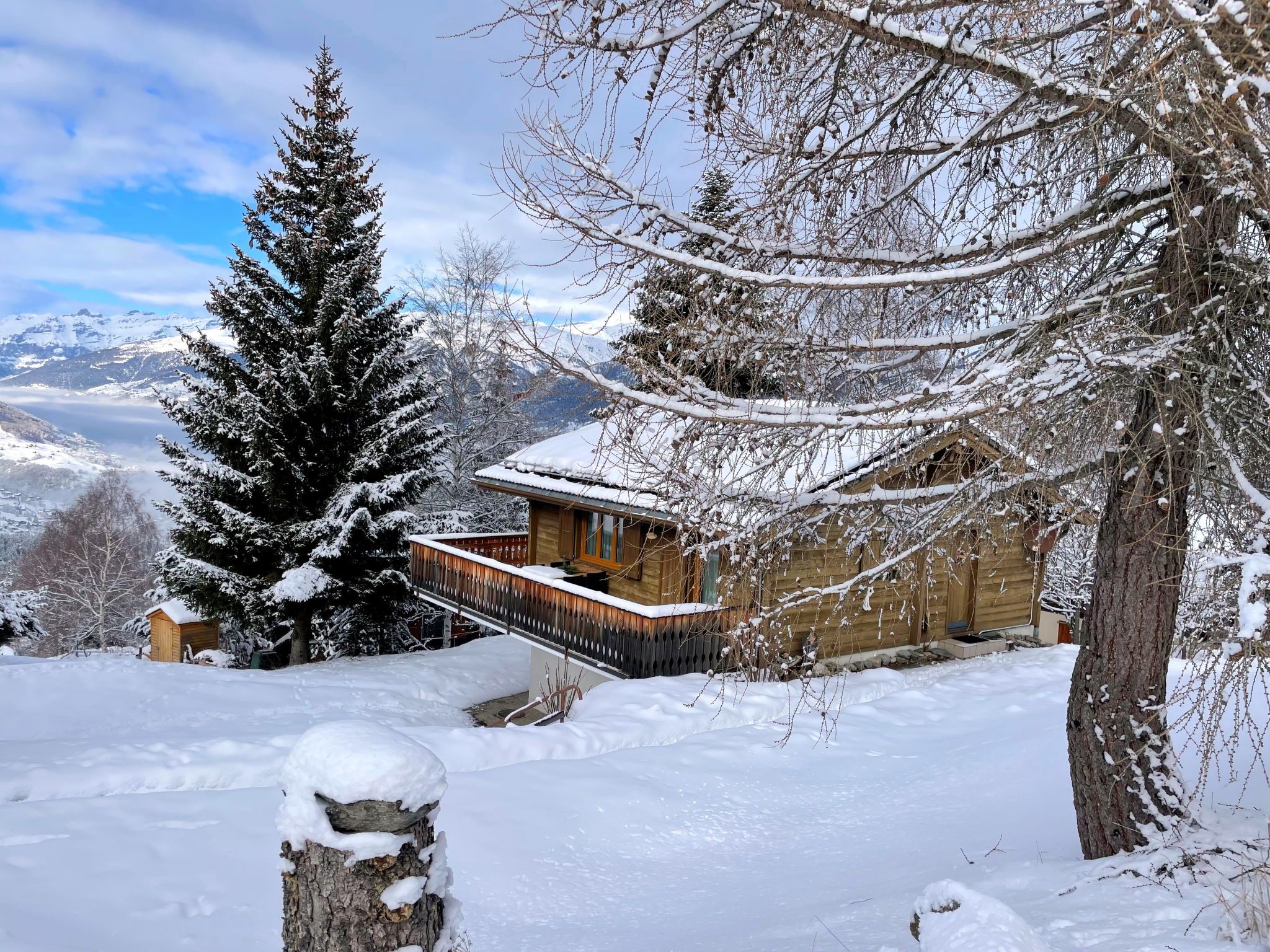 4-Zimmer-Chalet 100 m2 auf 2 Stockwerken. Geräumig und hell, sehr komfortabel und gemütlich eingerichtet: grosses Wohn-/Esszimmer mit Panoramafenster mit offenem Kamin, Essecke und Digital-TV. Ausgang zum Balkon. Offene Küche (4 Kochplatten, Backofen, Toaster, Wasserkocher, Mikrowelle, elektrische Kaffeemaschine, Racletteofen, Fondue Set (Käse)). Sep. WC. Unteres Geschoss: 1 Zimmer mit 1 Doppelbett (2 x 90 cm, Länge 200 cm), Waschbecken. 1 Zimmer mit 1 Doppelbett (2 x 90 cm, Länge 200 cm). Ausgang zum Gartensitzplatz. 1 Kinderzimmer mit 1 x 2 Etagenbetten (80 cm, Länge 190 cm), Waschbecken. Bad/WC. E-Heizung. Grosser Balkon, Gartensitzplatz. Balkonmöbel, Liegestühle. Herrliche Panoramasicht auf die Berge und die Landschaft. Bitte beachten: Nichtraucher-Haus. 1 kleines Haustier/Hund erlaubt. Rauchmelder, Feuerlöscher.