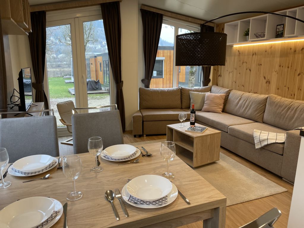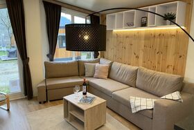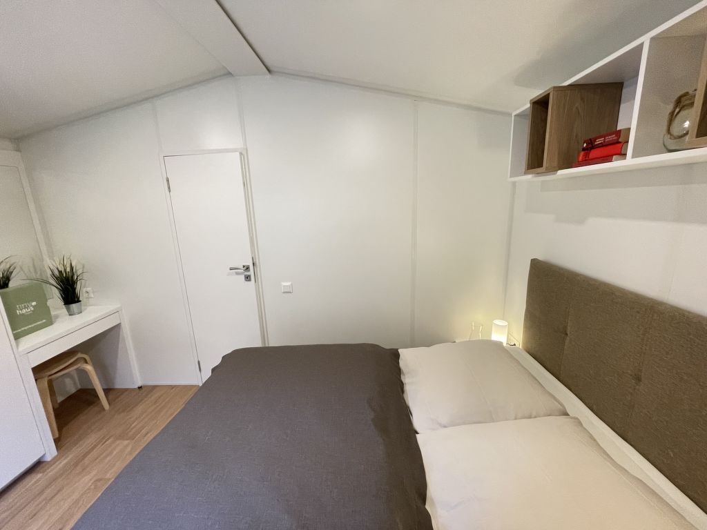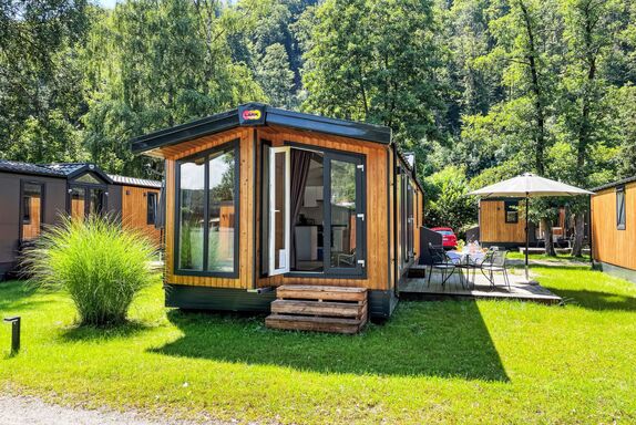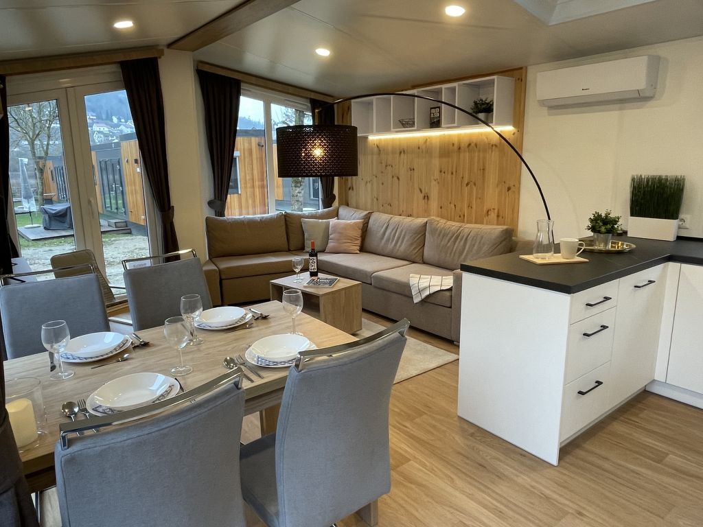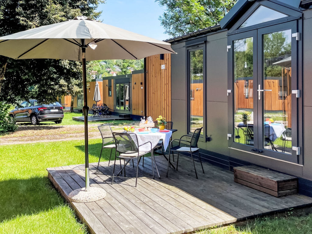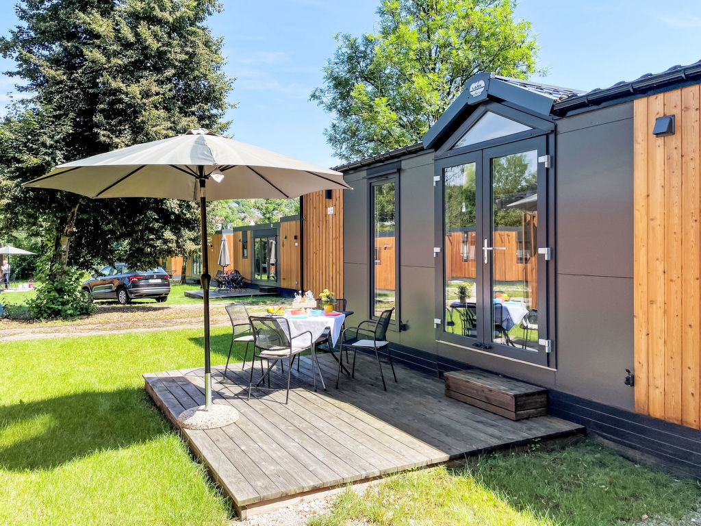 Tiny Haus Altmühlpanorama, 3-Zimmer-Mobilheim 48 m2. Komfortabel eingerichtet: Wohn-/Schlafzimmer mit 1 Doppeldiwanbett (160 cm, Länge 200 cm), Schwedenofen (nur Deko), Sat-TV und Klimaanlage. Ausgang zur Terrasse. 1 Zimmer mit 1 franz. Bett (160 cm, Länge 200 cm). 1 Zimmer mit 2 Betten (80 cm, Länge 200 cm). Offene Küche (Backofen, Geschirrspüler, 4 Glaskeramikplatten, Wasserkocher, elektrische Kaffeemaschine). Dusche, sep. WC. Kleine Terrasse. Terrassenmöbel. Zur Verfügung: Waschmaschine, Wäschetrockner. Parkplatz beim Haus. Bitte beachten: Nichtraucher-Unterkunft.