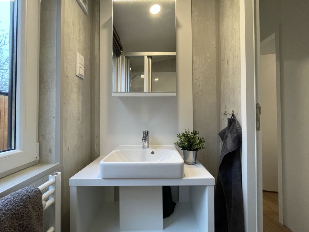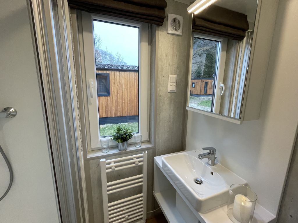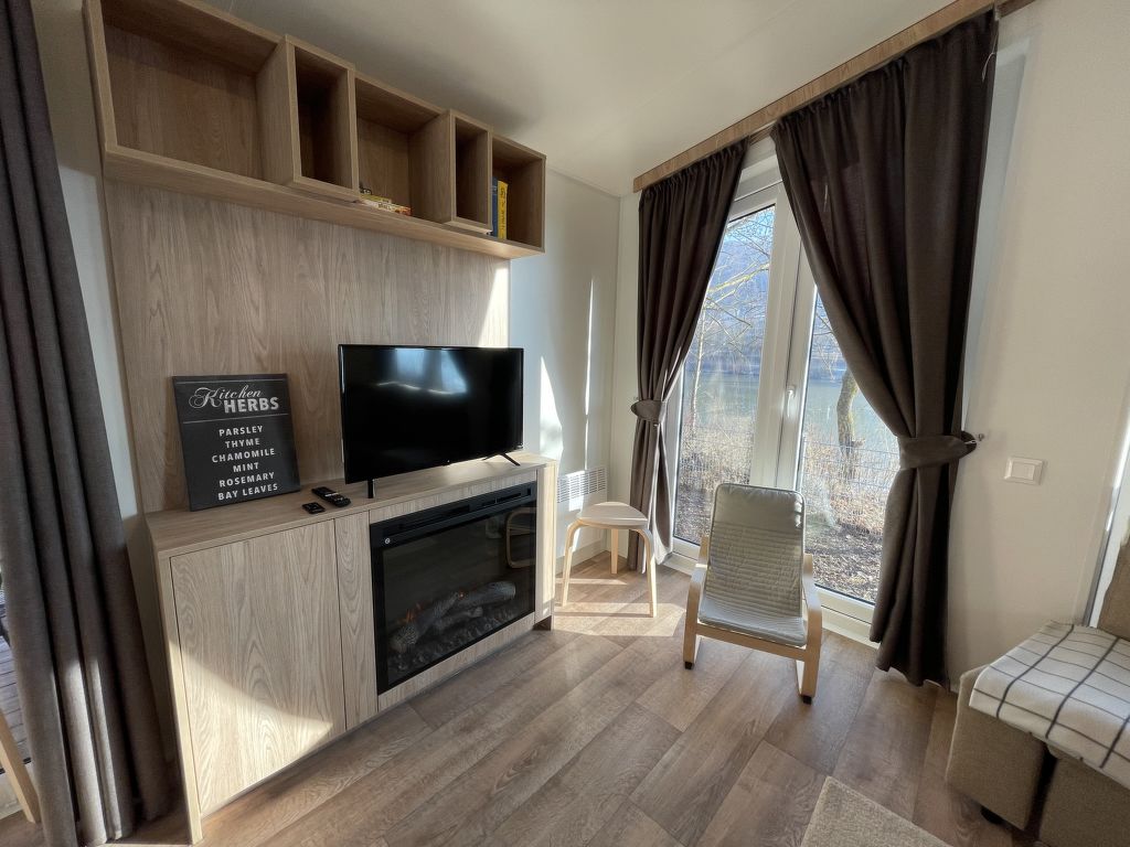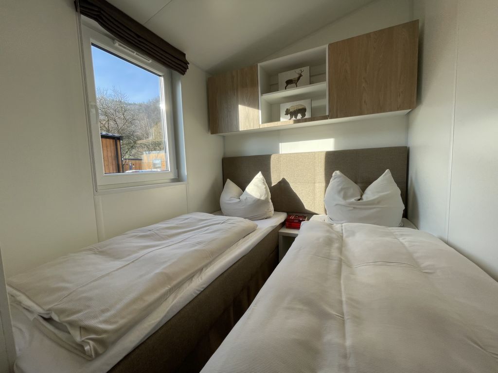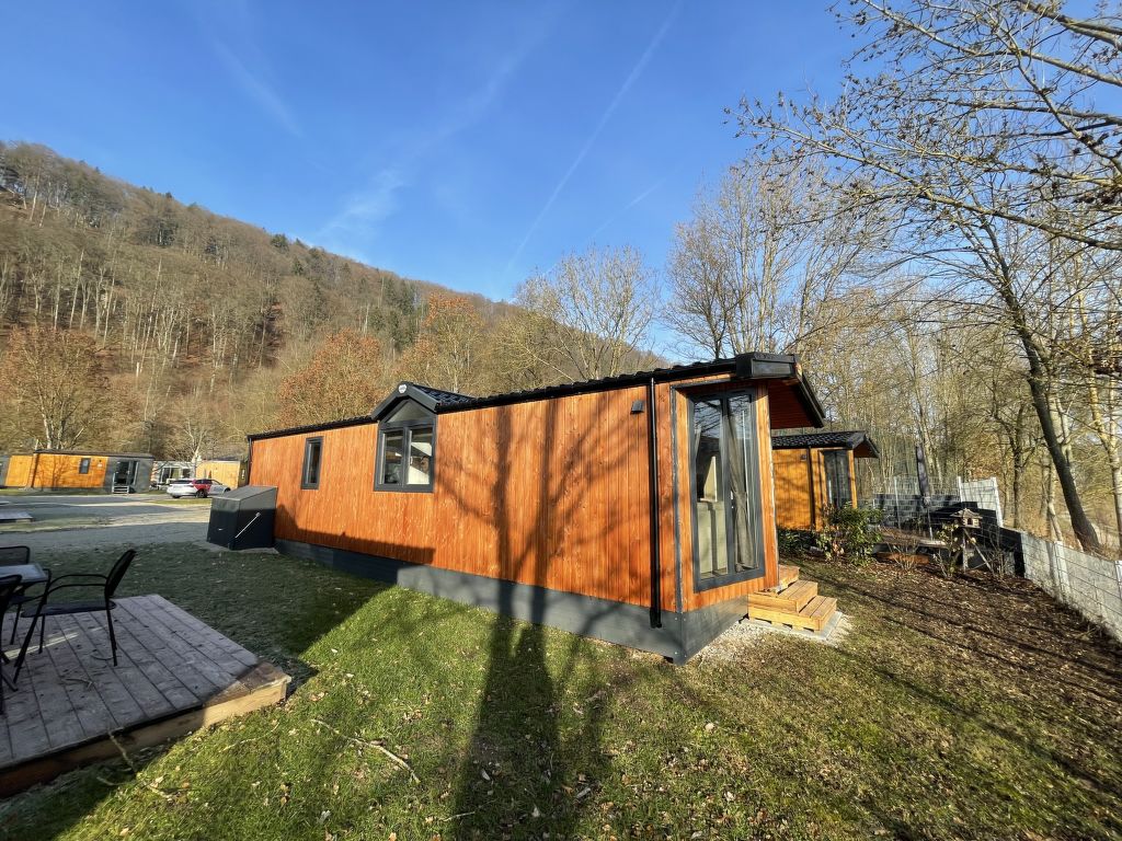 Tiny Haus Carolin, 3-Zimmer-Mobilheim 48 m2. Komfortabel eingerichtet: Wohn-/Schlafzimmer mit 1 Doppeldiwanbett (160 cm, Länge 200 cm), Schwedenofen (nur Deko), Sat-TV und Klimaanlage. Ausgang zur Terrasse. 1 Zimmer mit 1 franz. Bett (160 cm, Länge 200 cm). 1 Zimmer mit 2 Betten (80 cm, Länge 200 cm). Offene Küche (Backofen, Geschirrspüler, 4 Glaskeramikplatten, Wasserkocher, elektrische Kaffeemaschine). Dusche, sep. WC. Kleine Terrasse. Terrassenmöbel. Zur Verfügung: Waschmaschine, Wäschetrockner. Internet (WLAN, gratis). Parkplatz (1 Auto) beim Haus. Bitte beachten: Nichtraucher-Unterkunft. Maximal 2 Haustiere/Hunde erlaubt. Rauchmelder, Feuerlöscher.