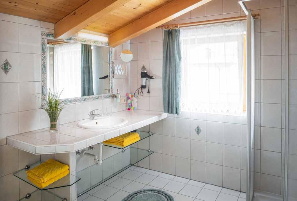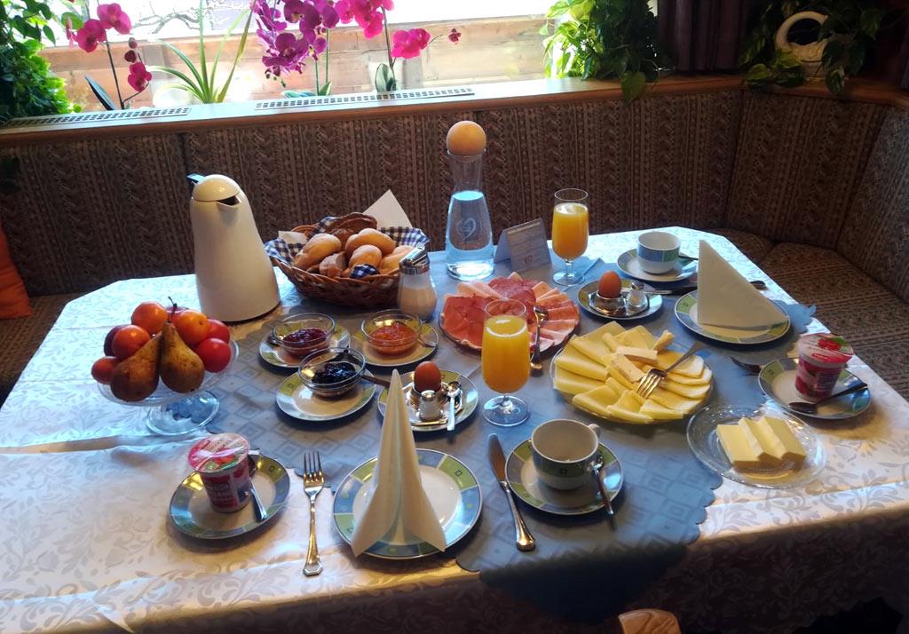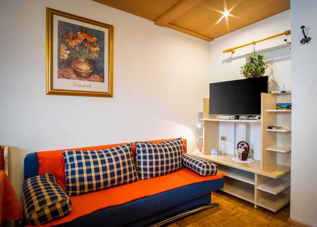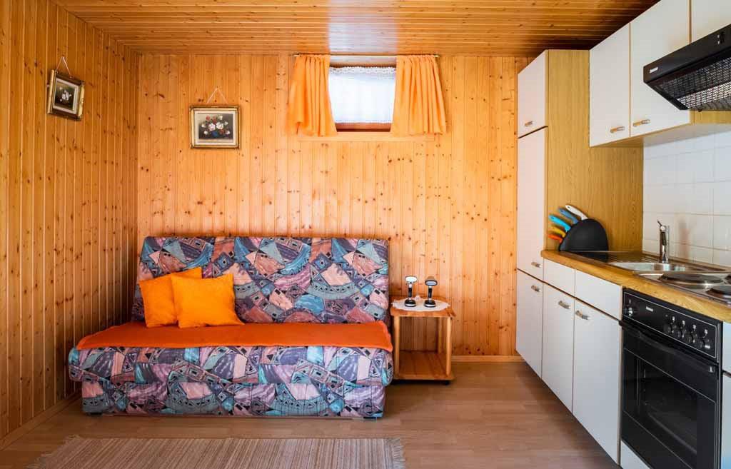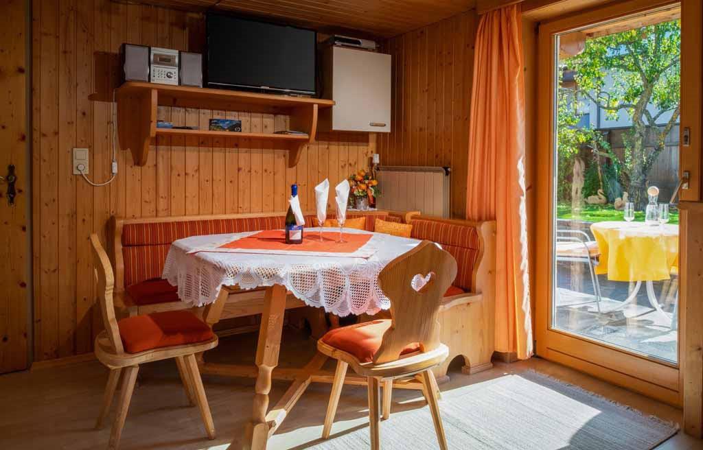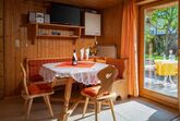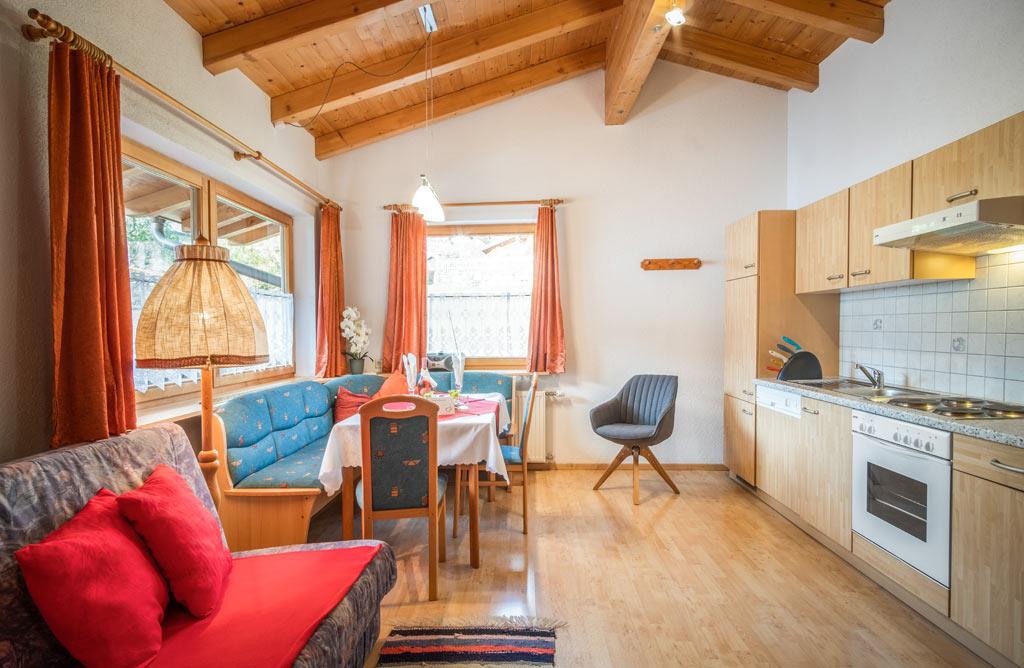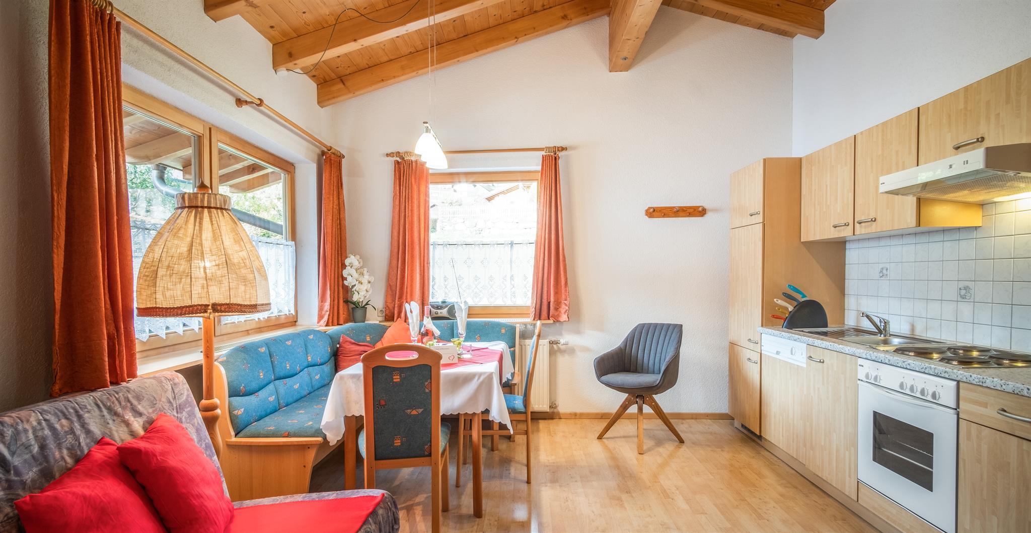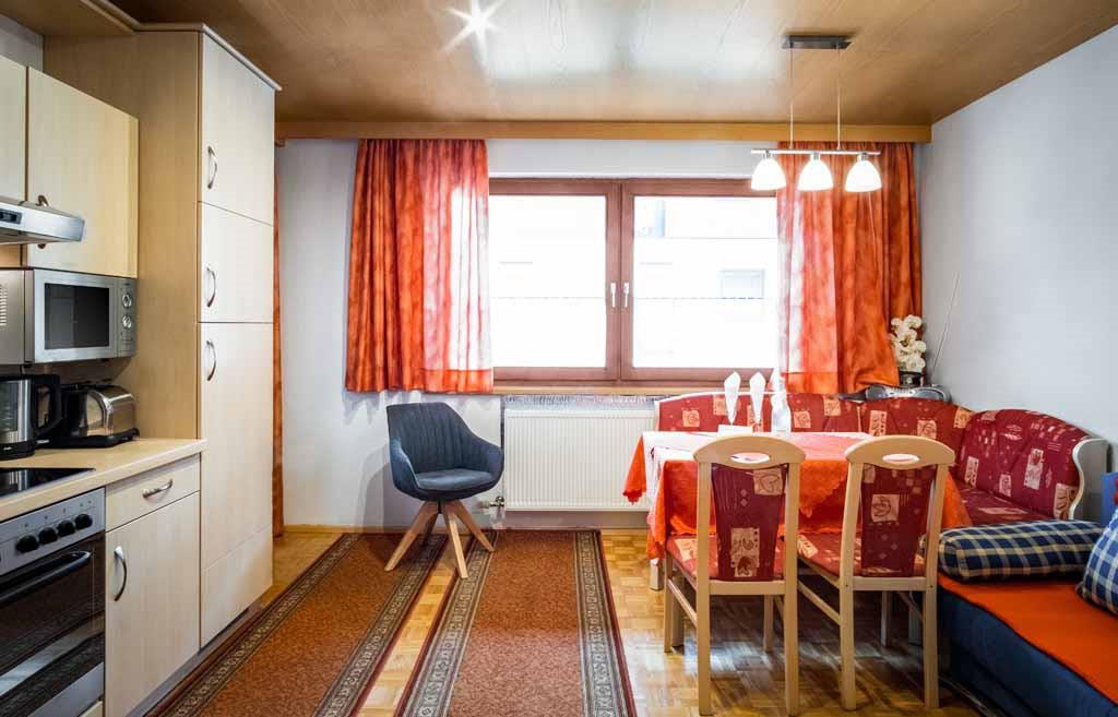 Heimelige Wohnküche mit gemütlicher Sitzecke & Couch, SAT-TV & gratis WLAN. Ausgestattet mit Backrohr, Geschirrspüler, Toaster, Wasserkocher, ... . Herrlicher Ausblick auf die umliegende Bergwelt. Wir vermieten auch Zimmer mit Frühstück.