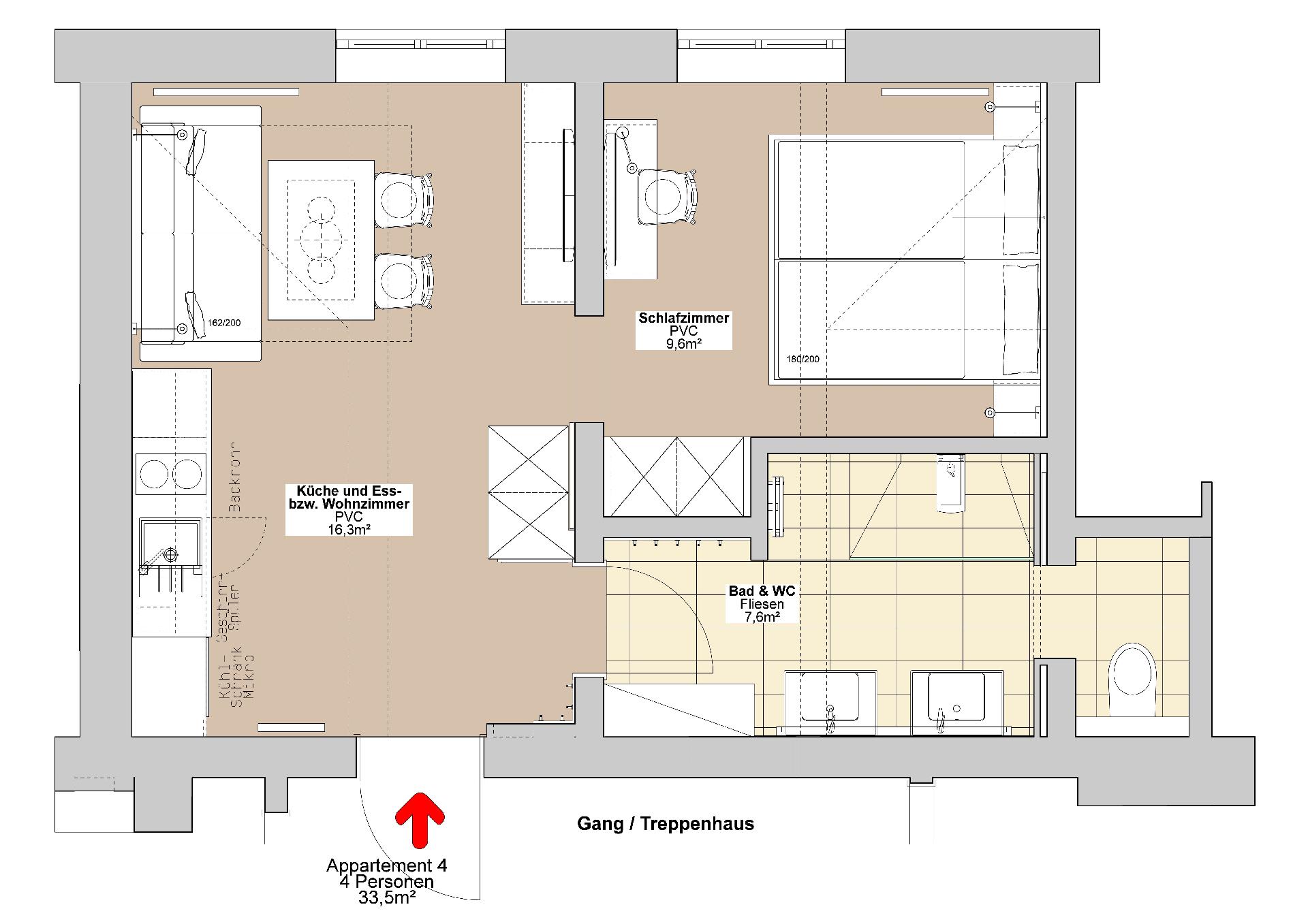 Die Ferienwohnung im zweiten Stock umfasst eine Fläche von ca. 34m² und ist optimal für bis zu vier Personen ausgestattet. Das separate Schlafzimmer verfügt über ein gemütliches Doppelbett, während der kombinierte Wohn- und Schlafraum mit einem praktischen Schlafsofa ausgestattet ist. Zur vollständigen Kücheneinrichtung gehören eine Spülmaschine, Ceranfeld, Backofen, Mikrowelle, ein Kühlschrank mit Gefrierfach, eine Filterkaffeemaschine und ein Wasserkocher. Darüber hinaus sind ein Safe und SAT-TV vorhanden. Das moderne Badezimmer bietet ein Doppelwaschbecken, eine Dusche, Handtuchtrockner, Fön sowie ein separates WC.