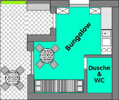 CHARAKTERISTIK: Einfach, aber zum Wohlfühlen für alle die die Atmosphäre eines Campingplatzes nicht missen wollen sind unsere einfach ausgestatteten Camping-Bungalows. Die Bungalows haben eine Größe von 30 m² und sind für bis zu 4 Personen gedacht.