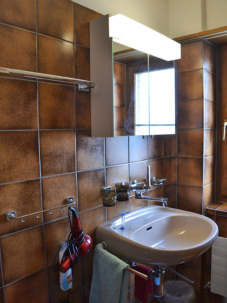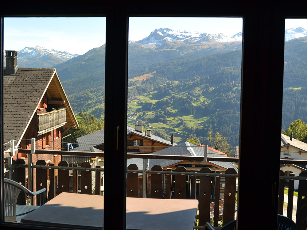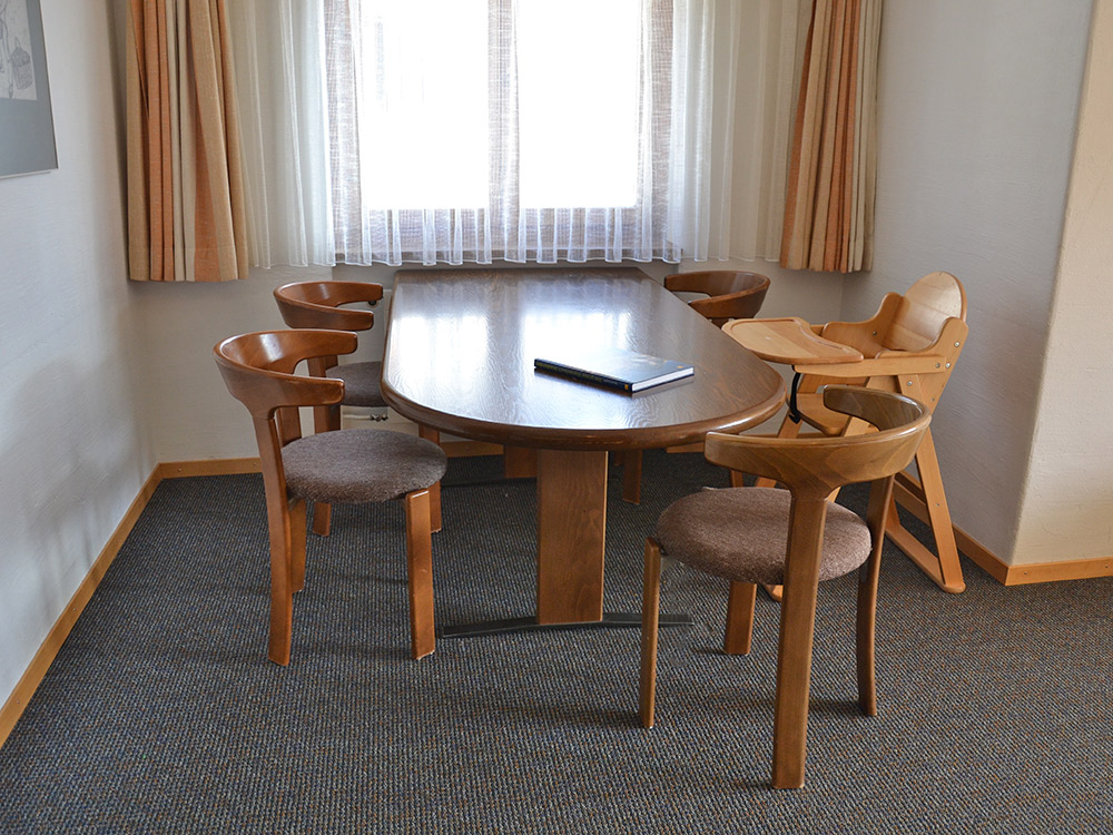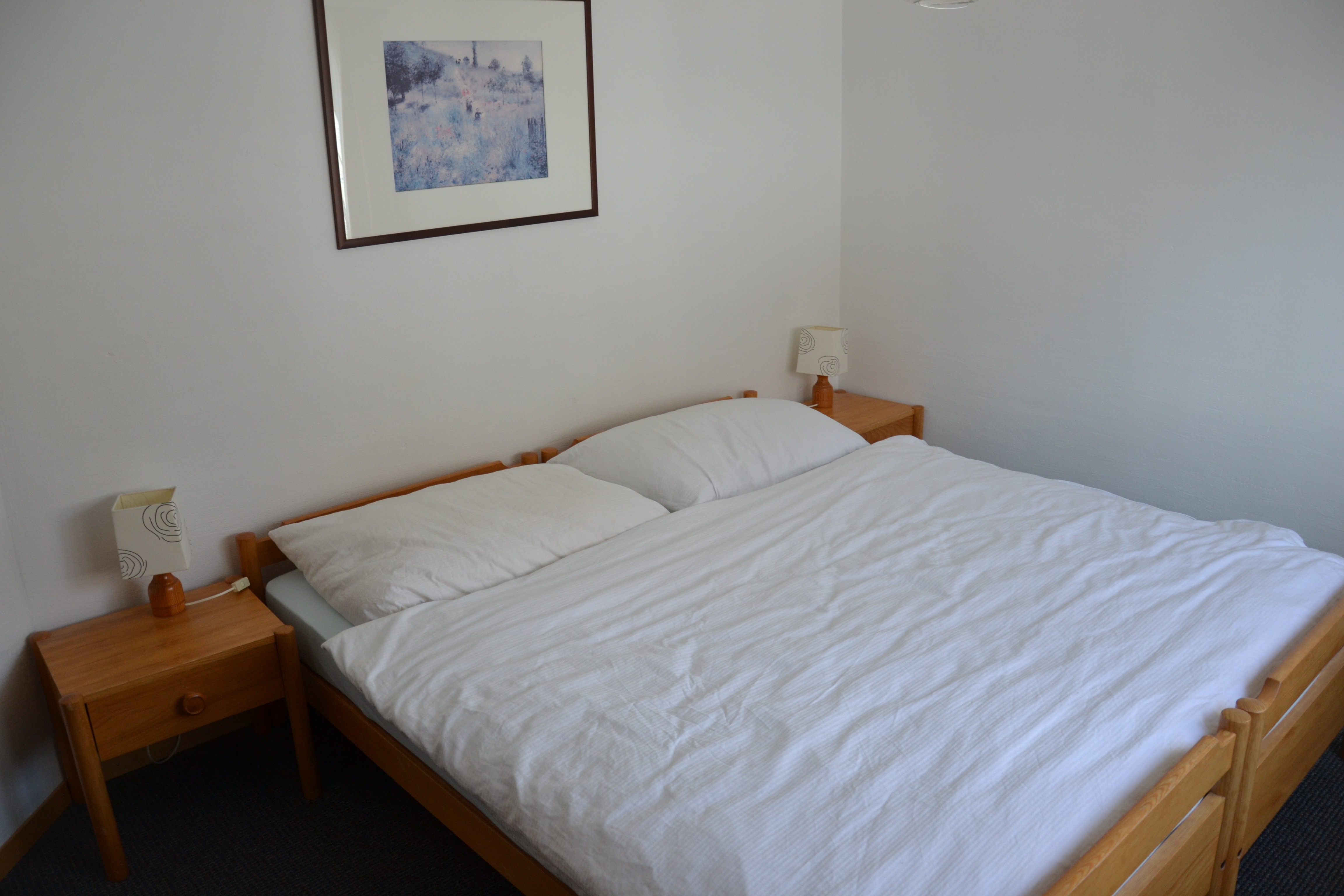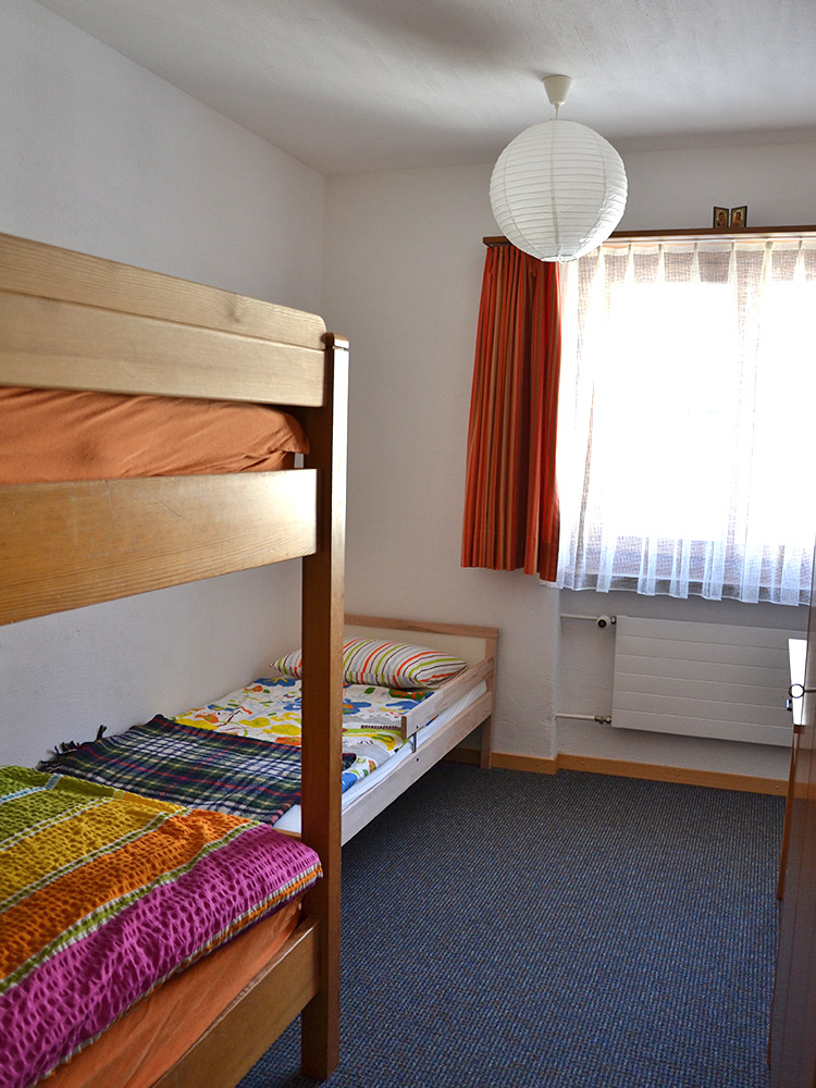 Die 3 ½ Zimmer Wohnung befindet sich in der 2. Etage und verfügt über ein grosszügiges Wohnzimmer (TV, DVD, Stereo) mit Balkon sowie 2 Schlafzimmer. 1 Schlafzimmer ist mit einem Etagenbett (200x90), einem separaten Kinderbett (120x60), einem Kleiderschrank sowie einem kleinen Schreibtisch ausgestattet ist. Das 2. Schlafzimmer ist mit einem Doppelbett (180x200), 2 Nachttischchen und einem Kleiderschrank ausgestattet. Zusätzliche Schlafmöglichkeiten (2 Schrankbetten) befinden sich im Wohnzimmer. Das Wohnzimmer sowie der angrenzende Balkon bieten einen freien Blick ins Tal und die benachbarten Berge. Die helle Essnische für 6 Personen grenzt an die offene, vollausgestattete Küche. Eine geräumige Garderobe befindet sich im Eingangsbereich. WC und Badezimmer sind getrennt.