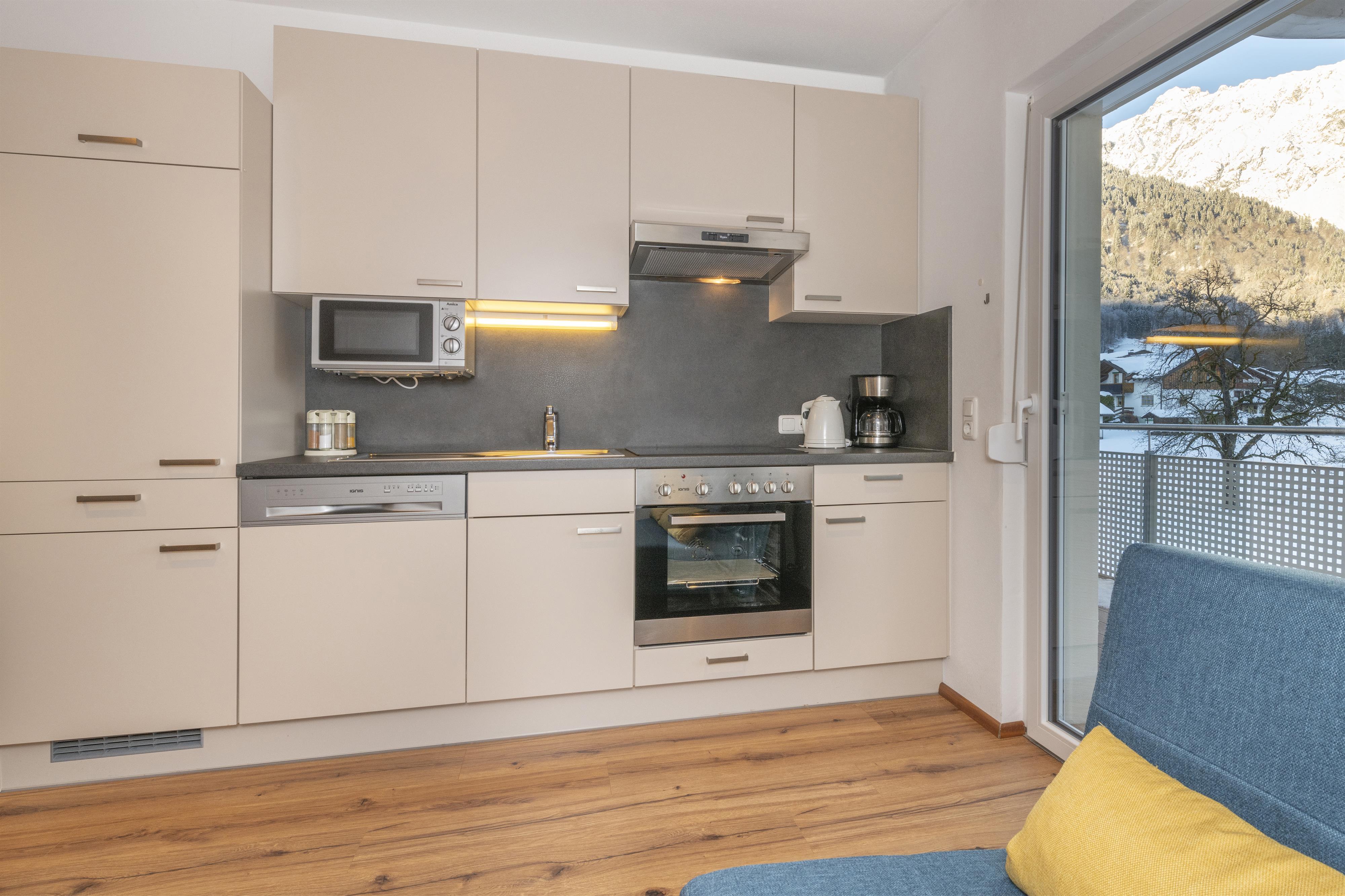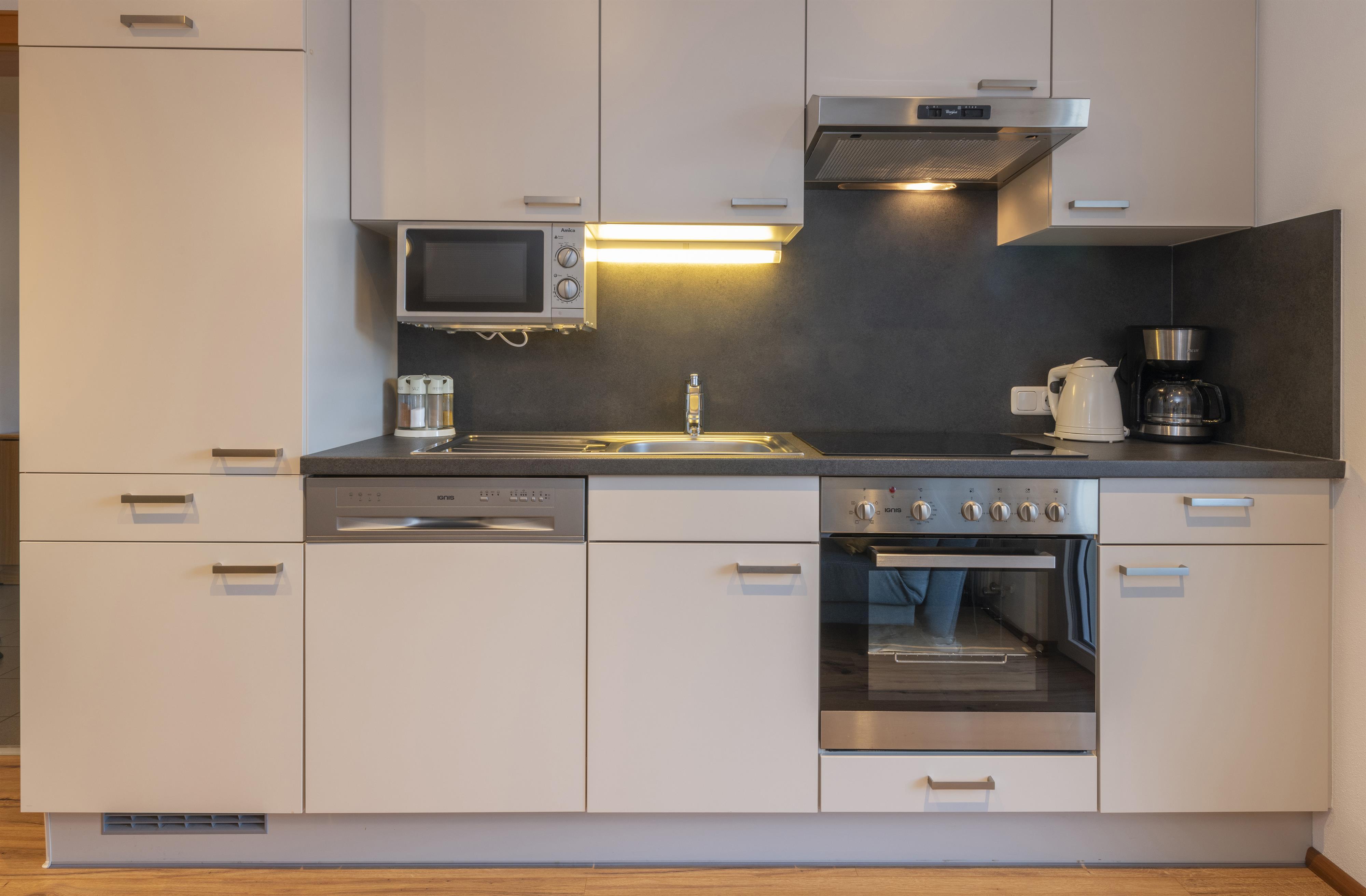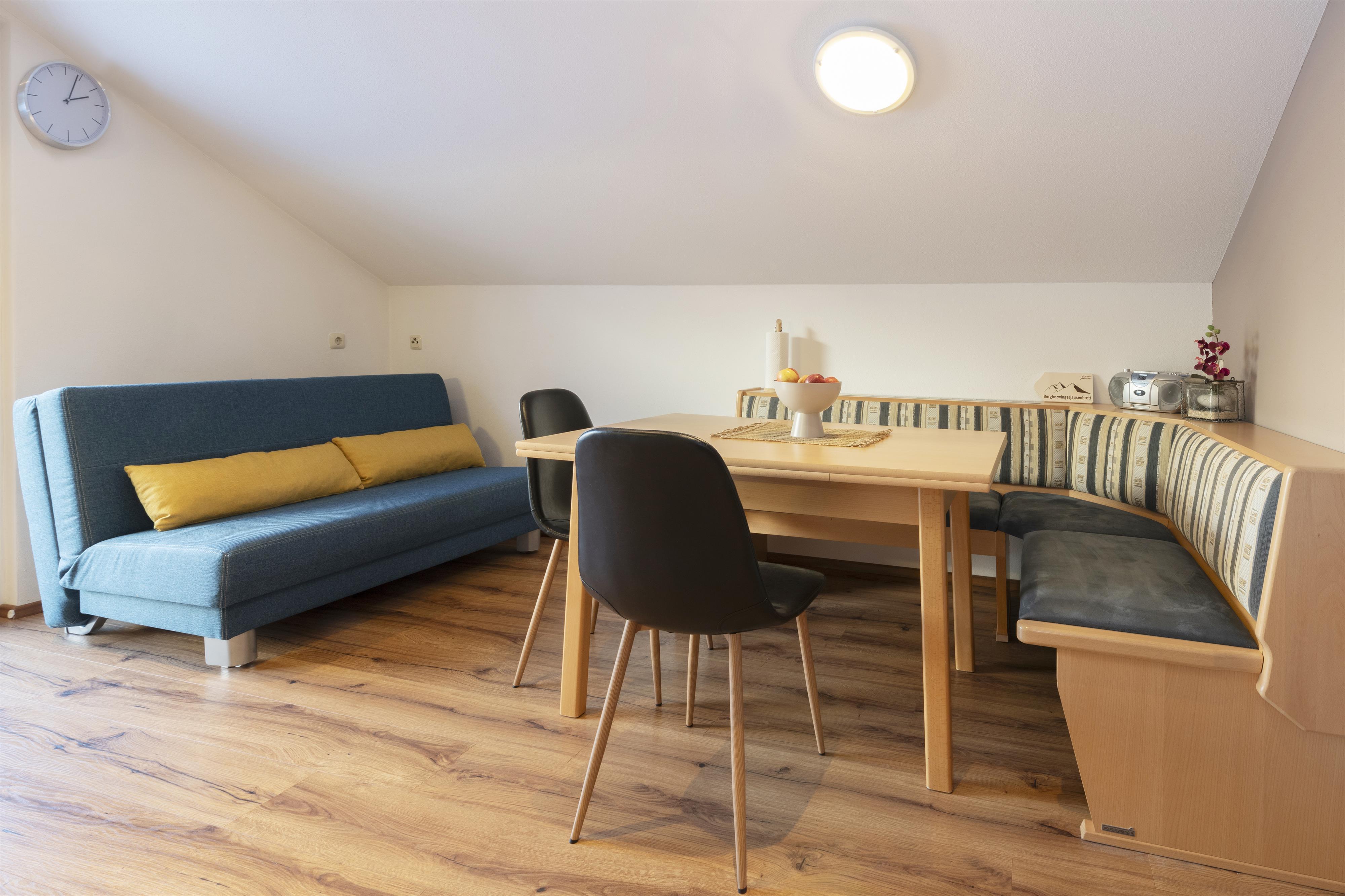 Die Wohnung liegt im 1.OG,ist 56m² groß:Eine Wohnküche mit Essecke und Couch, 2 Schlafzimmer (Doppelbett, Doppelbett u.Einzelbett), Dusche/WC, Vorraum. Die Küche ist komplett eingerichtet mit Küchenzeile,Geschirr,Geschirrspüler,Sat-TV,Radio mit CD-Player, Kaffeemaschine,Wasserkocher,Mikrowelle,Toaster,Kühlschrank mit Eisfach, E-Herd mit Ceranfeld und Backofen. Balkonmöbel, Bettwäsche, Handtücher.