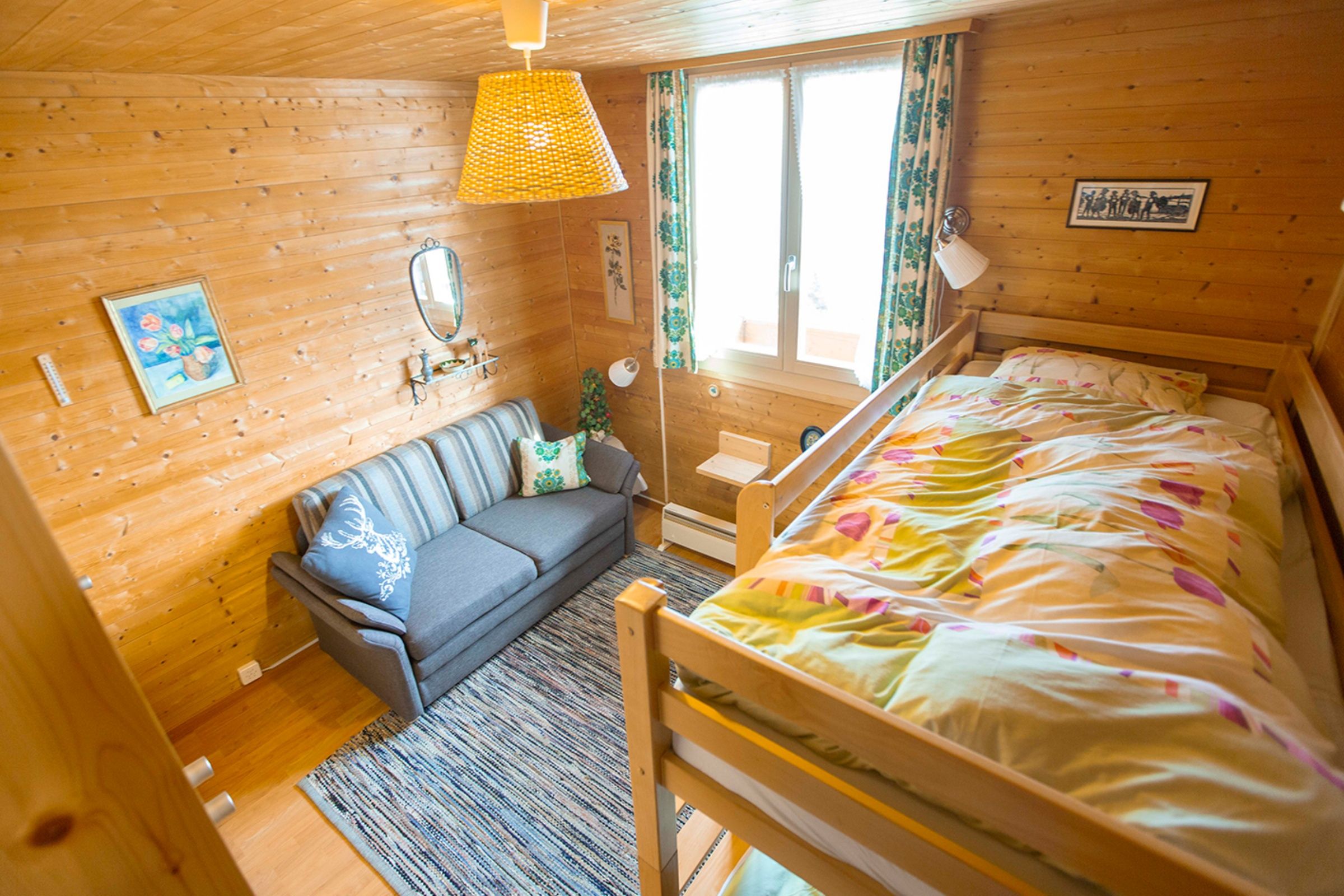 Ein Schlafzimmer mit Sofa- und Etagenbett und ein Schlaf/Wohnzimmer mit zwei Einzelbetten
