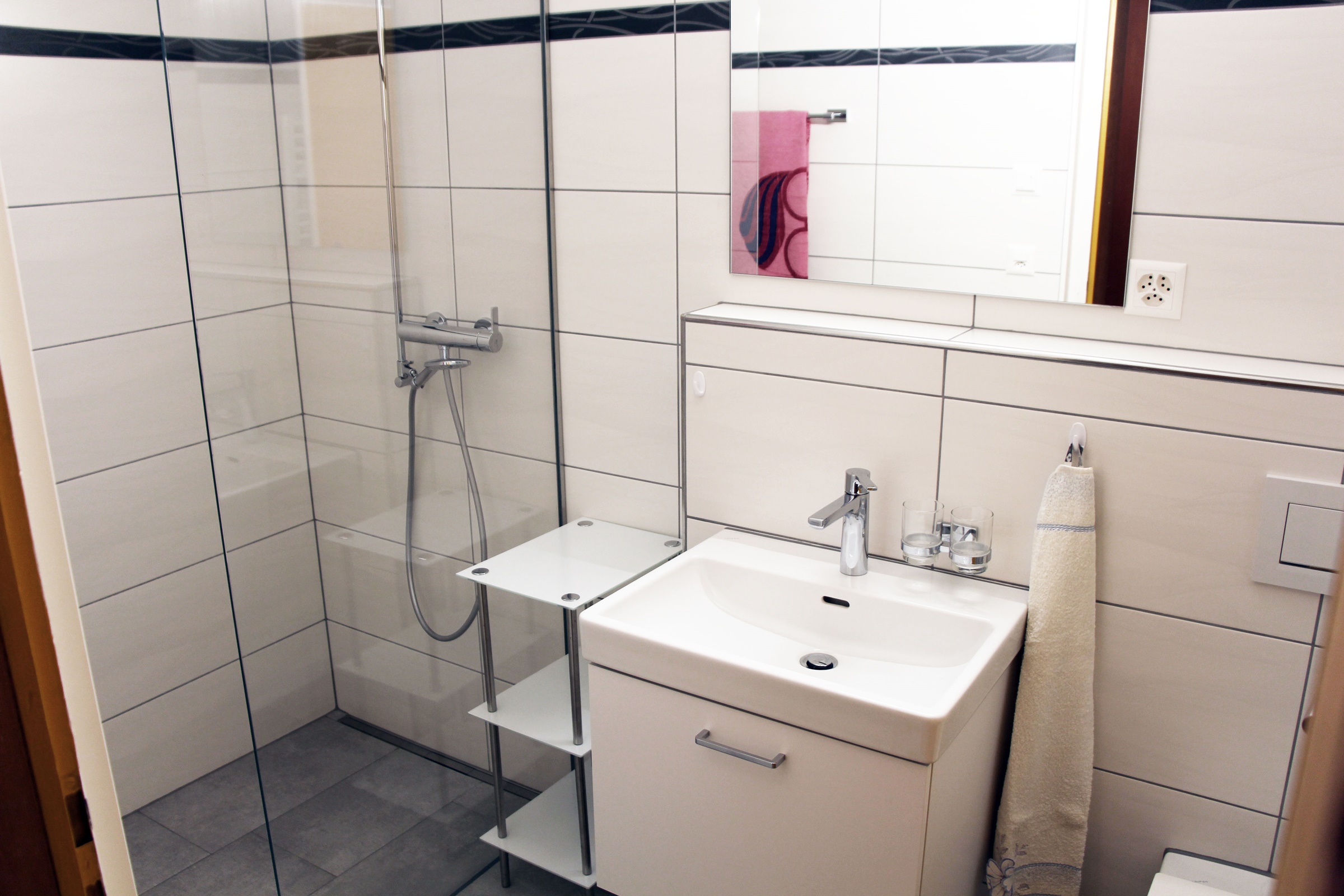 Ein neu renoviertes Badezimmer mit Dusche, Lavabo und WC.Wohnzimmer