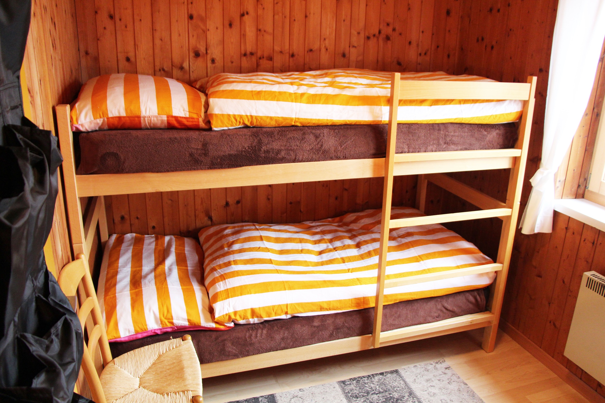 Die Ferienwohnung verfügt über 2 Schlafzimmer mit 1x Etagenbett (90cm x 190cm) und 1x Doppelbett (180cm x 200cm)ein Badezimmer mit Dusche, Lavabo und WCein halboffenes Wohn-/ Esszimmereine voll ausgestattete KücheInneneinrichtung & Technik
