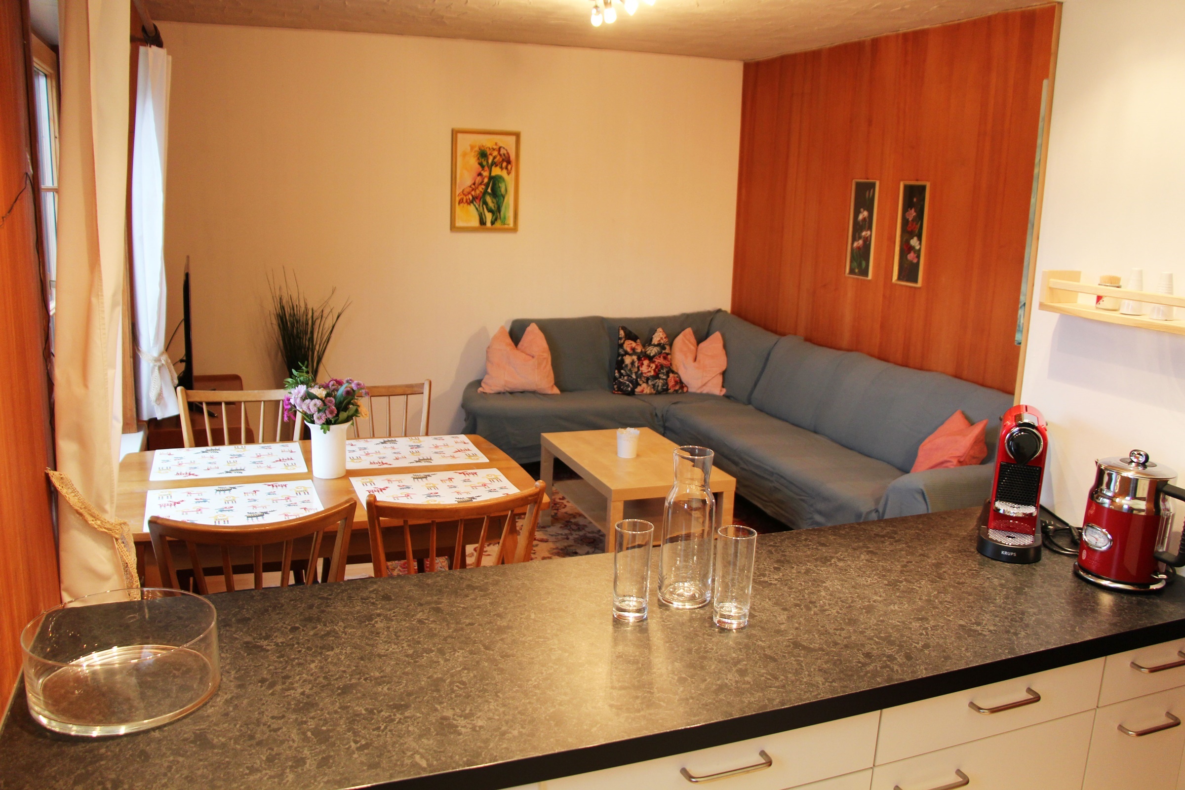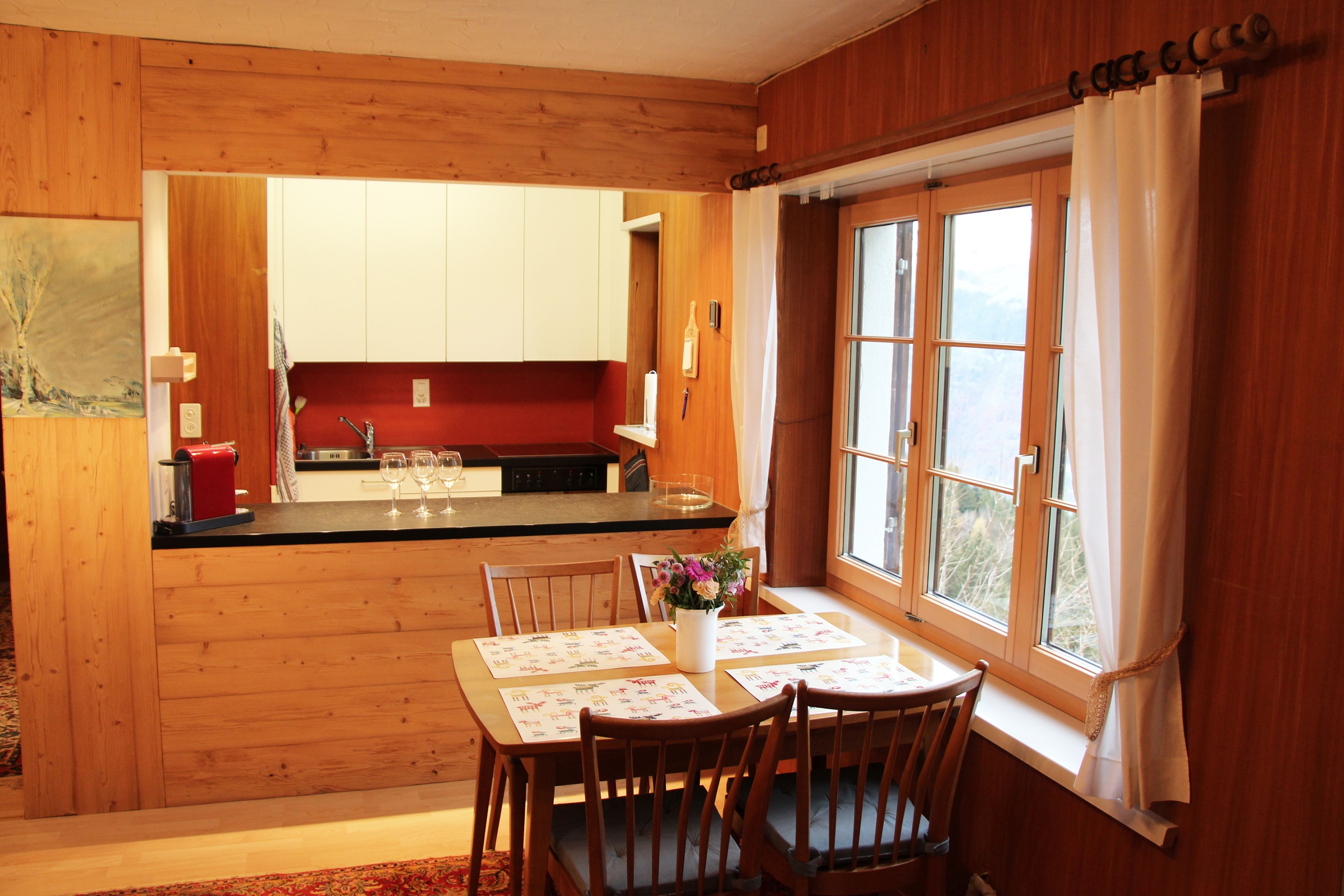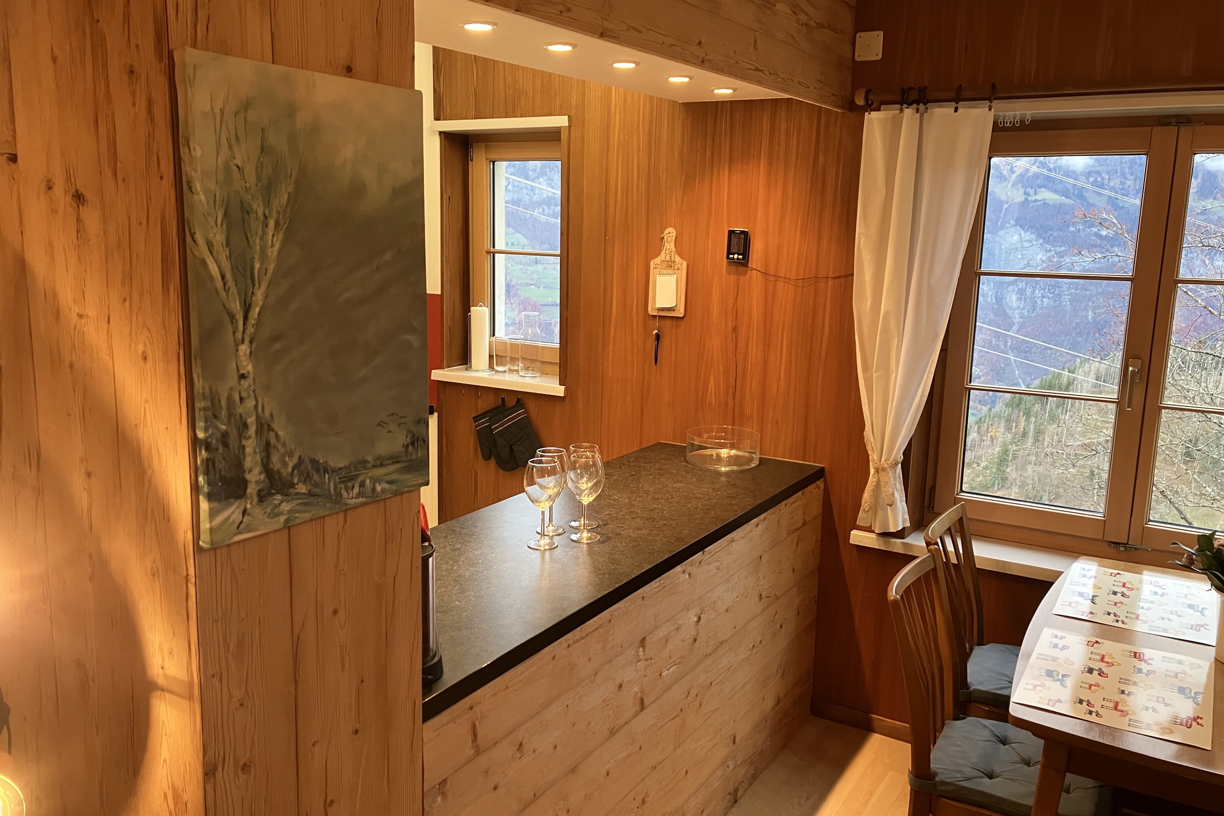 Die Küche verfügt über einen Glaskeramikherd, Backofen, Toaster, Kaffeemaschine (Nespresso), Wasserkocher, Kühlschrank mit einem Gefrierfach, Fondue-Caquelon, Raclette- und Tischgrill-Ofen.Inneneinrichtung