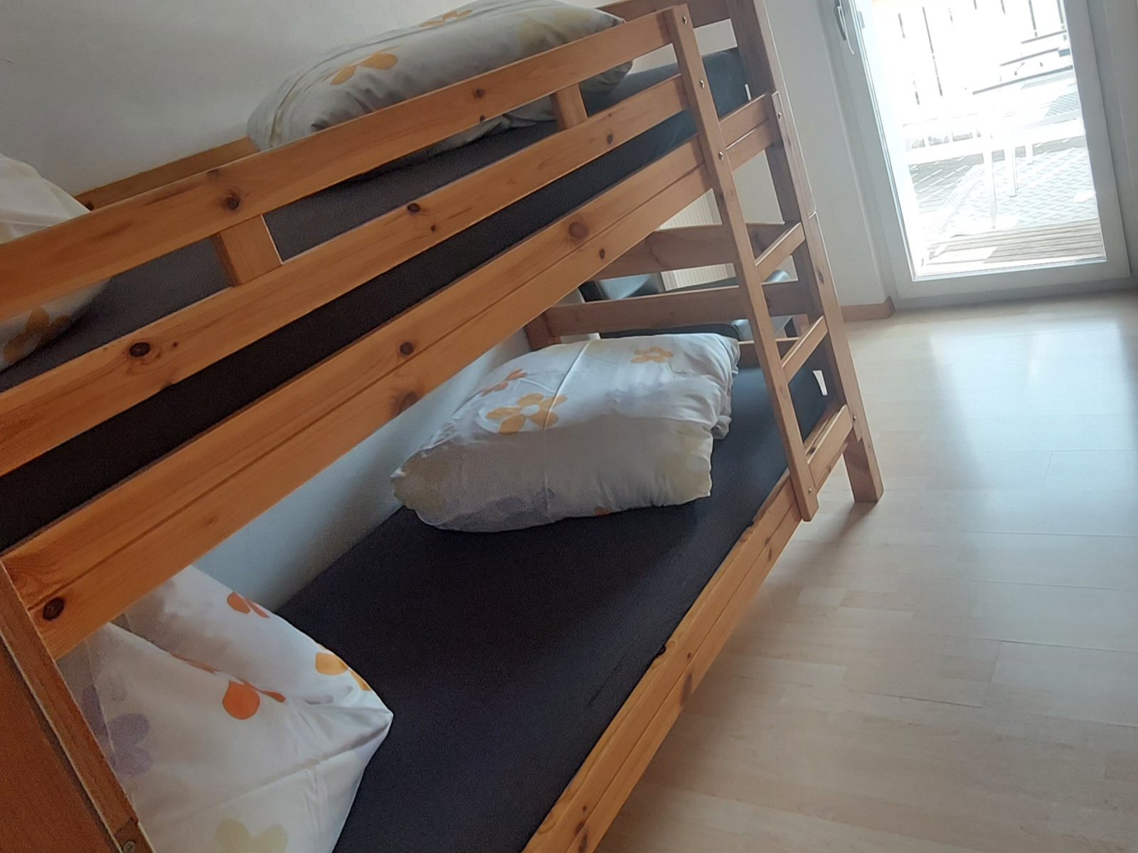 3 Schlafzimmer: Zwei Schlafzimmer mit Doppelbett 160x200cm und Kleiderschrank. Im Schlafzimmer mit Kajüten Bett hat es einen sonnigen, überdeckten Balkon. Bettwäsche vorhanden und im Preis nicht inbegriffen. Wohnzimmer:
