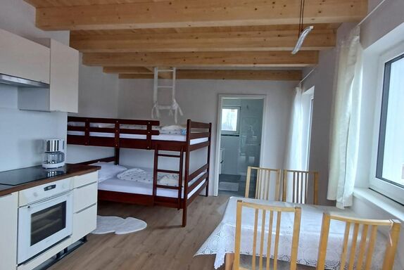 Die Wohnung verfügt über eine voll ausgestattete Küche, ein breites Stockbett mit Platz für 4 Personen und darüber eine Galerie, unsere geliebte Sternenhöhle, die als Matratzenlager dient.