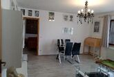 Im Wohnzimmer stehen eine Doppel-Schlaf-Couch mit Couchtisch, Fernseher, ein Esstisch mit Stühlen sowie ein kleiner Schreibsekretär.