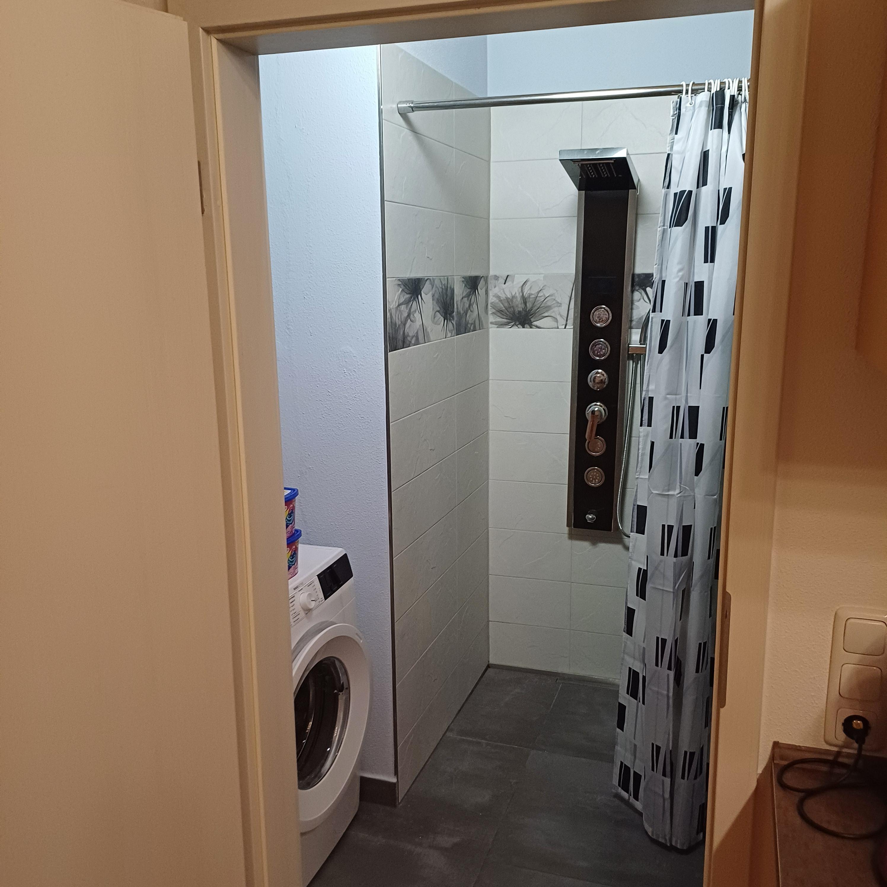 mit begehbarer Dusche, Schminkbereich, Toilette, Waschmaschine und Wäschetrockner.