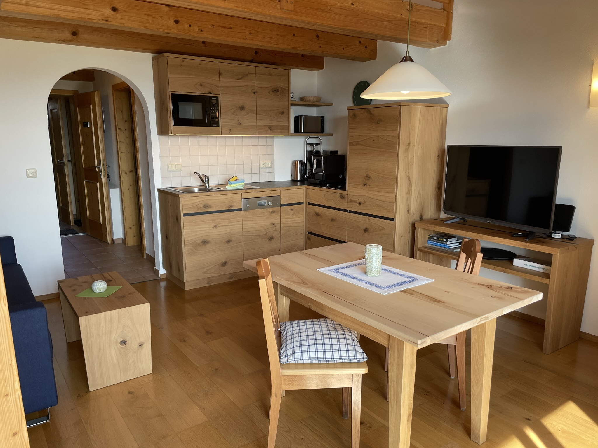 Die etwa 40 qm große Ferienwohnung ist durch eine Schlafgalerie räumlich getrennt und befindet sich im 2. Stock des See Cafe Toni, ein einzelstehendes Landhaus am Nordufer des Chiemsees mit Blick über die Schafwaschener Bucht und die Chiemgauer Alpenkette.