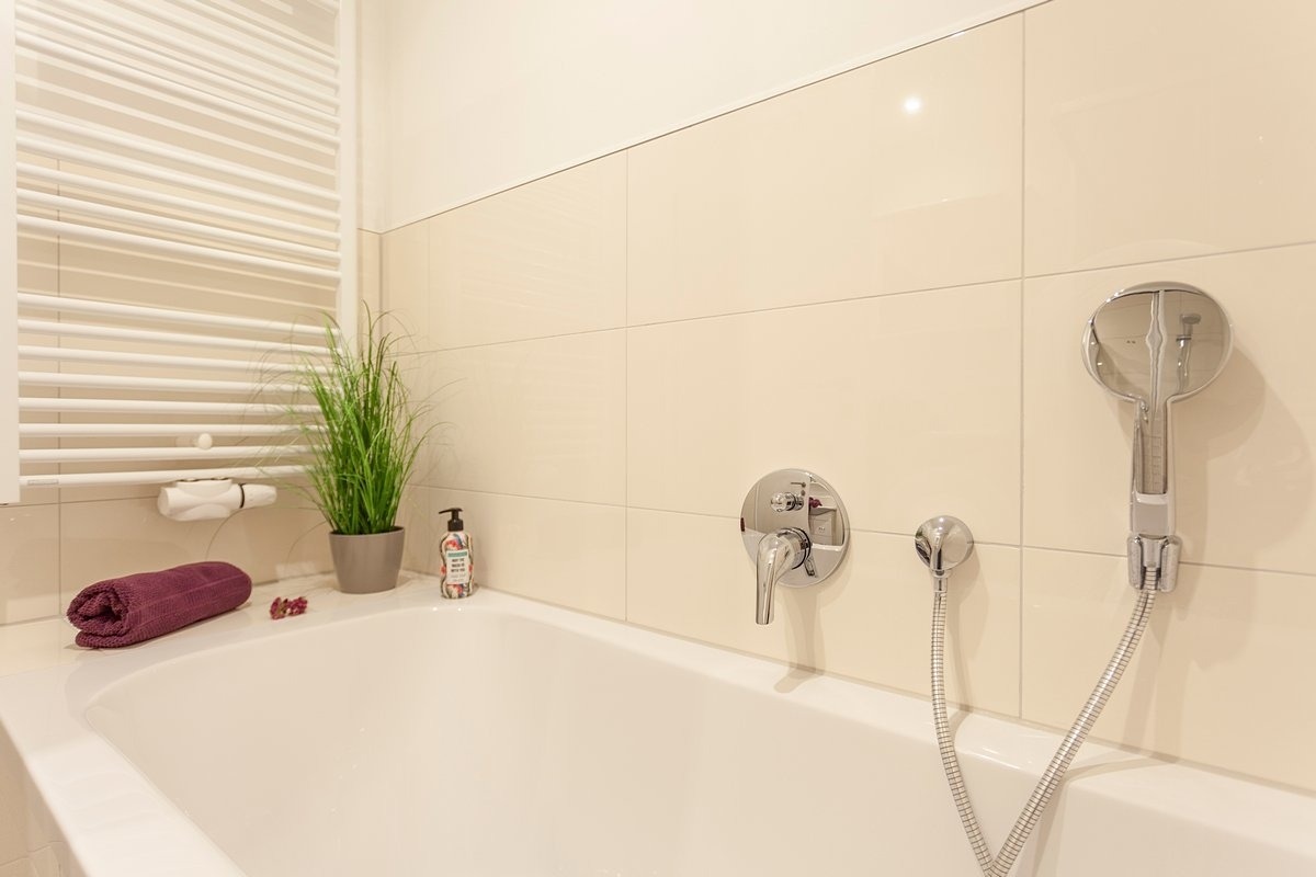 Das Schlafzimmer ist mit einem gemütlichen Bett (1,80 x 2,00) und das Wohnzimmer mit einem Schlafsofa (Liegefläche ca. 1,40 x 2,00) ausgestattet. Das moderne Badezimmer verfügt über eine Dusche, eine Badewanne, ein WC, Waschbecken, Regal, Spiegelschrank und Haartrockner.