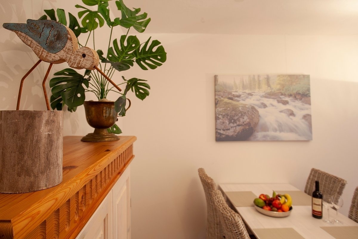 Die Wohnung begrüßt Sie mit einer hochwertigen, modernen und offenen Küche mit Kühlschrank, Backofen, Spülmaschine, Kaffeemaschine usw. Entspannen können Sie im gemütlichen Wohn- Essbereich und Blick auf die Pferdekoppeln. Neben einem TV im Wohn- und Schlafbereich steht Ihnen ein Gast WLAN-Zugang zur Verfügung.