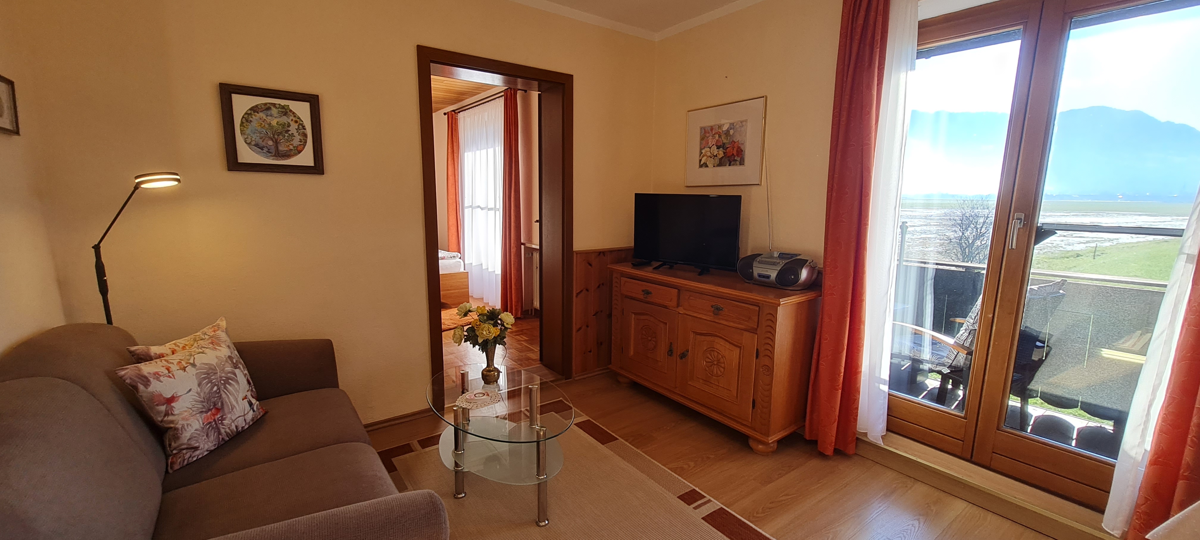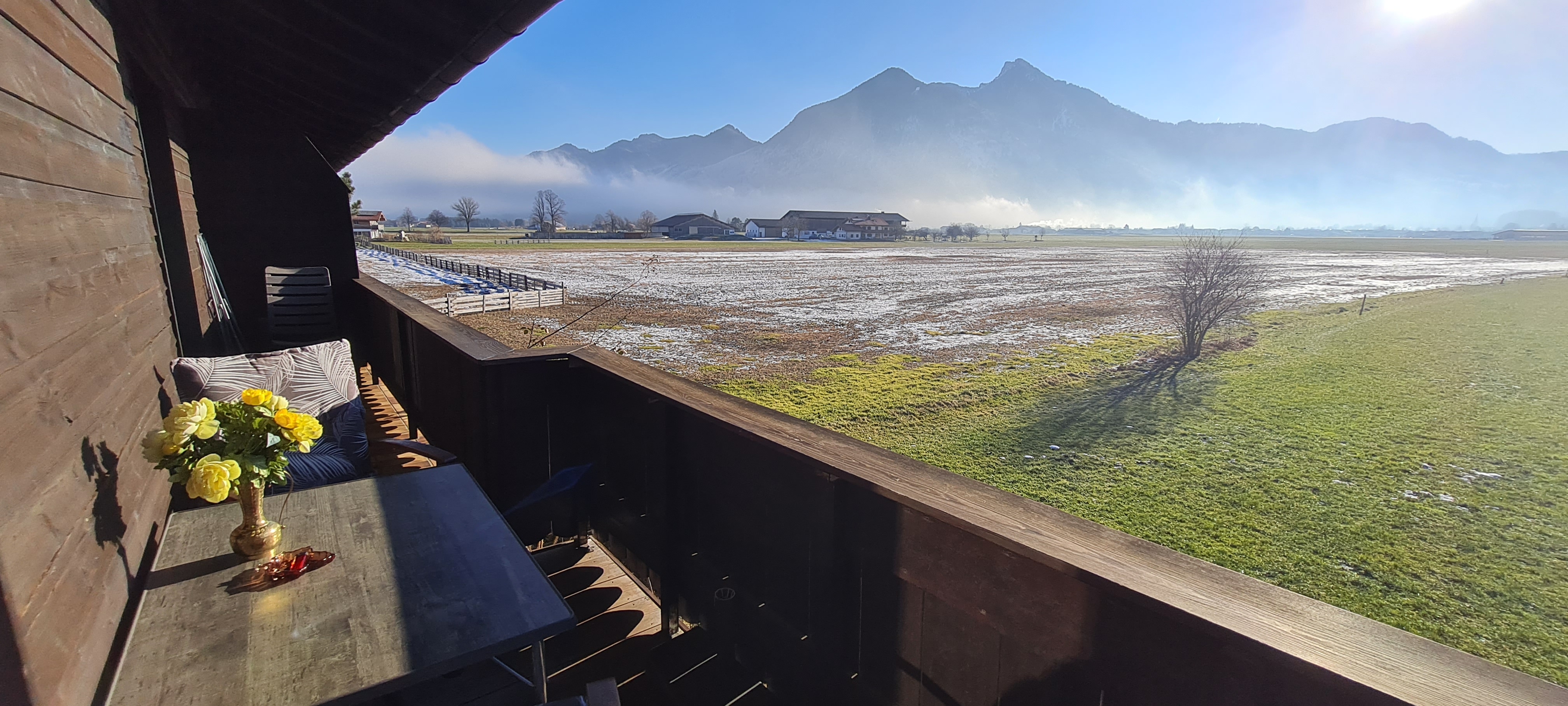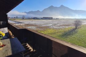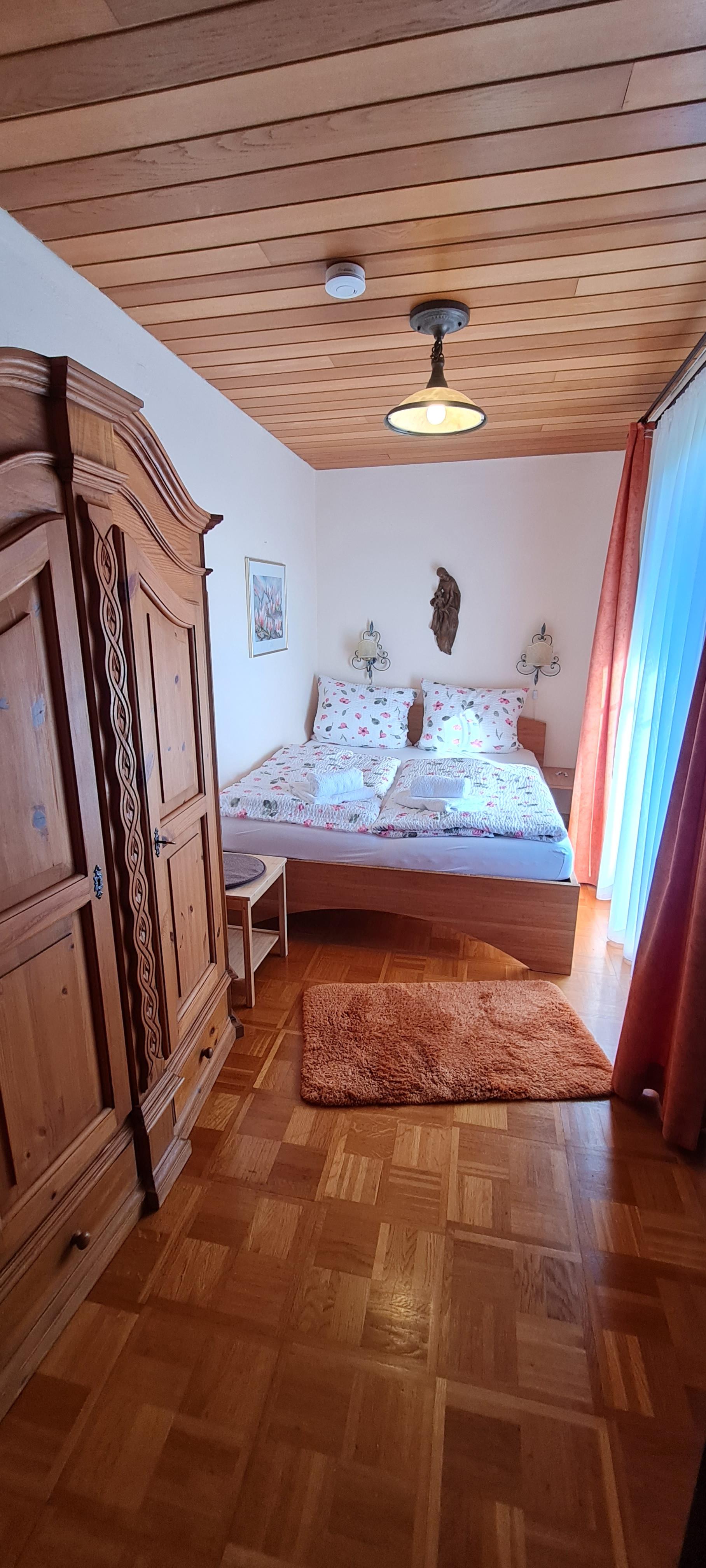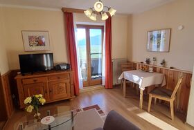 Sehr ruhig gelegene, gemütliche Ferienwohnung mit kleiner, separater Küche, ausgestattet mit neuer Einbauküche, Cerankochfeld mit Backofen und Kühlschrank mit Gefrierfach, gemütliches Wohnzimmer mit Couch und neuem Fernseher mit SAT-TV Anschluss und Zugang zum Südbalkon mit traumhaft freiem Bergblick über Wiesen und Felder. Separates Schlafzimmer mit einem 160x200cm großen Doppelbett für 2 Personen. Neues Badezimmer mit Dusche und WC. WLAN kostenlos.